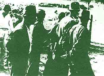 Jasenovac su ustaše, po uzoru na njemačke koncentracione logore, pretvorile u najveće stratište naših naroda. — Kozarčani pred logorskom kapijom, jula 1942. (Gore desno)