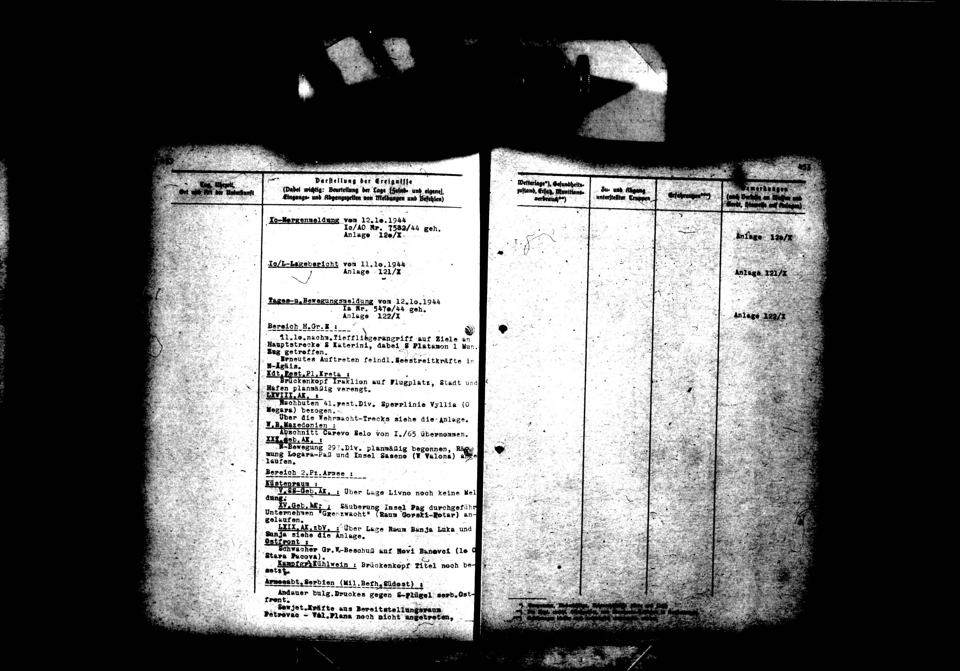 la, Ic, Anlagenband 1 z. KTB Nr. 3 OB Sudost. 1944-07-15 - Daily la reports relating to tactical ground, sea, and air operations and situations, coastal defense, reenforcement of Crete and combating partisans by H.Gr. F units in Albania, Greece, and Yugoslavia. Daily Ic reports concerning enemy movements and tactical ground, sea, and air operations and situations in OB Sudost sector. Reports on inspection of H.Gr. F coastal artillery units and experience gained during assembly of troops in combat area. Notes on staff conferences dealing with the military and political situation on all fronts. Information concerning Operations Adler, Maibaum, and Steinadler (action against partisan units). Also, daily weather reports. Jul 1 - 15, 1944,, July 01, 1944 - July 15, 1944613
