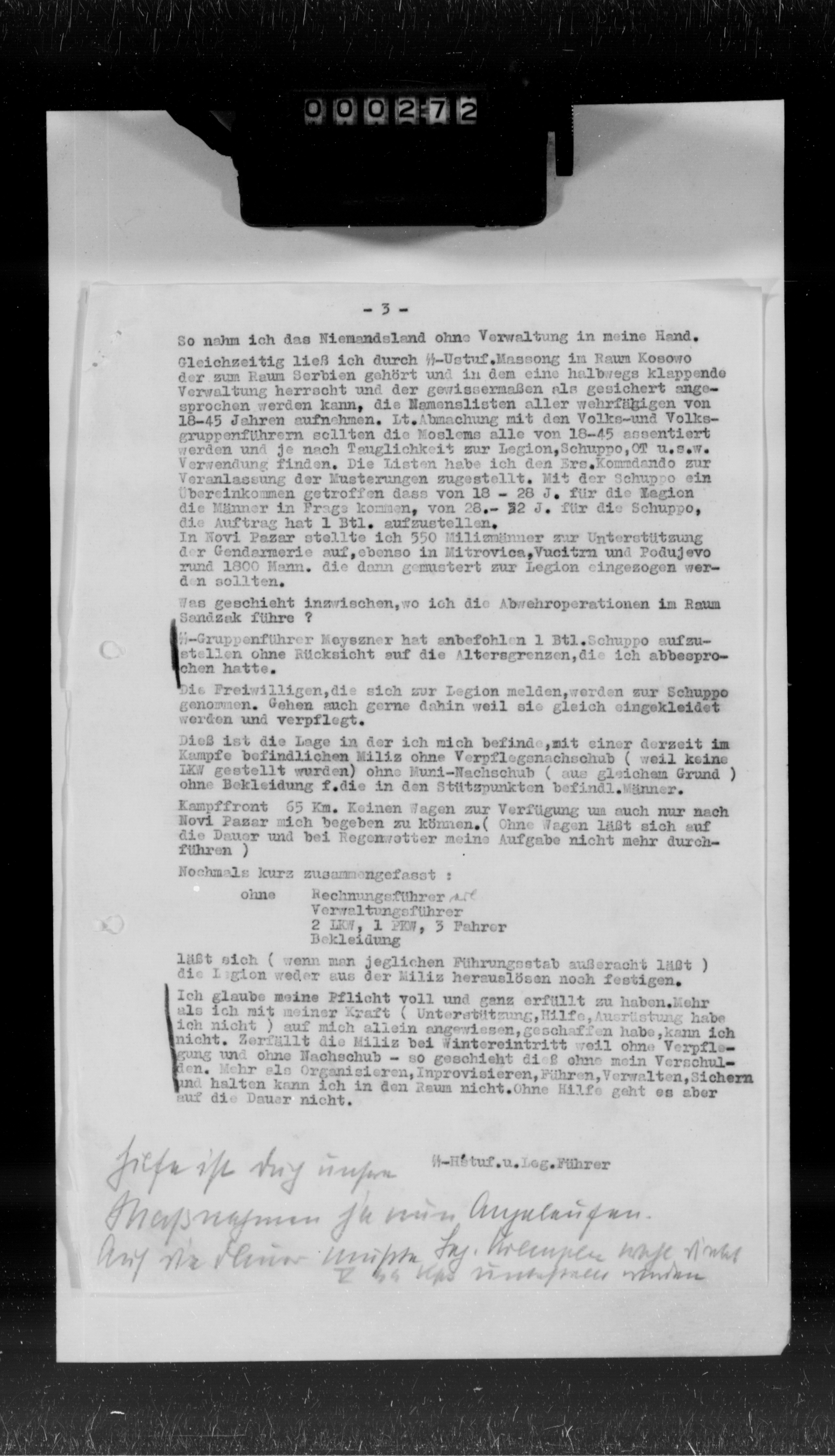 SS-Hauptsturmführer und Legionführer (Krempler) an Kampfgruppe Pfeiffer, Feindlage nörd. Sjenica 8.11.43