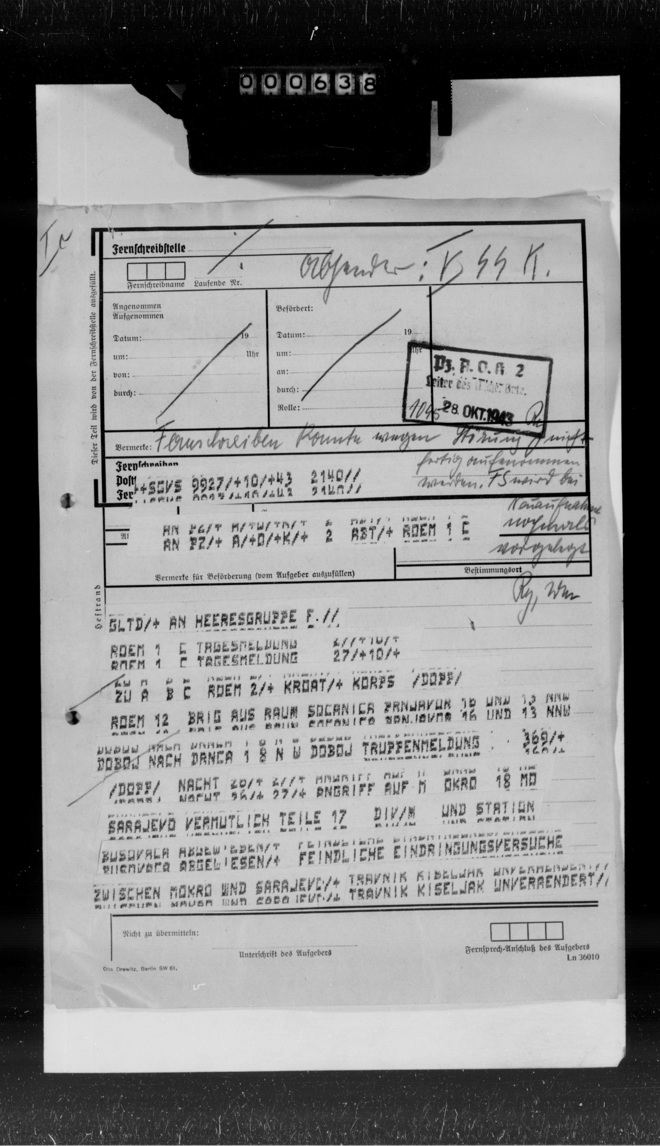 - Večernji izveštaj obaveštajnog odeljenja komande, 2.11.43: Nastavljene sabotaže na pruzi Brod - Sarajevo. Zenica ugrožena sa j. i z. od jake komunističke bande (verovatno delovi 1. divizije). Napad komun. bande 15 s-i od Sarajeva odbijen (verovatno delovi 17. div.). Uporan komunistički otpor na Pelješcu, koncentrisanje (20. div. iz oblasti severno od Splita) u cilju podrške napadu 26. div. (Podgora) na Makarsku. Prema sigurnom izvoru obezbeđivanje savezničke baze za snabdevanje na Visu. Od strane Amerikanaca tamo dopremljeno 10.000 pušaka i 20.000 uniformi, namerava se dalje snabdevanje... Komunistički napad na Posušje odbijen... Prema sigurnom izvoru, kod 6. komun. korpusa (Slavonija) 13 Britanaca., November 02, 1943 - November 02, 1943
