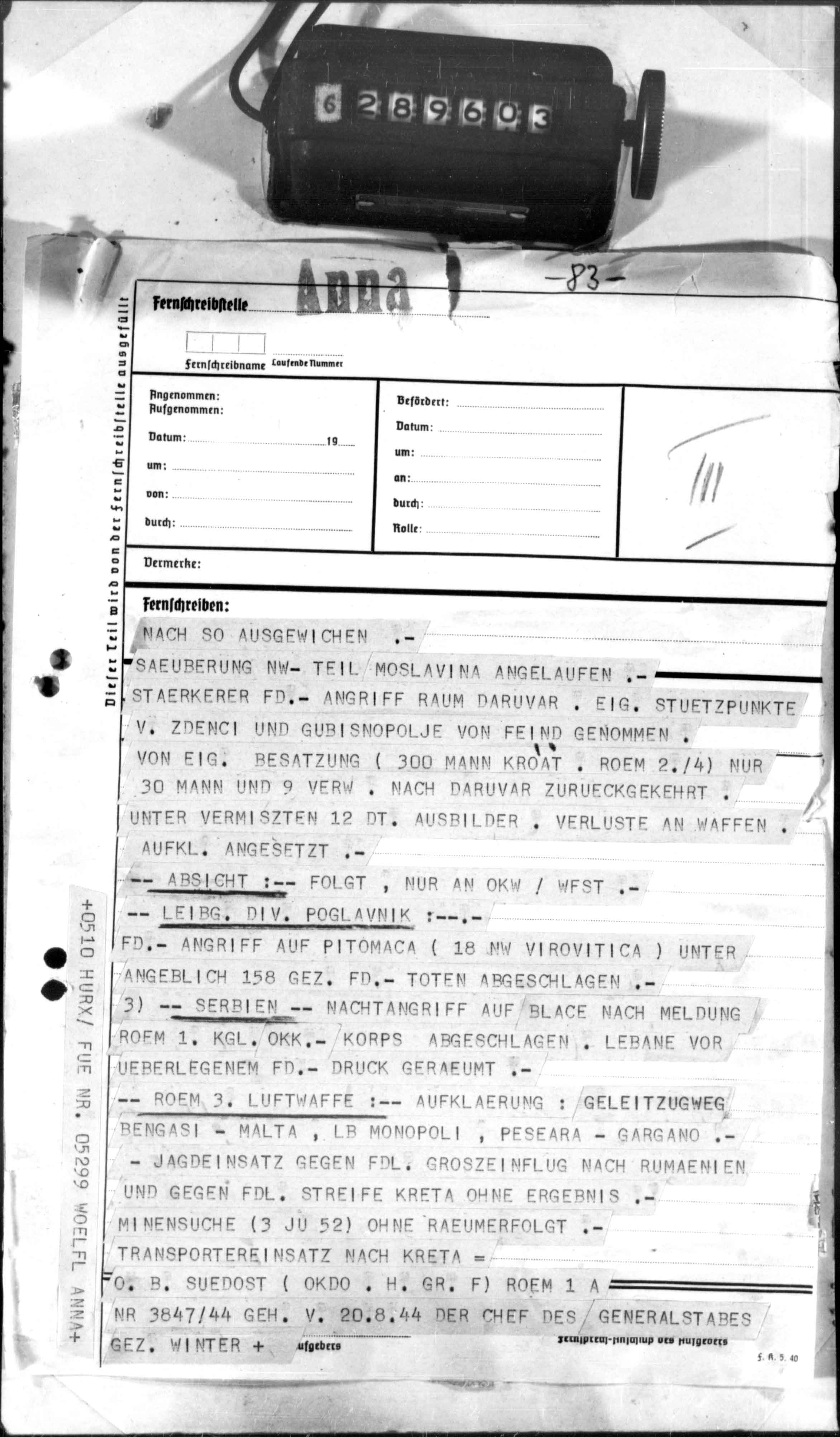 Tagesmeldung OBSO (OBKDO H GR F) 3.8.44: - Operacije Weihe, Bussard; neprijatelj koji je prodro u Debar borbom odbačen; neprijateljski napad južno od Novog Pazara čini neophodnim upotrebu 1. Geb.Div. u dolini Ibra, Operacije Sonnenstich, Röslein, Windei; Vrbovsko zauzeto uz neprijateljski otpor; odbijen jak napad na mesta i komunikaciju Ripac-Petrovac-Drvar; sabotaže na železnici, November 30, -0001 - November 30, -0001 | 6289494 |