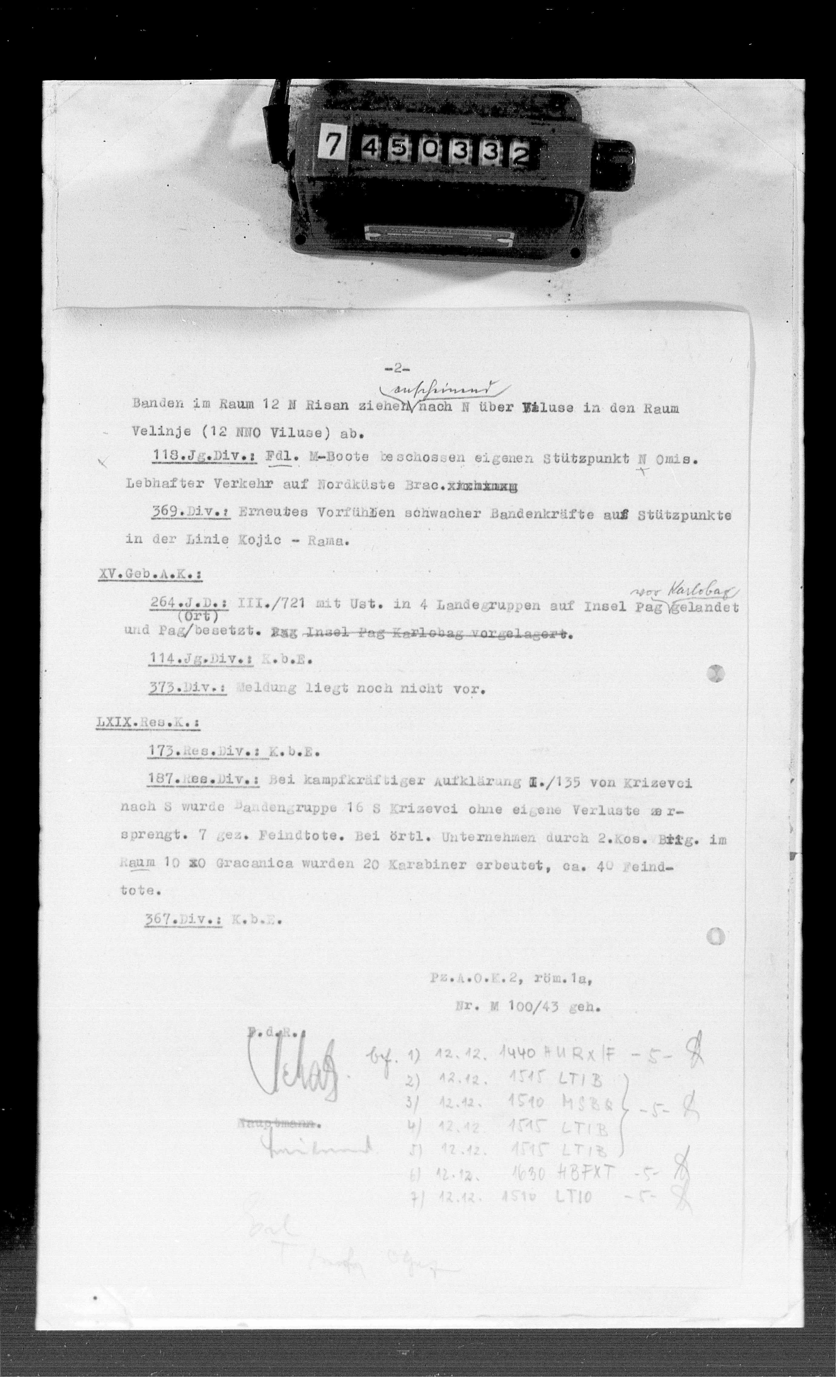 Dnevni izvještaj 5. SS GebKor (23.12.43) - Gubici na Korčuli: 10 KIA, 40 WIA, 1 MIA; 2 aviona; 3 plovila oštećena; gubici spasilačke ekipe poslane za kap. Kirschnerom: 4 KIA, 29 MIA., November 30, -0001 - November 30, -0001 | 7450001 |