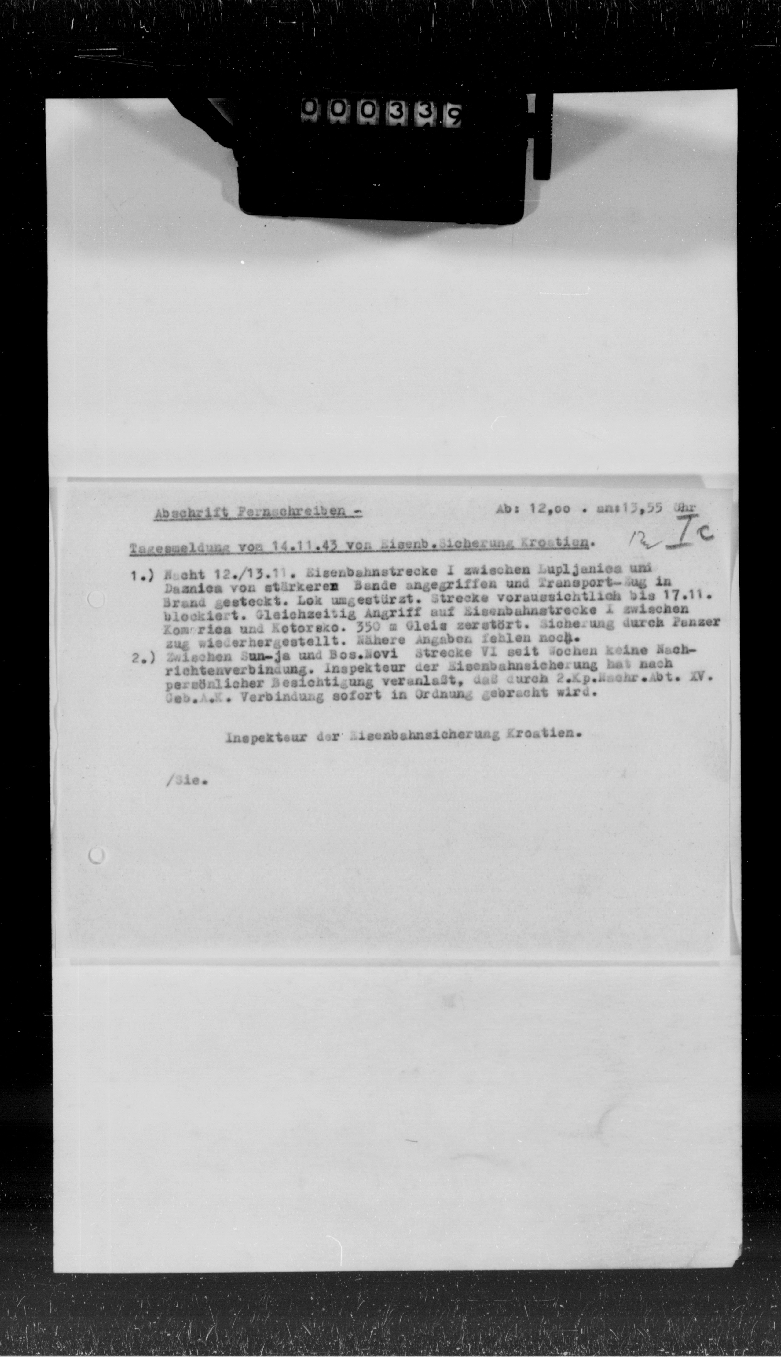 - Štab za obezbeđenje železnice Hrvatska, dnevni izveštaj od 14.11.43. Noću 12/13 železnička pruga 1 između Lupljanice i Daznice našadnuta od jače bande, transportni voz zapaljen. Očekuje se da će pruga ostati blokirana do 17.11. Istovremeno napad na železničku prugu 1 između Komorice i Kotorskog... (frame no. 339)