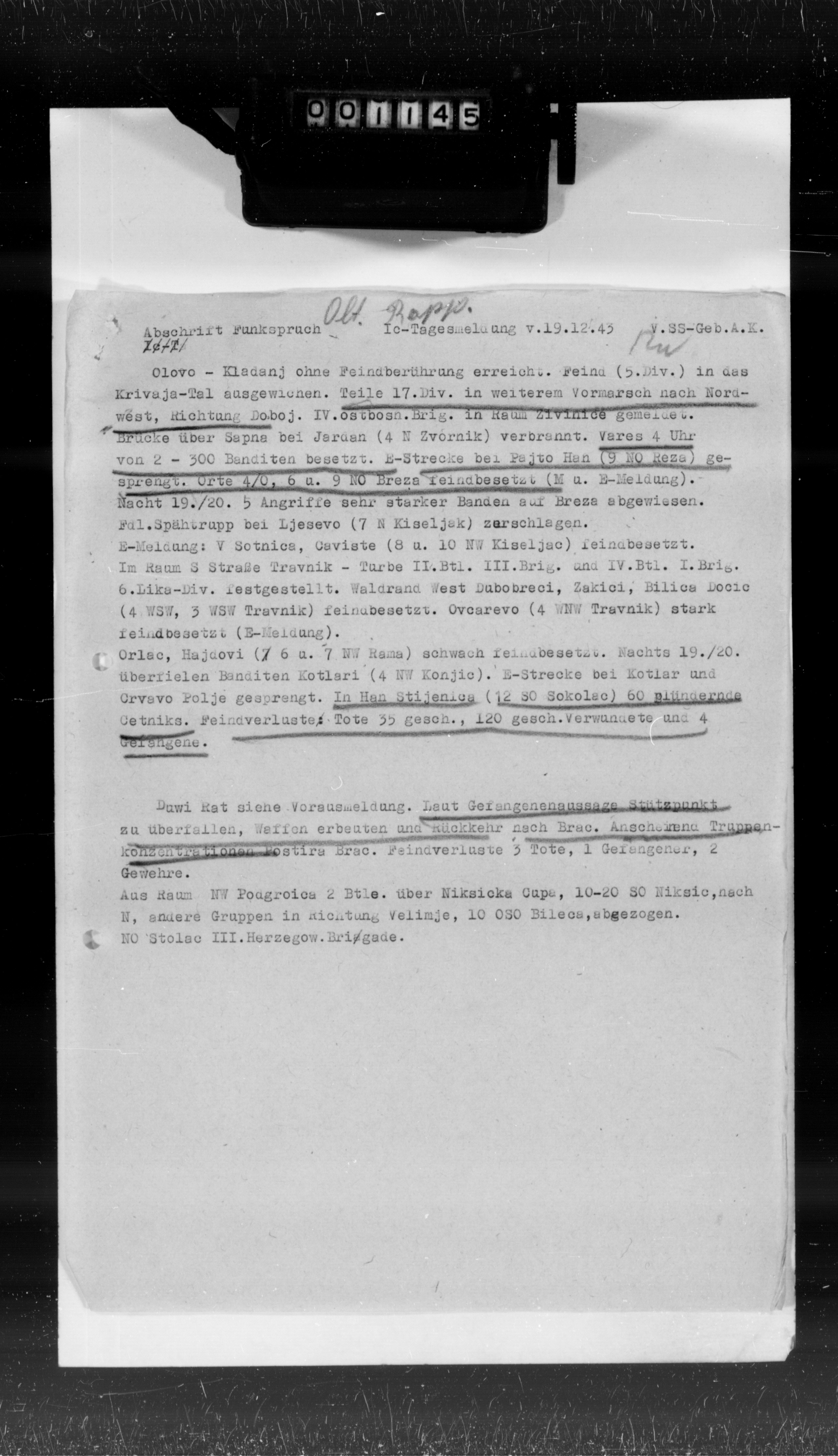 Pz AOK 2 43407/53, Ic, Anlagenband 11 zum Tätigkeitsbericht - Radio messages and daily reports relating to combat situation, enemy activities and partisan warfare, December 11, 1943 - December 20, 1943