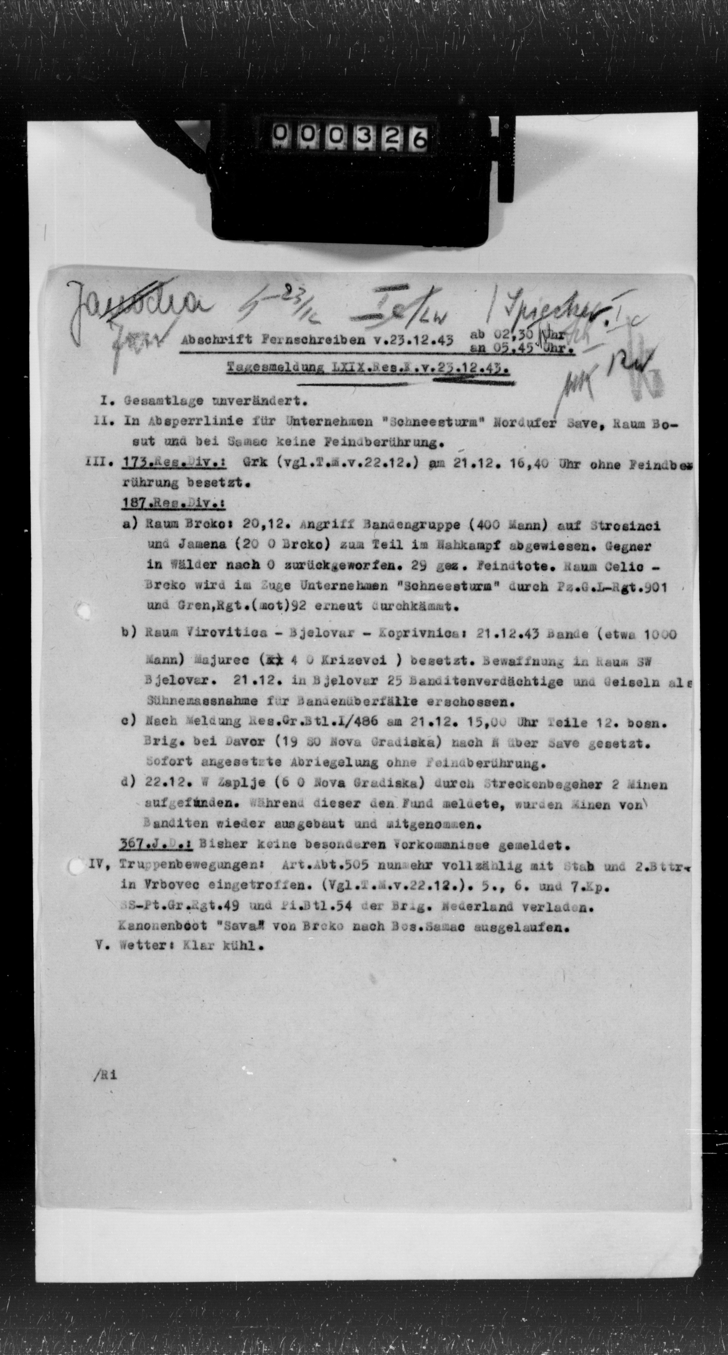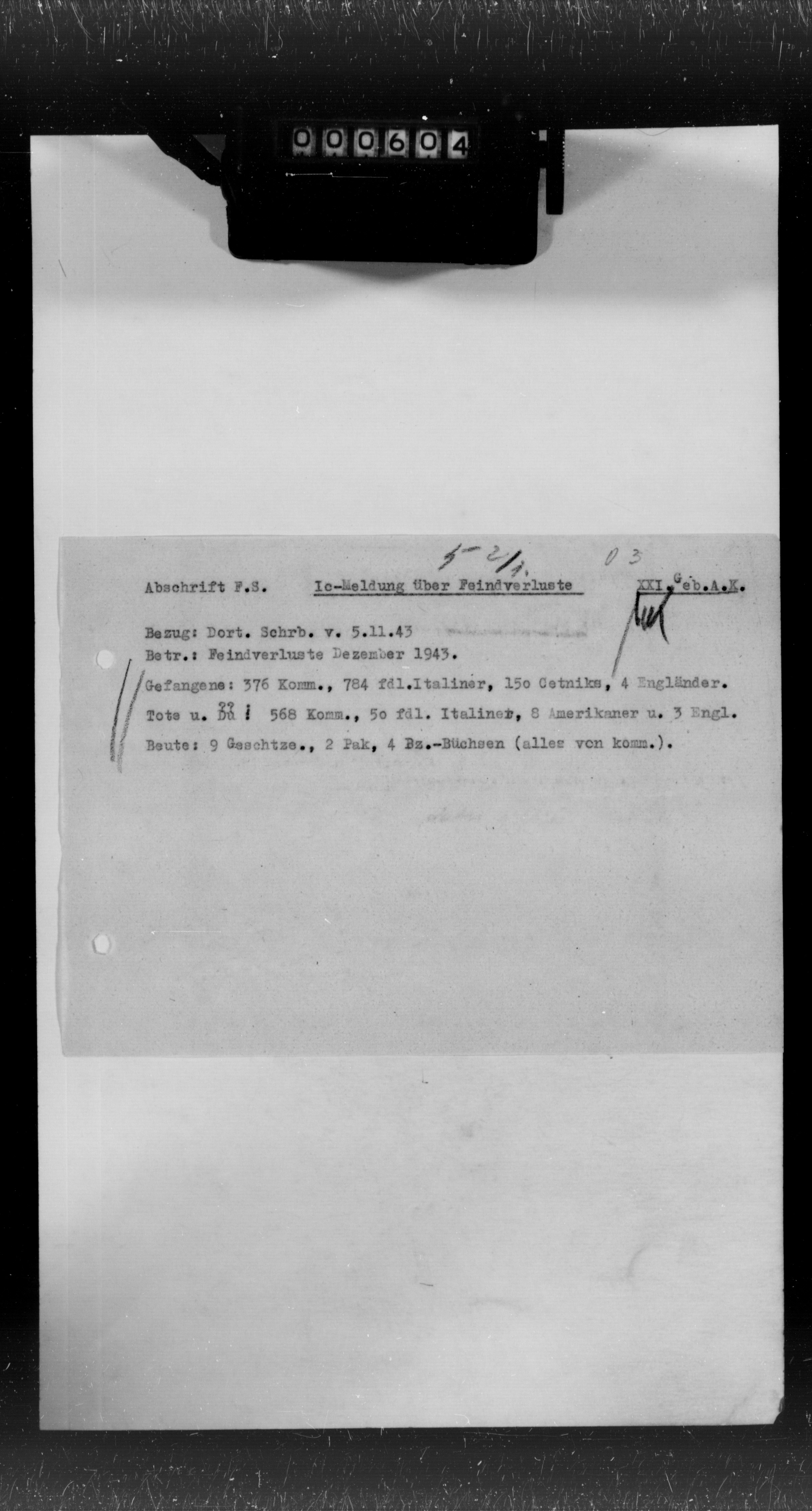 Pz AOK 2 43407/54, Ic, Anlagenband 12 zum Tätigkeitsbericht - Radio messages and daily reports relating to combat situation, enemy activities and partisan warfare, December 21, 1943 - December 31, 1943