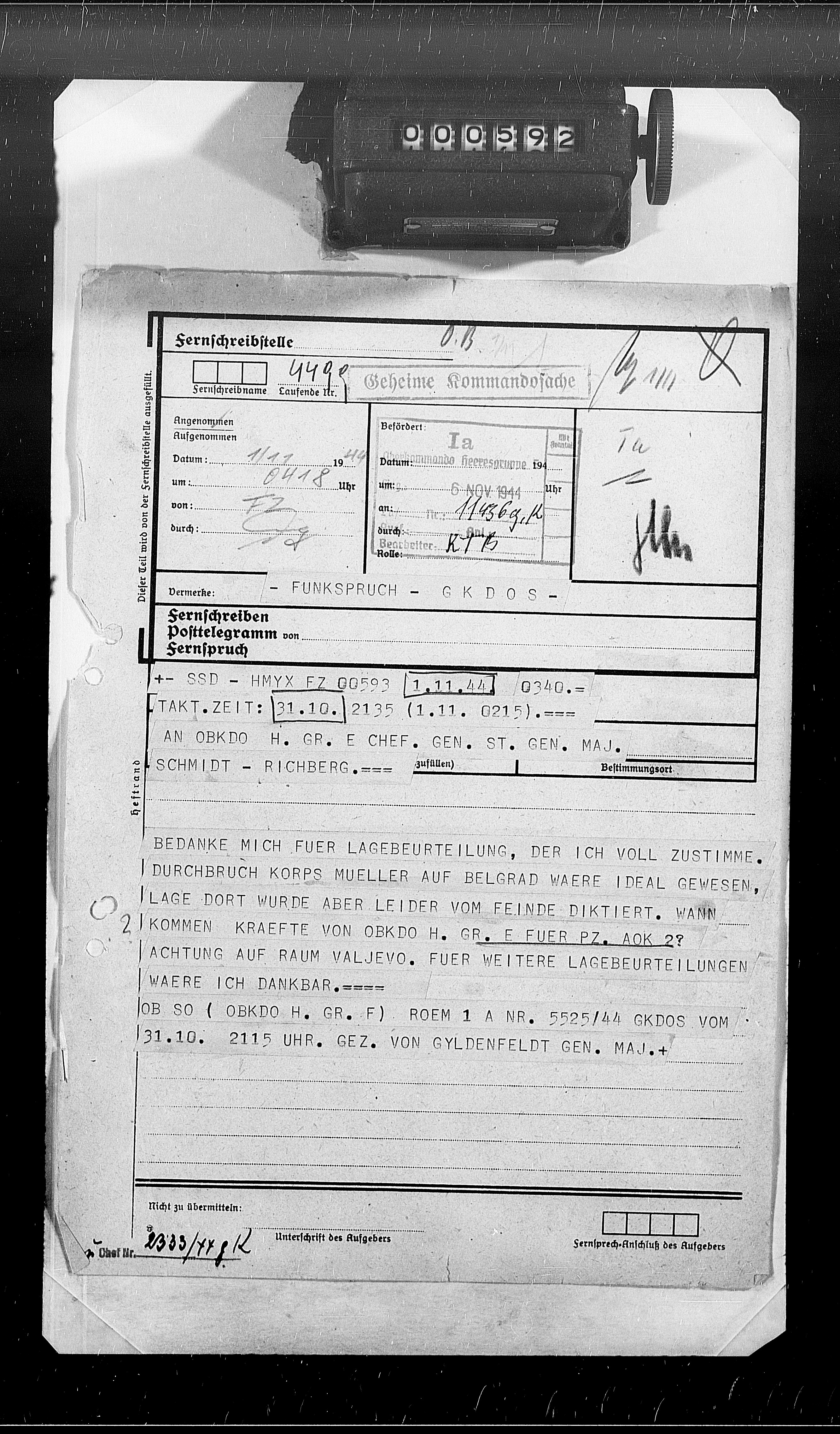 la, Ic, Anlagenband z. KTB. 1944-12-22 - Orders, reports, and correspondence pertaining to defensive ground, sea, and air missions, operations, and situations, security, maintenance, and destruction of roads and bridges; and combating partisans by H.Gr. E units in Albania, Greece, and Yugoslavia; also, the withdrawal of German forces from Albania and Greece, and enemy losses, troop identification, and tactical ground, sea, and air operations and situations in OB Siidost sector. Overlays (1:50,000; 500,0005 and 1,500,000 showing the disposition of Russian Army units in Hungary, the location of withdrawal movements in Albania, Greece, and Yugoslavia, and road conditions in Yugoslavia. Order of battle data covering H.Gr. E units and Russian Army units. Notes on staff conferences concerning matters such as conduct of battle, withdrawal movements, march discipline, and Tito*s forces. Notes on Gruppe Ic conference with Major Jevdjenigenic, Chief of Staff of Draza Mihailovic forces, regarding cooperation with German Army units in combating Tito*s communist forces in Yugoslavia. Information pertaining to the demobilization of EDES and ELAS units in Greece by Greek Government forces. Daily activity reports of Küstenjager Abt. Brandenburg for Nov 1944. Nov 1 - Dec 22, 1944, November 01, 1944 - December 22, 1944