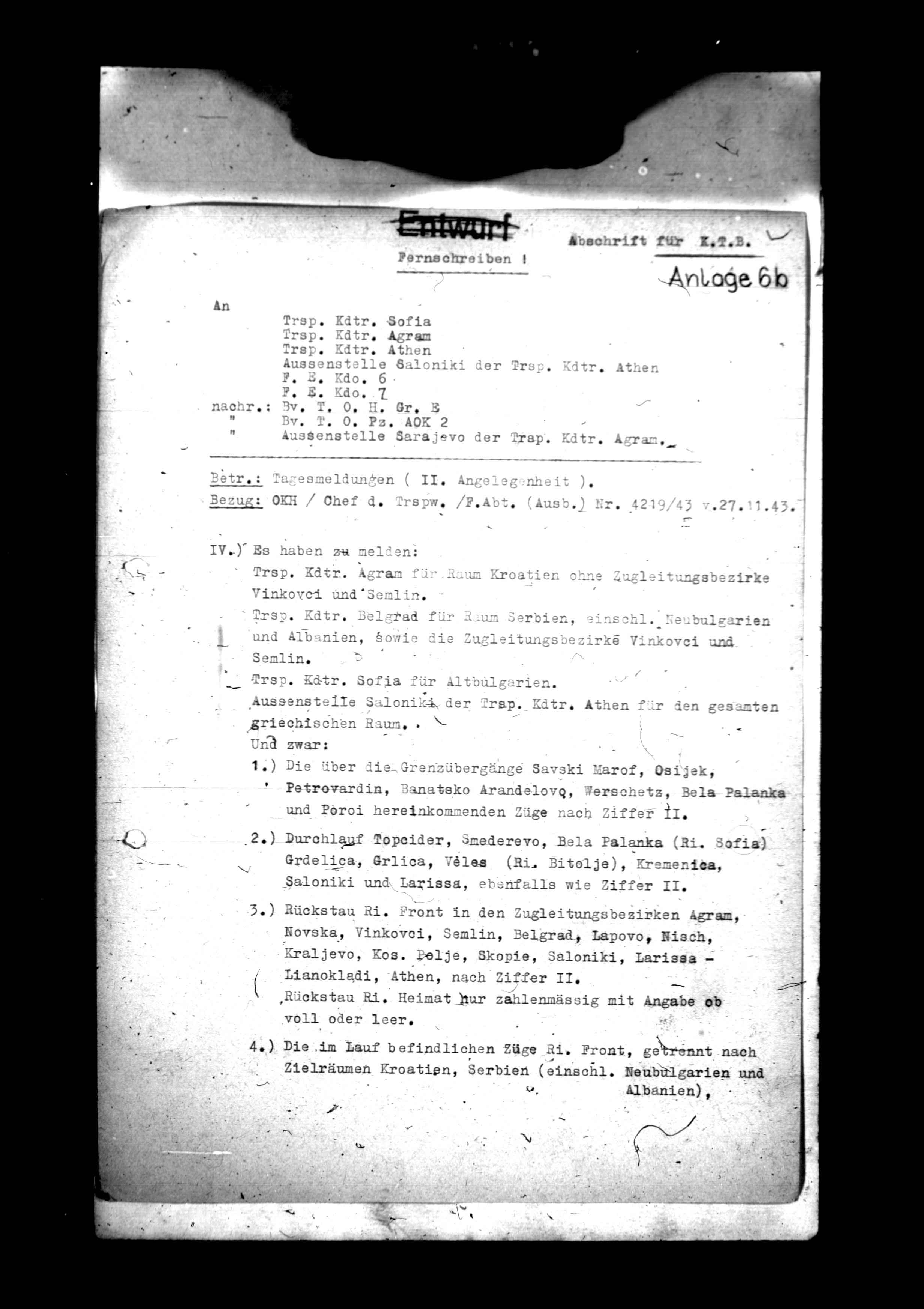 41982 Gen.d.Trspw., Tätigkeitsbericht. - Activity report pertaining to railroad traffic and transportation situation in Albania, Serbia, Greece, Croatia, Hungary, Rumania, and Bulgaria; photographs showing destroyed railroad bridges; maps (1:100,000) showing damaged railroad facilities and location of railroad operating troops., August 26, 1943 - December 31, 1943