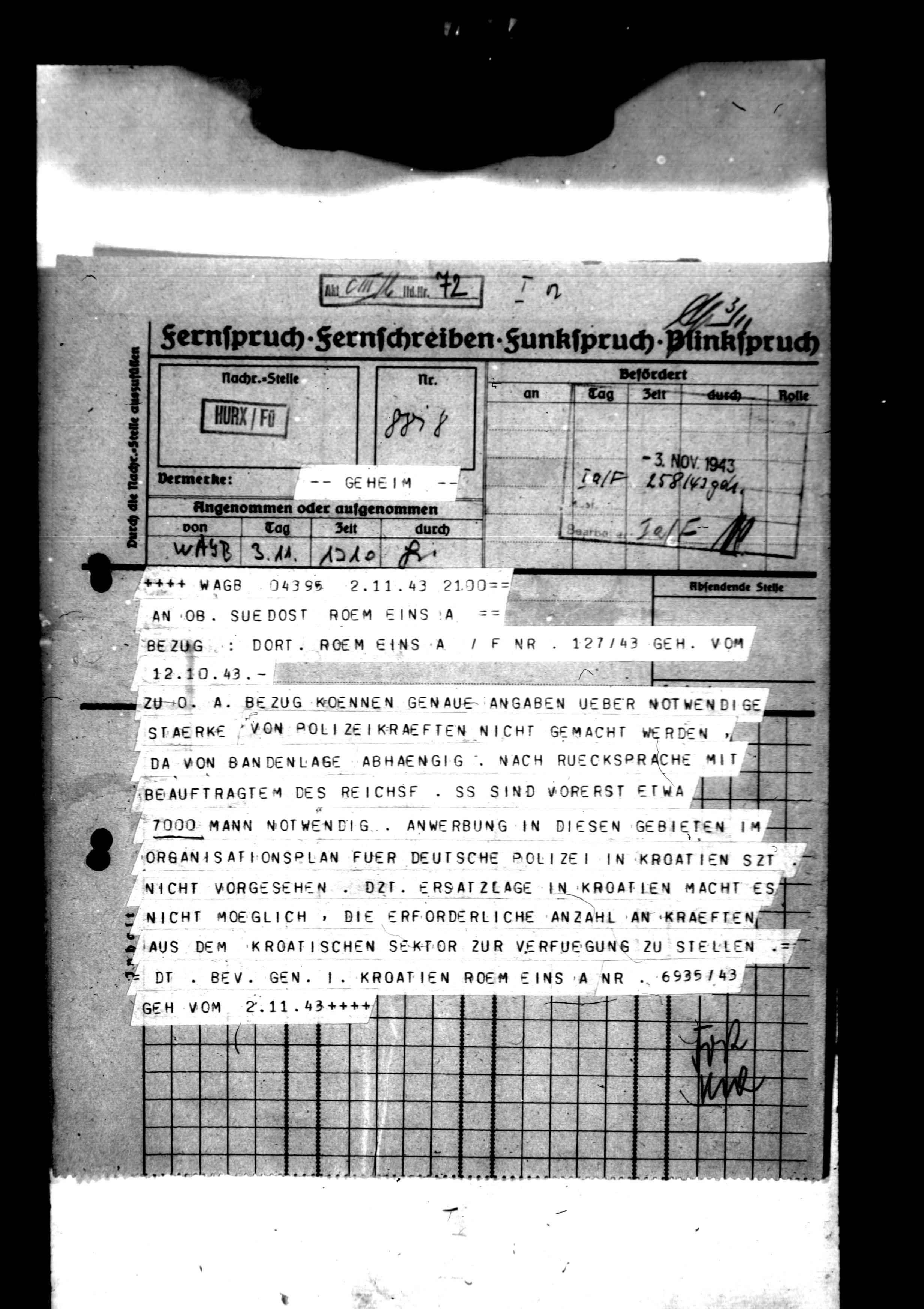 65569 Ic/A.O., Anlagenband z. KTB des OB Südost. - Ic/A.O., Anlagenband z. KTB des OB Südost. Reports and correspondence concerning courtmartial proceedings against a Croatian Army captain for giving defense plans for the city of Agram to partisans; reports on Croatians and others serving in the German Army who have deserted; reports of attempts by the Greek partisans to lure German personnel to desert; reports on the political situation in Salonika; and charts showing the utilization of carrier pigeons in Crete and other areas in southeast Europe., April 14, 1944 - December 31, 1944