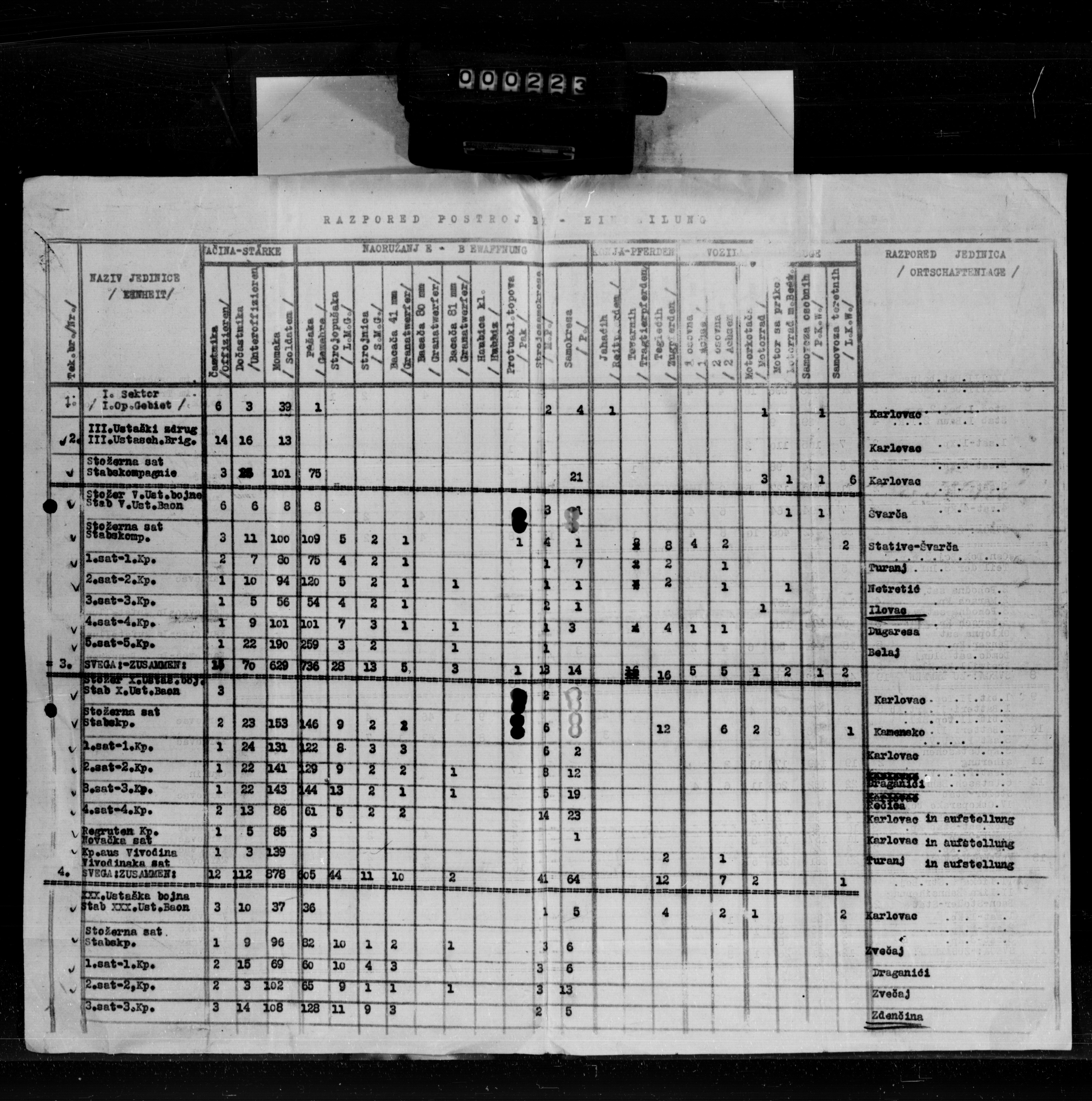 - Generalkommando XV G.A.K: Ic Lagebericht 27.9.43: a) Kommunisten. In Ostbosnien hat sich die Lage nördlich der Linie ZVORNIK-TUZLA-DOBOJ durch die Verlegung des I.bosn.Korps nach Mittelbosnien in den Raum NO DOBOJ verschärft. Die gleichzeitige Mitführung der 12.D?V. (III-Kraj. u. Teile der V.Kozara-Brig.) hat den Anstoss zu grösseren Unternehmungen gegeben. GRACANTCA wurde eingenommen, durch Zerstörung der südl. davon führenden Eisenbahnbrücke die Verbindung nach TUZLA unterbrochen. Die 17.ostbos.Div.(VI.ostbos.,I.u.II, Majevica Brig.) bedroht BRCKO. Die 16.Div. bestehend aus 3 Vojvodiner Brig. ist aus dem Raum VLASENICA über CAPARDE vorgestossen und hat BIJELJINA eingenommen. Diese Div. wird an dem beabsichtigten Angriff auf BRCKO mitwirken und muss sodann gerechnet werden, dass der erwartete Angriff auf das Industriegebiet von TUZLA erfolgt.