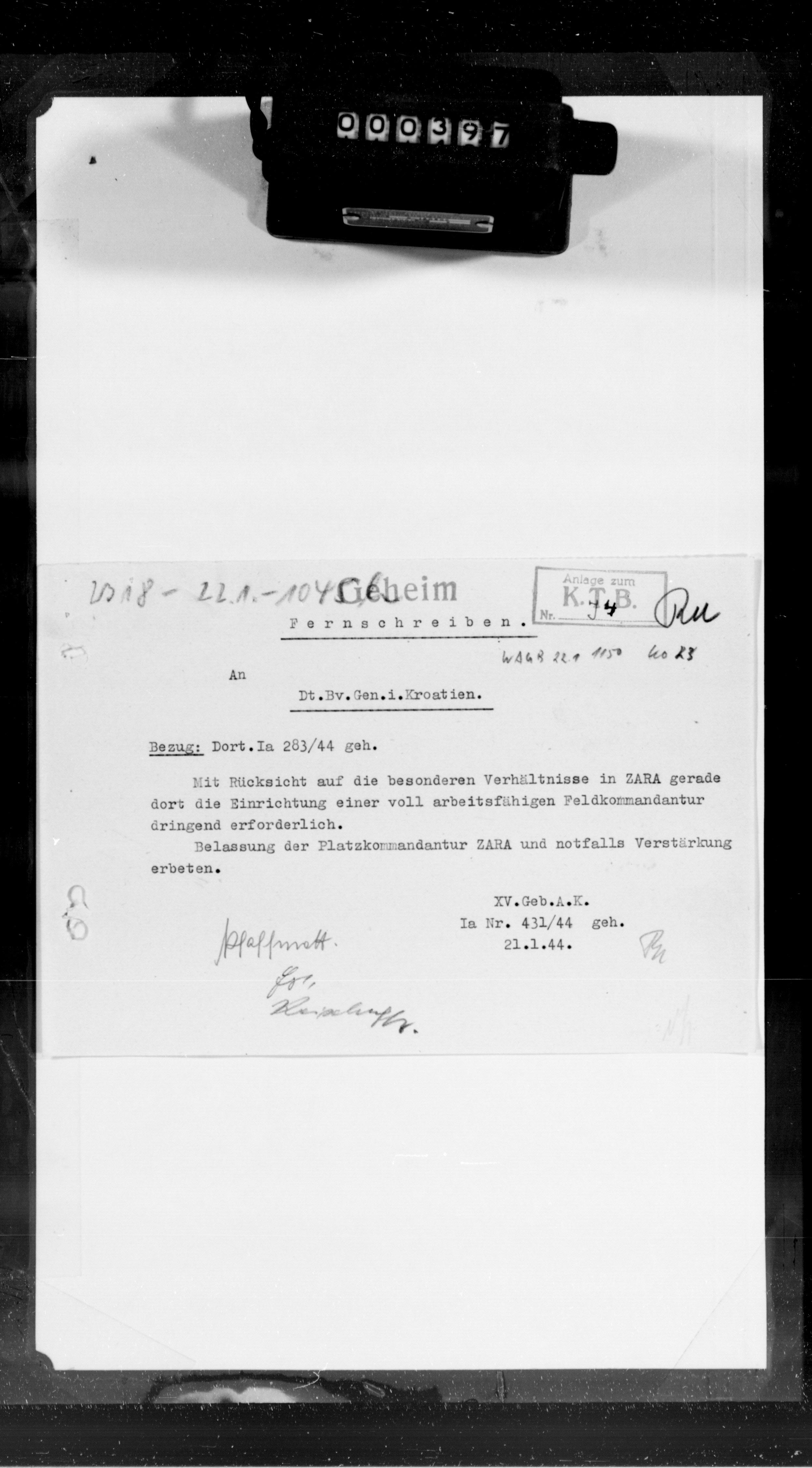 Geb AK XV, 58277/3, KTB Anlagen - Tactical information on operations at Banja Luka, Doboj, Prijedor, Kotor Varos, Solta, Sibenik, and Bosanka Gradiska and plans for future operations on the Dalmatian coastline., January 01, 1944 - January 31, 1944