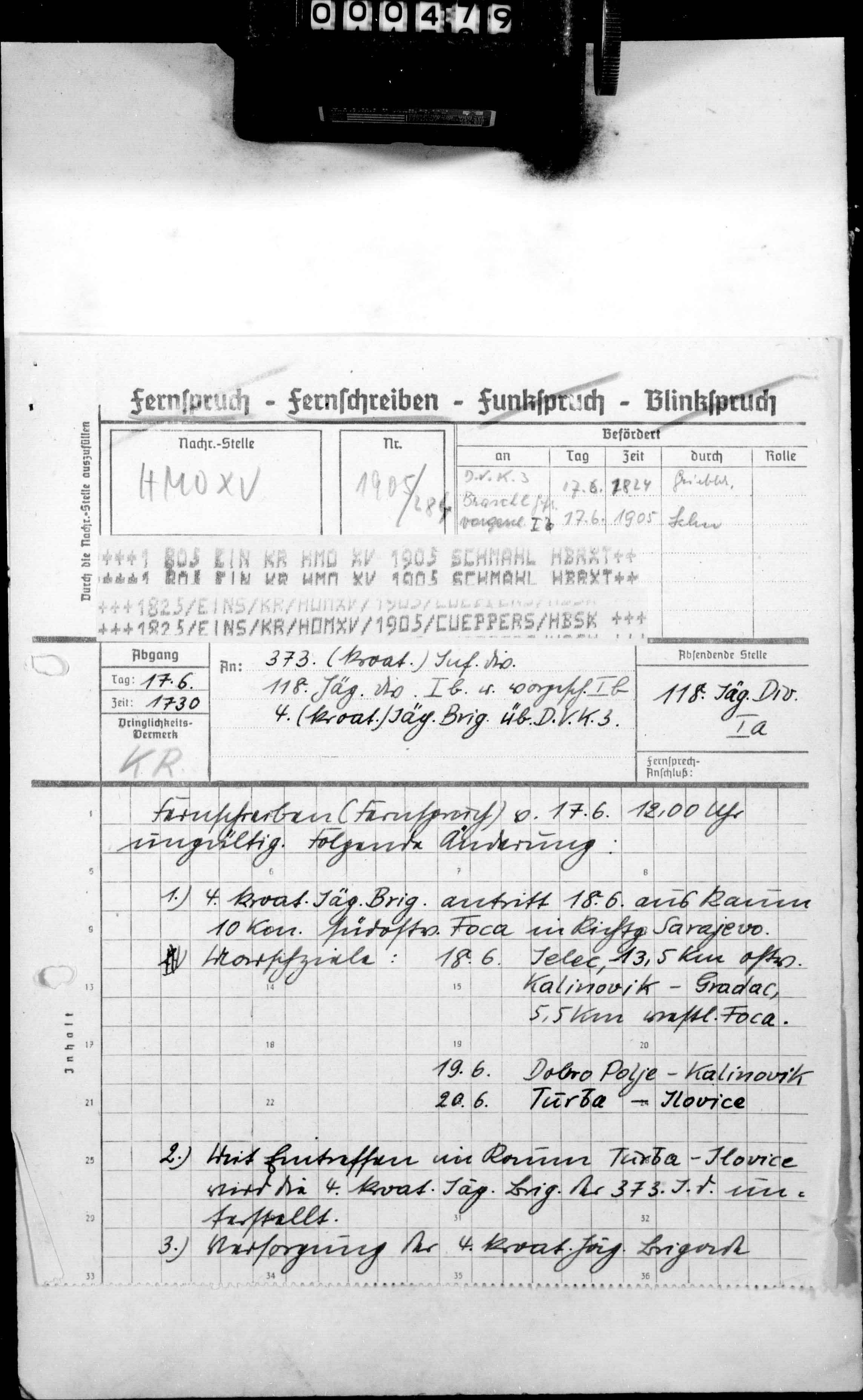 - Naređenje za privođenje svih vojnosposobnih muškaraca iz prostora južno od linije Vrbnica-Beleni-Klinci-Rijeka u logor u Foči na dan 9.6.43; puštati samo one koji mogu dokazati da nemaju baš nikakve veze s partizanima; ostale nadgledati, a Ic će se njima detaljnije pozabaviti; -Bez prestupa i maltretiranja!- [zadnja riječ dopisana olovkom]. (frame no. 208)