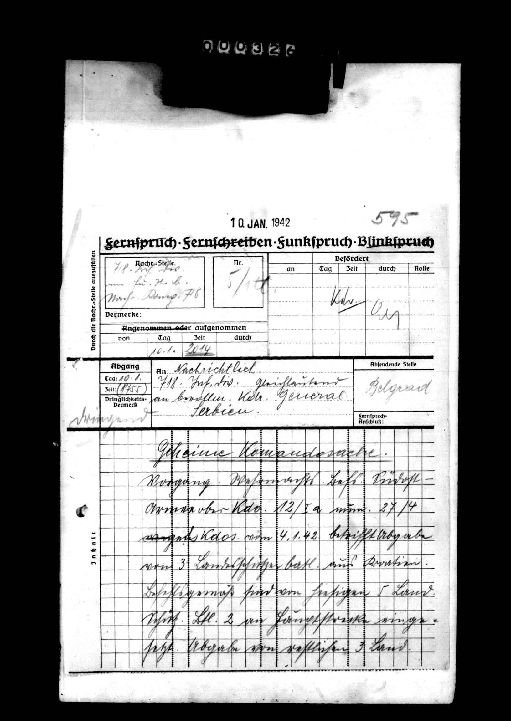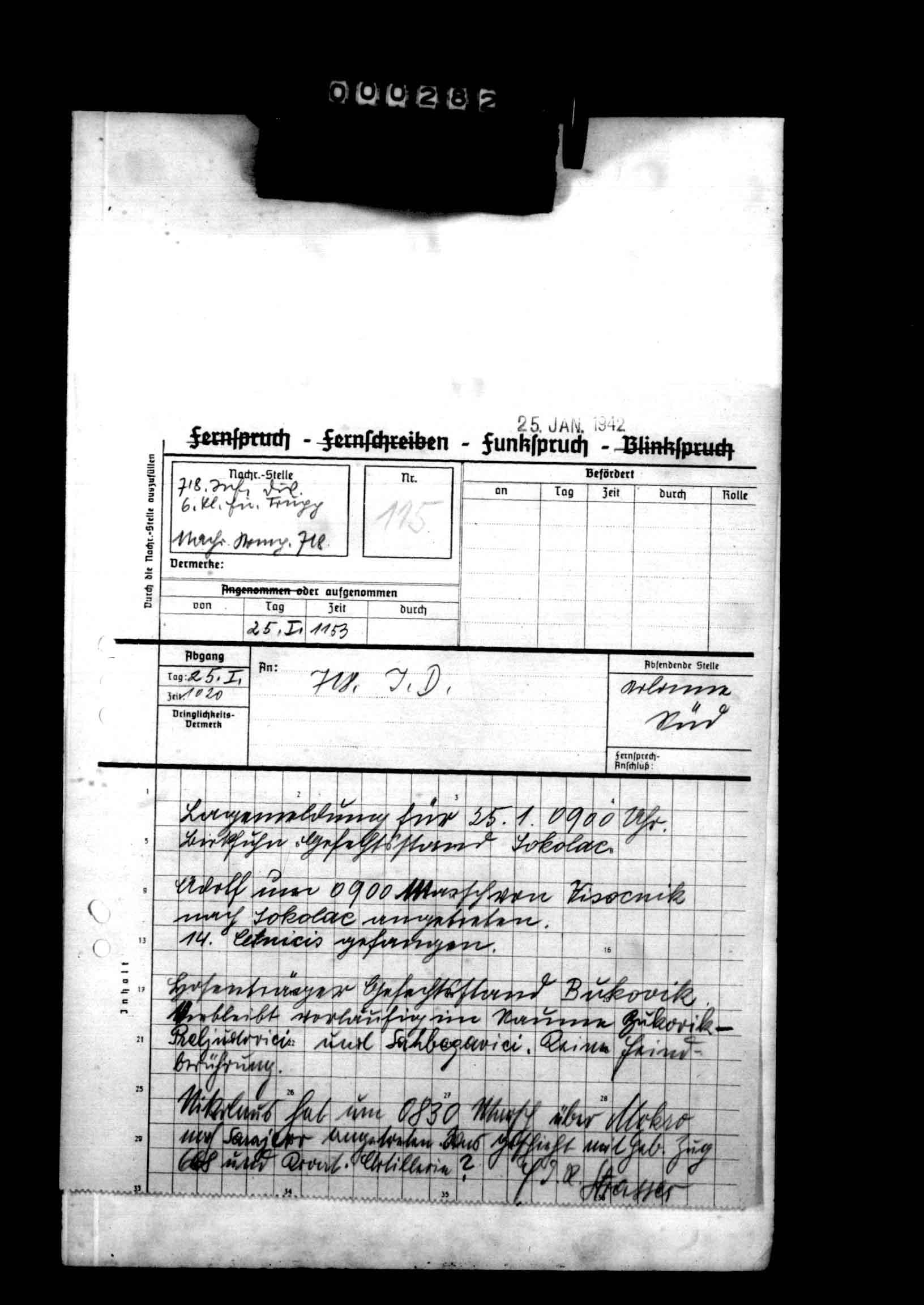 28326/3 - 718 Inf Div. Ia, Anlagenband X zum Kriegstagebuch Nr. 2. Anlagen 585/2 - Annexes to War Diary Nr. 2. Reports relating to unit occupation duty and antipartisan warfare in Yugoslavia., January 13, 1942 - January 25, 1942