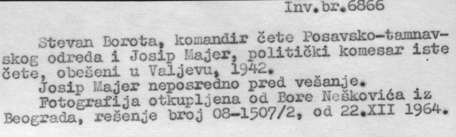 Opis: Izvorni opis: Datum: 1942-03-27. (napomena: neki datumi su okvirni) Oblast: Srbija Izvor: Muzej revolucije naroda Jugoslavije URL: http://www.znaci.org/images/6866.jpg Oznake: Vešanja u Valjevu 1942. ★