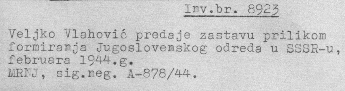 Veljko Vlahović predaje zastavu prilikom formiranja Jugoslovenskog odreda u SSSR-u, februara…