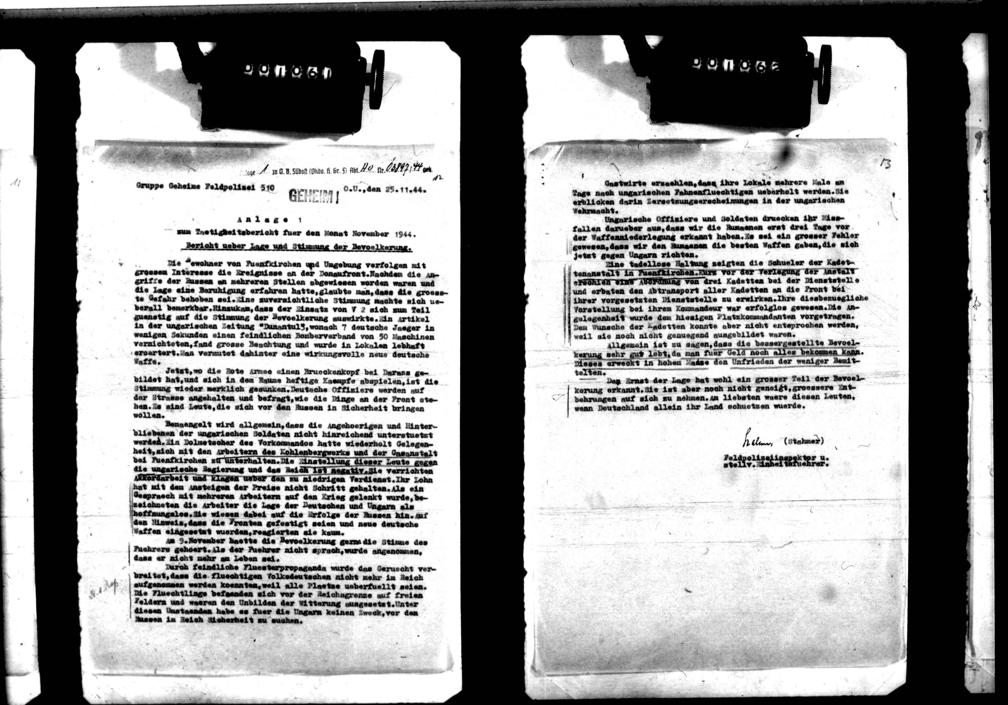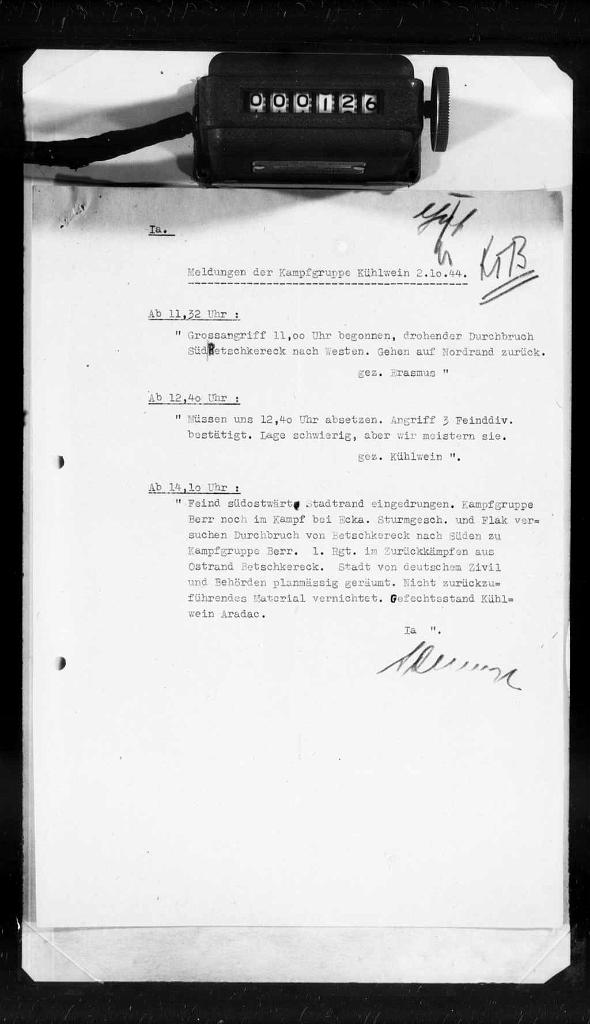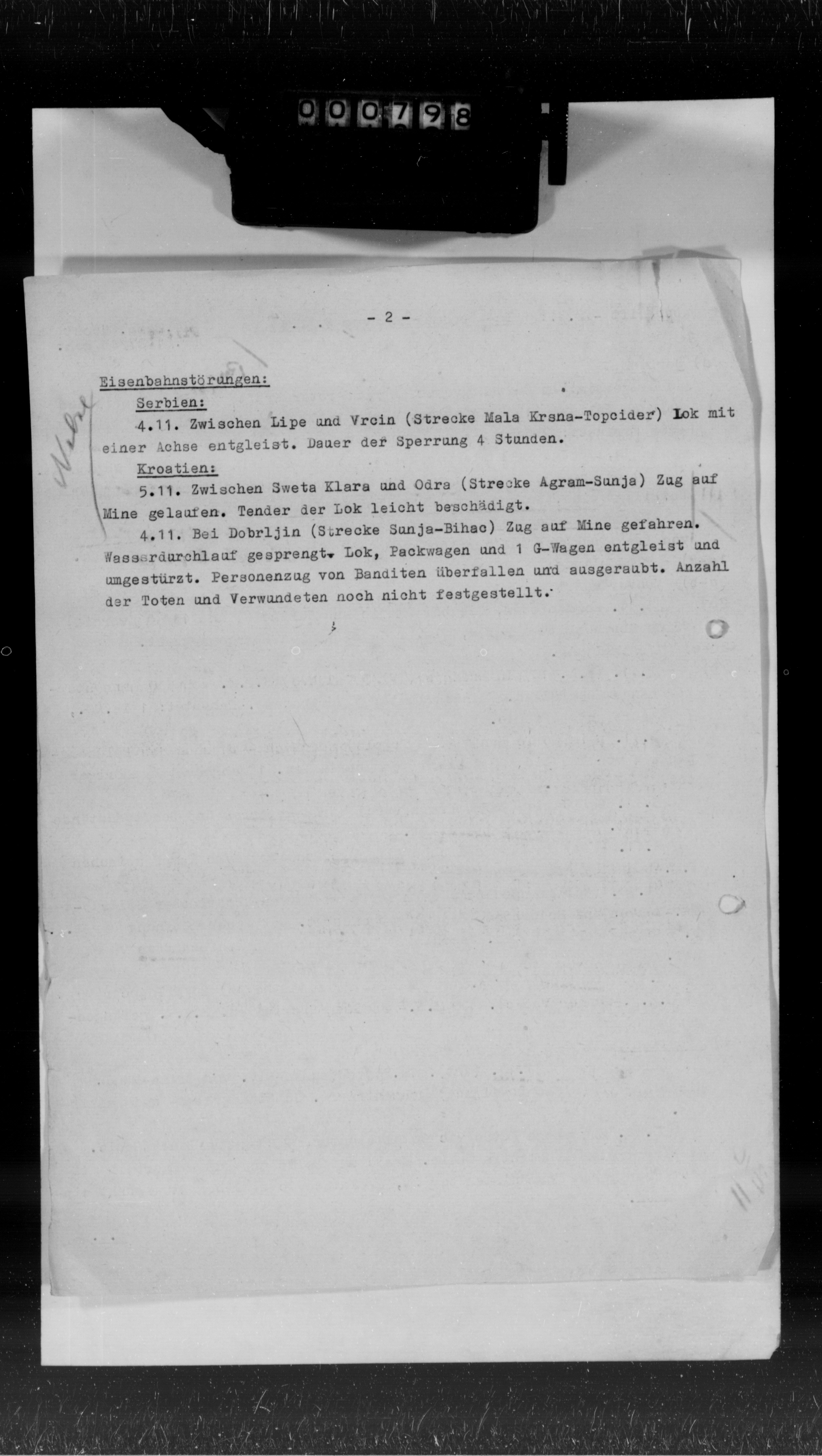 - Ic Abendmeldung, 10.11.43 - Večernji izveštaj obaveštajnog odeljenja komande, 10.11.43: Potvrđeni sukobi između srpskih i hrvatskih komunista kod Zvečeva (23 i-j-i. od Daruvara)... Hrvatske trupe koje su nastupale iz Varaždina u cilju rasterećenja Koprivnice zaustavljene z. od Ludbrega, izgleda zbog jakog otpora komunista... U Bosni snažan otpor komunista našem poduhvatu j. od Brčkog... Prema sigurnom izvoru, četnička srebrenička brigada razbijena od komunista kod Žlijeba (10 s. od Višegrada). Visoki gubici 6. bosanske brigade (17. divizija) u borbi sa našim snagama s. od Mokrog... Na Pelješcu nastavljene teške borbe... (frame no. 657)