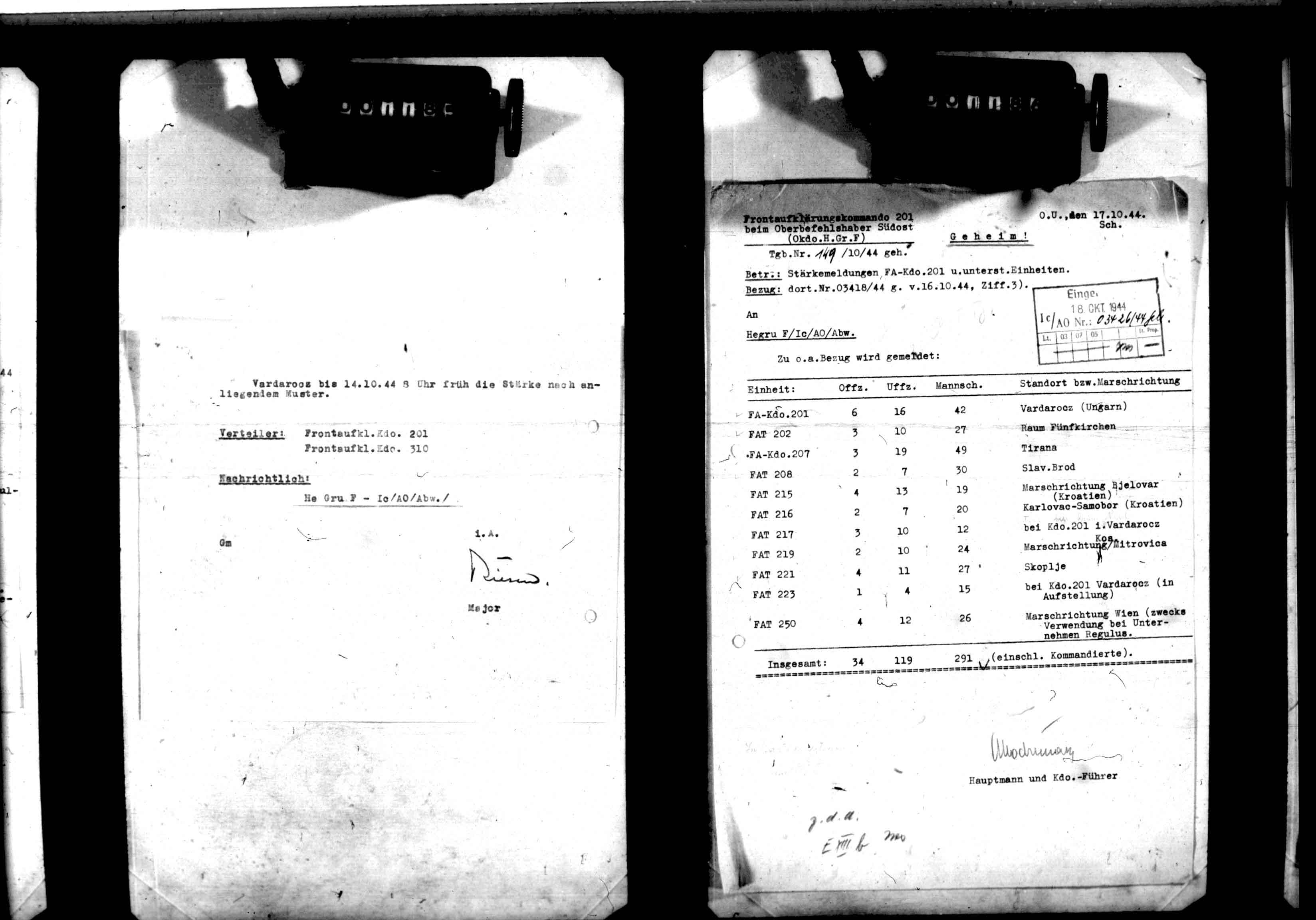 la, Anlagen zura KTR 1. 1943-12-31 - Orders, reports, messages, maps, and overlays pertaining to the activation of the 1. Kosaken-Div., 23 Apr 1943, operational readiness on 23 Sep, preparations for and transfer of the division, consisting of the I. and II. Kosaken-Reiter-Brigade and including 6 ReitPr-Regimente: Donkosaken-Reiter-Rgt. 1 and 5, Sibirkosak en-Reiter-Rgt. 2, Kubankosaken-Reiter-Rgt. 3 and 4, and Terekkosaken-Reiter-Rgt. 6, from Hlawa, Poland, to Mitrovica, Yugoslavia, 17 Sep-15 Oct; movements, guartering, reconnaissance and assault operations, securing roads and railroads, training, and operations against partisans in the Mitrovica, Ruma, Novi Sad, and Vinkovci areas, 6-31 Oct, in the Djakovo, Osijek, and Masice areas, 1-21 Nov; and movement to and relief of the 11. SS Panzer-Grpn-Div. Nordland in the Sisak area, 21-28 Nov. Operations against partisans and securing roads, railroads, and airfields in the Sisak, Glina, and Dubica areas and south of Zagreb (Agram) and securing the railroad line Brod-Derventa-Doboj-Tuzla by the II. Kosaken-Reiter-Briqade in detached service, 29 Nov-31 Dec. Afteraction reports and critiques regarding Unternehmen Araiin (operations against partisans in the Tlok, Trigf Vrdnik, Krusedol, Karlovci, and Indija areas of the Fruska Cora Mountains, 13-17 Oct) ; Unternehmen Wildsau I (operations against partisans in the Vinkovci, Tovarnik, Sid, and Kuzmin areas between the Bosut and Sava Rivers, 20-27 Oct) ; and nnternehmen Panther (operations to destroy partisan units and mopping-up action in the Glina, Gora, Petrinja, and. Sunja areas between the Una and Korana Rivers, 7-20 Dec). Order-of-battle charts; billeting surveys; status, strength, and casualty reports; special directives concerning supply and siqnal communications; and data relating to partisan operations and losses., September 17, 1943 - December 31, 1943 izdvojeno: | 46 |