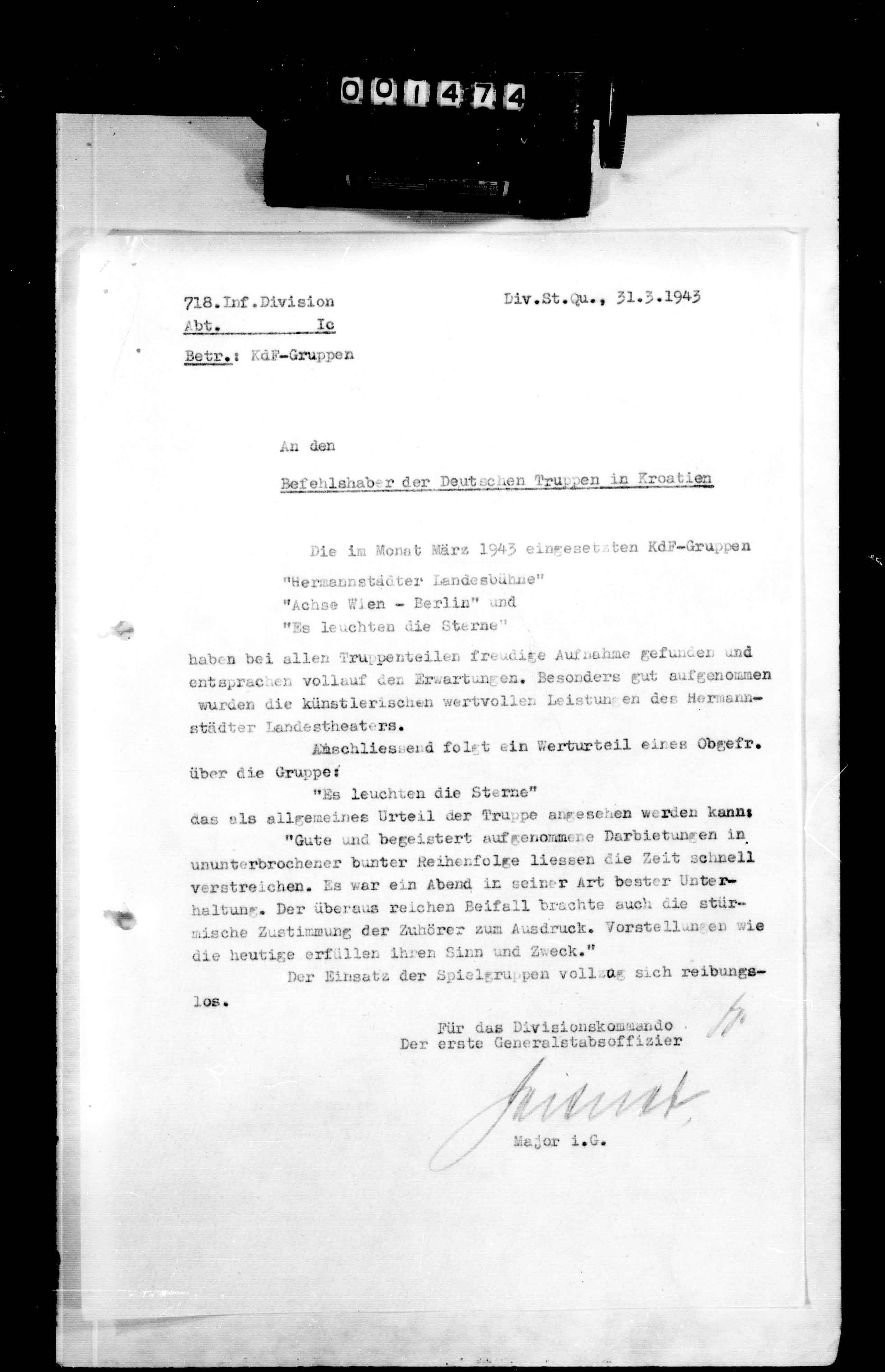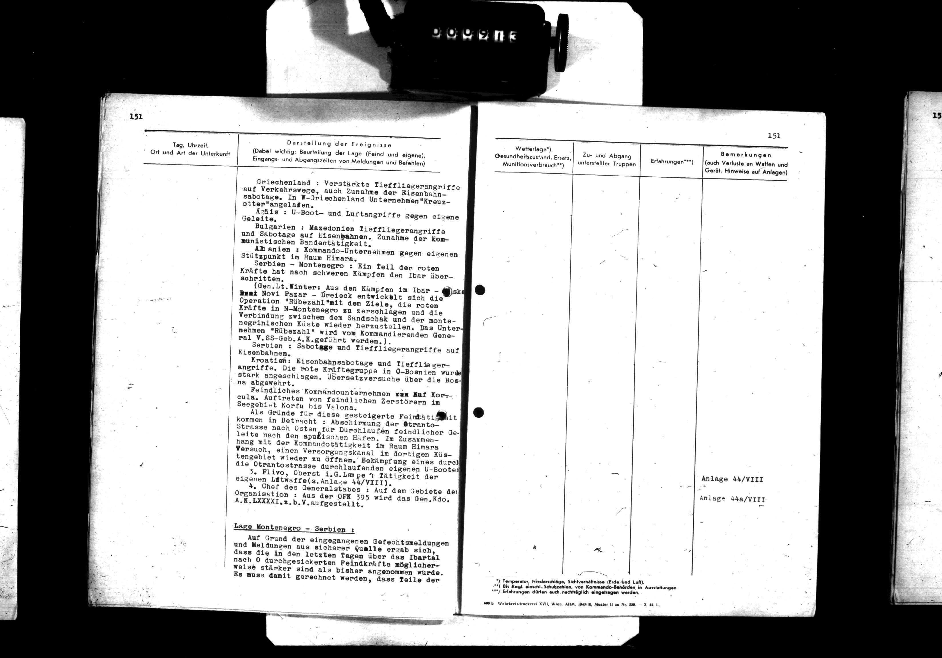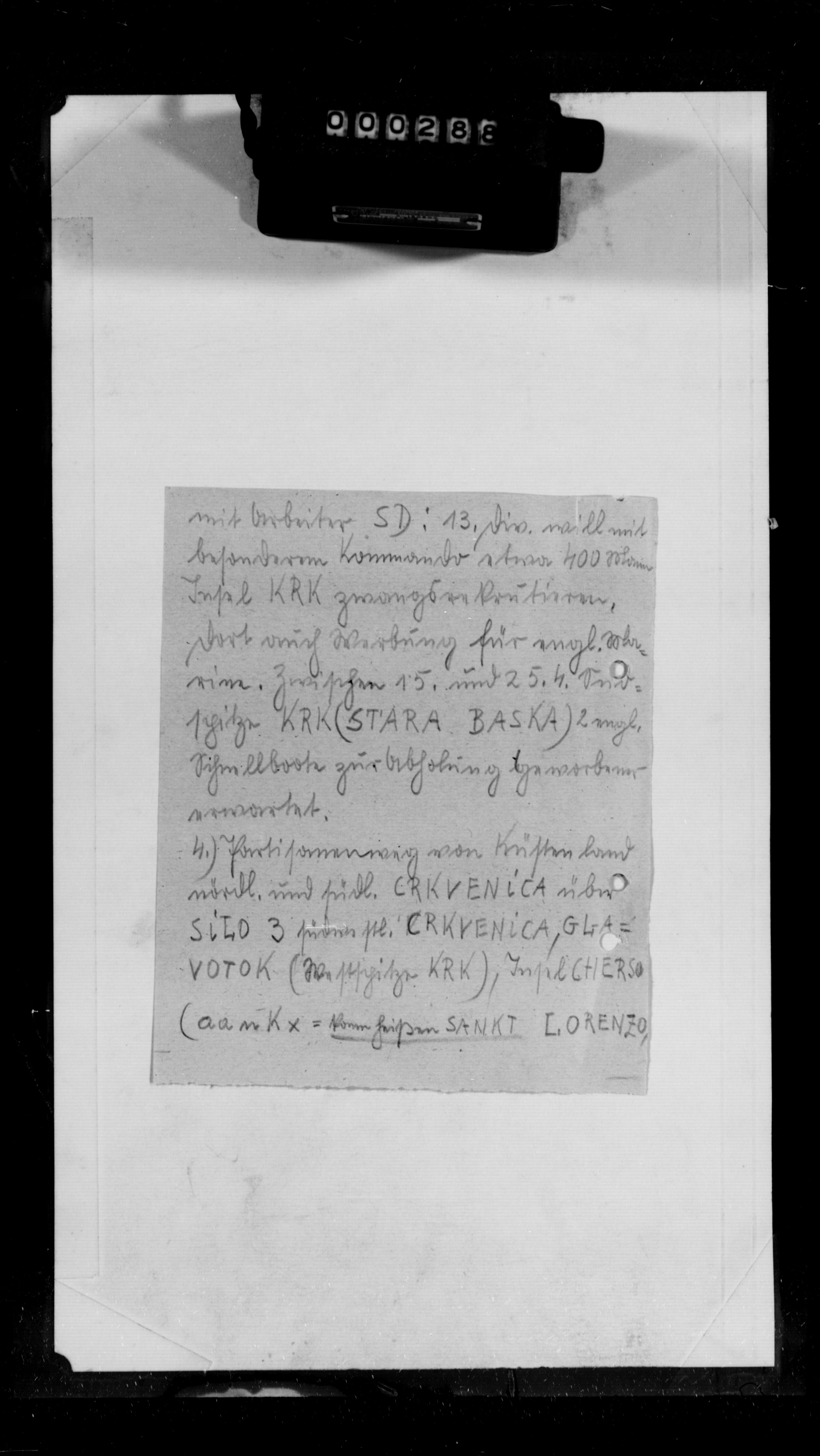 34404/4 - Ia, Anlagenband XXVIII zum KTB 3. - Orders, reports, messages, and maps pertaining to operations against partisans, mopping-up action, security, training, regrouping, and partisan activity, unit identification, location, and strength in the Konjic, Kiseljak, Sarajevo, Mostar, Travnik, Zenica, Doboj, Rogatica, Vlasenica, Zavidovici, Tuzla, Jajce, Vares, Prozor, Visoko, Busovaca, and Teslic areas; reorganization and training as the 718. Jaeger-Division in March 1943 and redesignation as the 118. Jaeger-Division, 1 Apr. Reports concerning the political, partisan, German military, traffic, economic, health, and replacement situation; condition of roads and railroads; and civilian morale and attitude in the division sector. Lists of division and enemy losses, acts of sabotage, and units subordinate to the division as of 31 Mar. A billeting survey of the Croatian 4th Jaeger-Brigade, 22 Mar; and an afteraction report by Gren.Rgt. 738 regarding Unternehmen Mostar (operations against partisans in the Gornji Vakaf, Prozor, Podhum, Ostrozac, and Jablanica areas to secure the bauxite mining region around Mostar, 23 Feb-19 Mar). Mar 01 - Mar 31, 1943., March 01, 1943 - March 31, 1943 izdvojeno: | 947 |