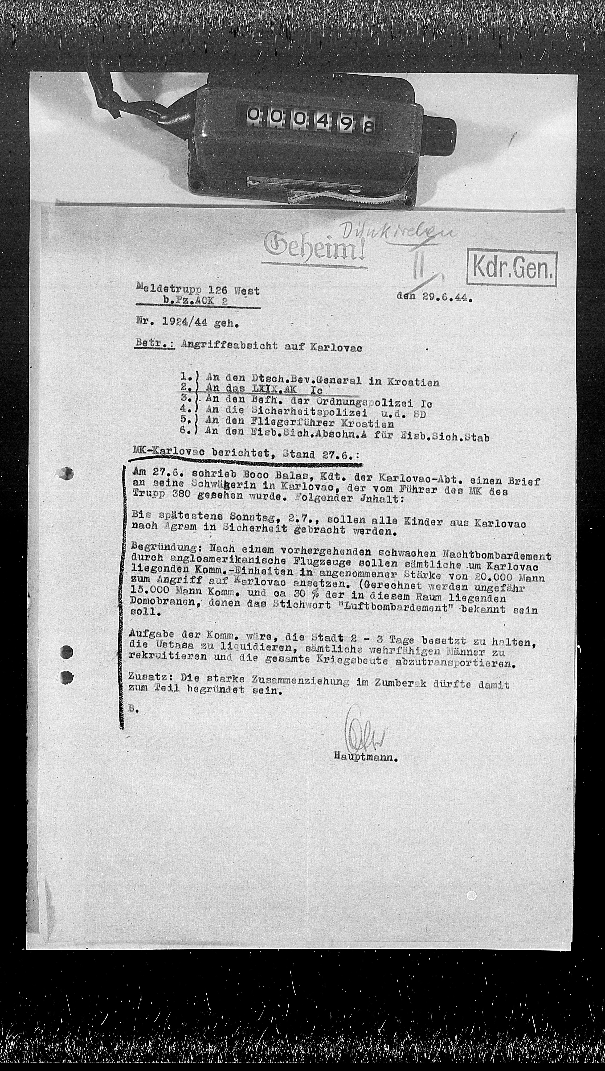 la, Anlagenband z. KTB 2, Duhkirchen Unternehmen im Raum Karlovac Juni-Juli 1944. 1944-07-23 - Reports, messages, orders, order of battle charts, and maps pertaining to Operation Donkirchen (the destruction of insurgent Croatian units in the Karlovac area)., May 24, 1944 - July 23, 1944