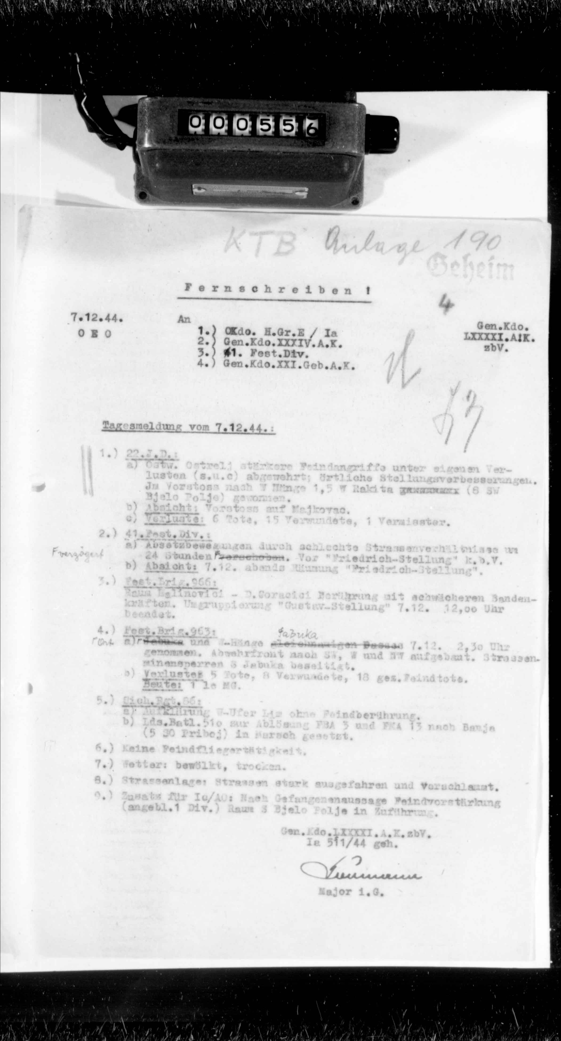 34404/2 - Ia, Anlagenband XXVI zum KTB 3. - Orders, reports, messages, and overlays pertaining to operations against partisans (mostly Communist groups), reconnaissance and mopping-up action, security, laying and location of minefields, regrouping, and partisan activity in the Sarajevo, Jajce, Travnik, Zenica, Doboj, Visegrad, Teslic, Vares, Sekovici, Turbe, Donji Vakuf, Tuzla, Zavidovici, Busovaca, Zepce, Zvornik, and Derventa areas. Afteraction reports and critiques regarding Unternehmen Teslic I (operations against partisans in support of Unternehaen Weiss I in the Teslic area and mopping-up in the Teslic, Zavidovici, and Zepce areas, 15 Jan- 8 Feb 1943). Included are German and enemy losses and inventories of ammunition expended. Reports concerning the political, partisan, German military, traffic, and economic situation and the morale and attitude of the civilian population in Croatia and Bosnia; an evaluation of the fighting qualities of the Croatian Army; order-of-battle charts; an intelligence report and bulletin; and a billeting survey. Feb 01 - Feb 15, 1943., January 15, 1943 - February 15, 1943 izdvojeno: | 325 |