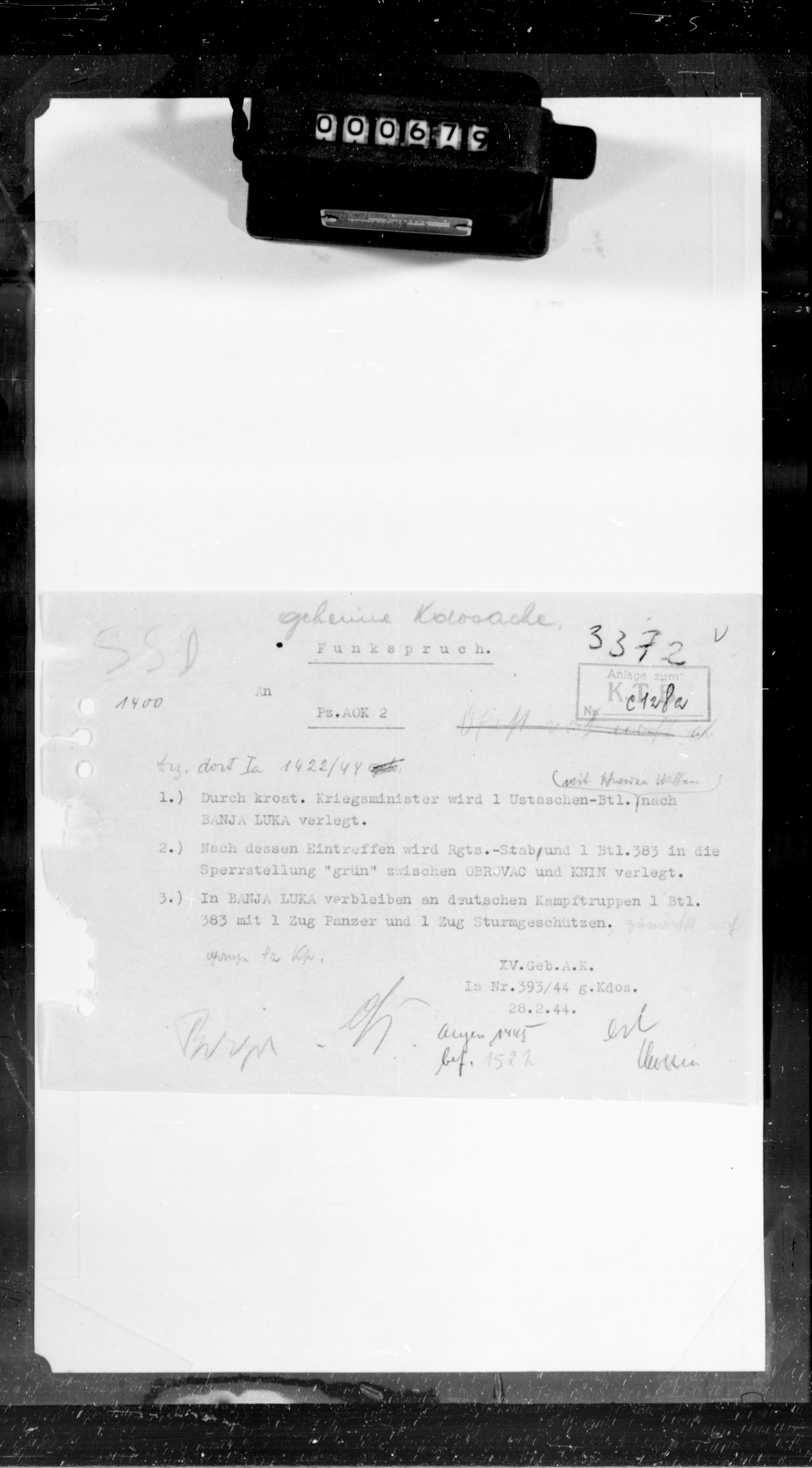 Geb AK XV, 58277/2, KTB Abtlg.Ia - Diary compiled br the Operations Branch (Abtlg.Ia) describes tactical situations ani developments during the continuation of the Croatian campaign on the Adriatic Sea. No charges in general areas., January 01, 1944 - June 30, 1944 izdvojeno: | 1 |  |