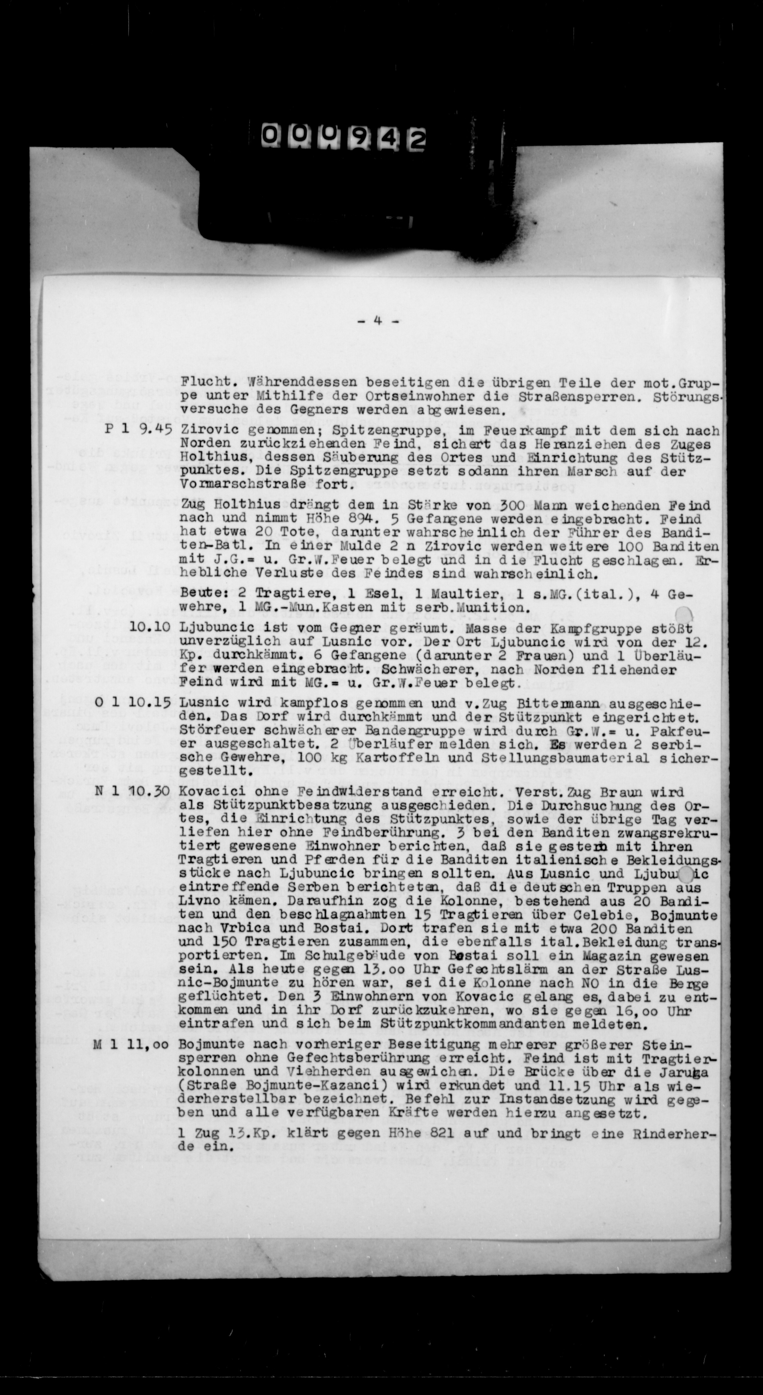 Ic, TB 1. 1944-01-16 - Activity reports concerning partisan operations and losses, control of Cossacks during their stay at Truppenuebungsplatz Mielau (Mlawa) , Poland, counterintelligence, courts-martial, troop indoctrination and entertainraent, and Unternehmen Armin (operations aqainst partisans in the Fruska Gora Mountains, 13-17 Oct 1943), Unternehnen Wildsau I (operations aqainst partisans in the area between the Bosut and Sava Rivers, 20-27 Oct) , and Unternehmen Panther (operations to destroy partisan units and raoppinq-up action in the area between the Una and Korana Rivers, 7-20 Dec)., August 01, 1943 - January 16, 1944 izdvojeno: | 497 |