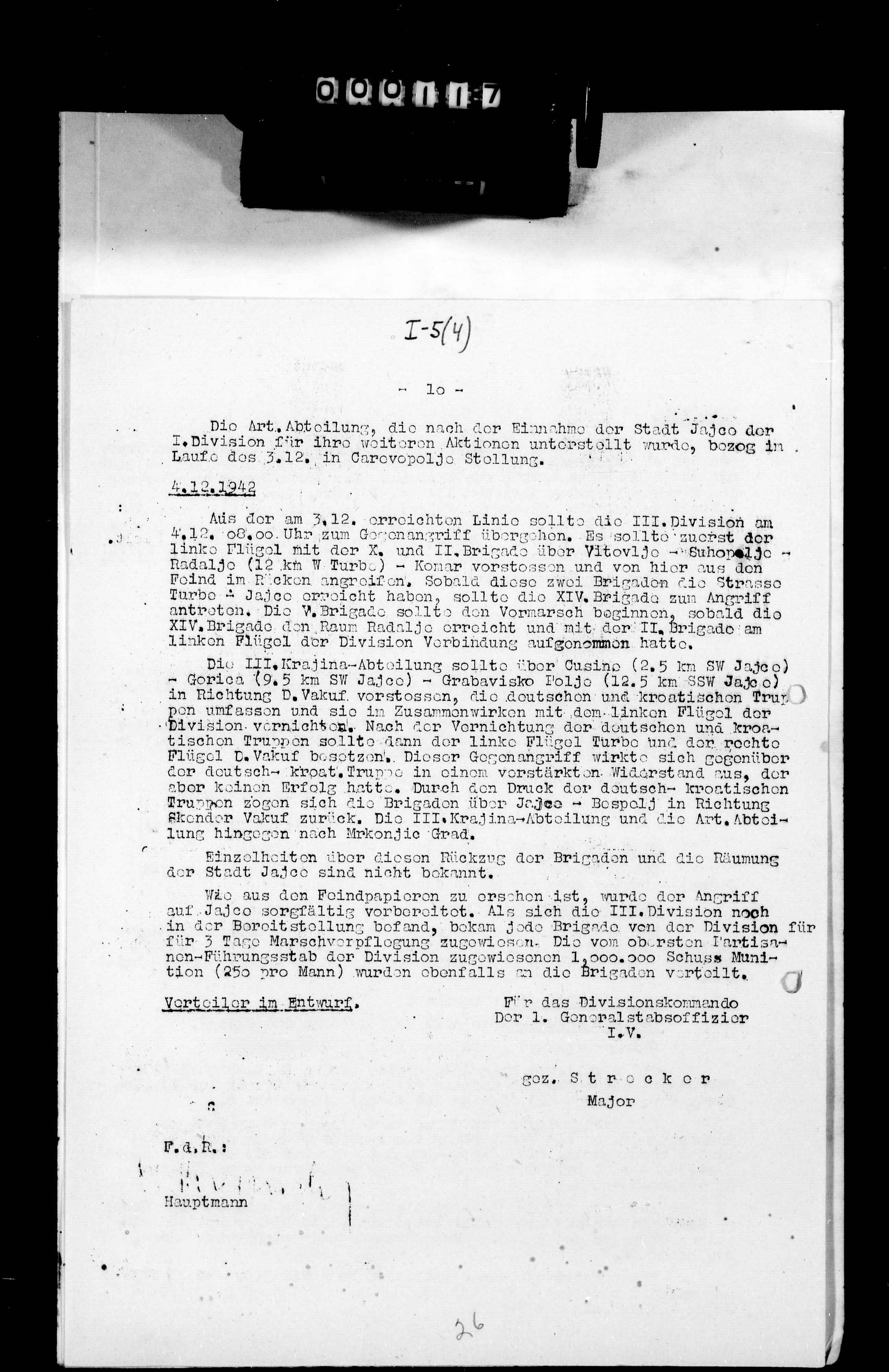 28326/19 - Ic, TB 1 mit Anlagen. - Activity report, including intelligence reports and bulletins concerning partisan surprise attacks, raids, acts of sabotage, movements, the military situation, organization, and leadership; administrative services, duty assignments and unit identification, strength and losses; morale and attitude of the civilian population; operations against partisans; reconnaissance and mopping-up action; security; and couaterintelligence in the Sarajevo, Kram, Tarcin, Olovo, Trnovo, Vlasenica, Mitrovica, Vares, Jajce, Visegrad, Rogatica, Zavidovici, Turbe, Travnik, Jezero, Tuzla, and Donji Vakuf areas. Included are German propaganda leaflets. Jul 06 - Dec 31, 1942., July 06, 1942 - December 31, 1942 izdvojeno: | 1 |  |