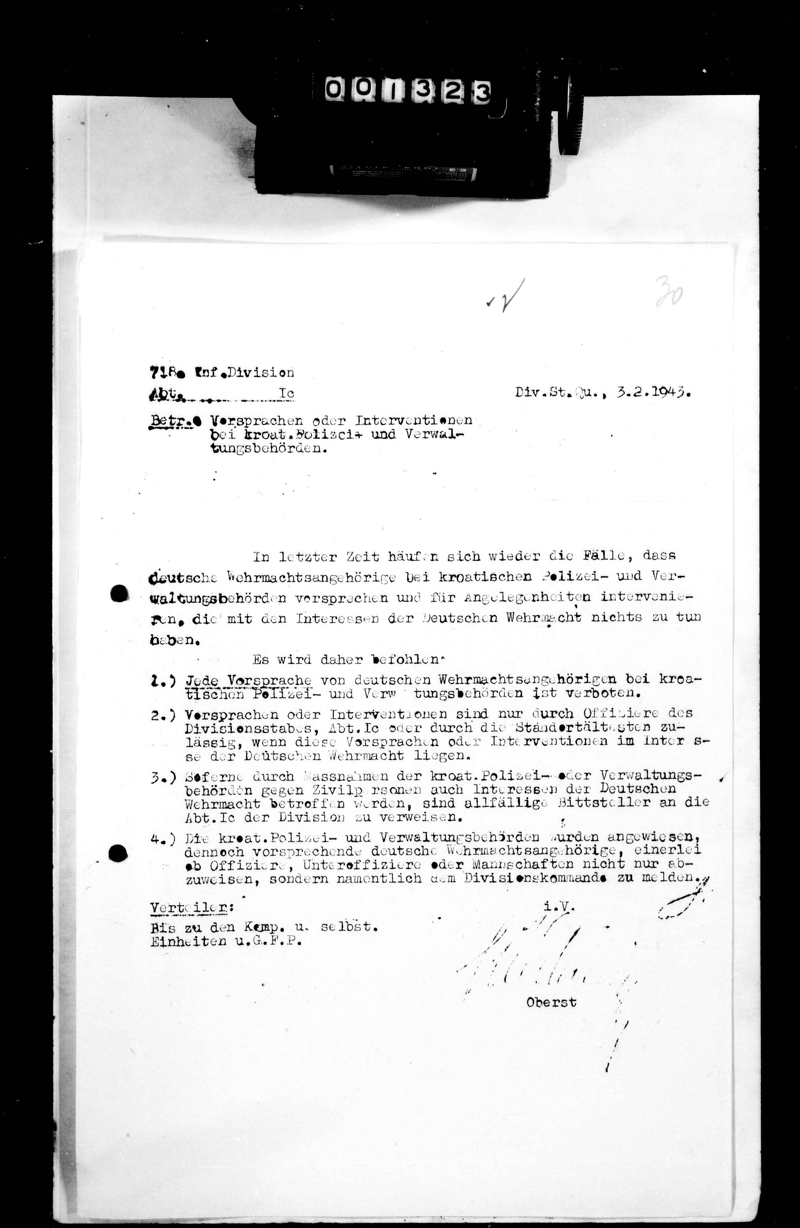 34404/3 - Ia, Anlagenband XXVII zum KTB 3. - Orders, reports, messages, maps, and overlays pertaining to operations against Communist and Chetnik groups, reconnaissance and mopping-up action, security, formation of the Croatian 4th Jaeger-Brigade, training, regrouping, and partisan activity in the Visoko, Sarajevo, Rogatica, Vlasenica, Tuzla, Travnik, Jajce, Kiseljak, Tarcin, Zenica, Zavidovici, Vares, Kupres, Jezero, Kladanj, and Derventa areas; reorganization as the 718. Jaeger-Division, approved on 10 Feb 1943, and redesignation as the 118. Jaeger-Divisicn, 1 Apr; and preparations for and participation in Unternehmen Weiss II (operations against partisans to secure the bauxite mines in the Mostar area) and the support of Unternehaen Konjic (operations against Communist groups in the Konjic area), 22 Feb-22 Mar. Order-of-battle charts; billeting surveys; an afteraction report, 28 Mar, concerning assembly for and Unternehmen Konjic and return to former stations, 23-26 Mar; tables of organizational breakdown, combat and ration strength, ammunition and weapons expended, and losses of the division and attached Croatian ad Ustasha units; reports regarding Communist, Chetnik, German Military, traffic, and the economic situation and losses; and intelligence reports and bulletins. Feb 02 - Feb 28, 1943., February 02, 1943 - February 28, 1943 izdvojeno: | 650 |