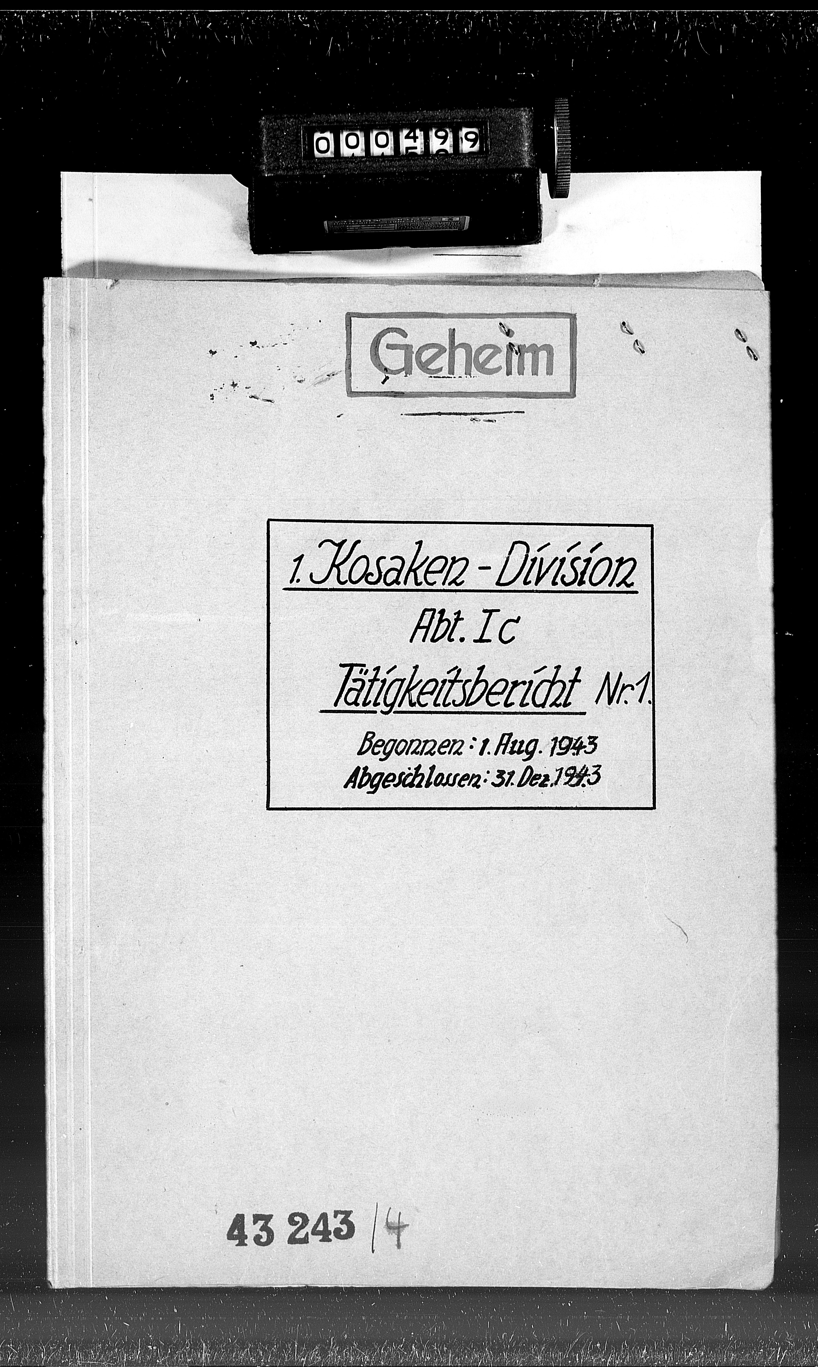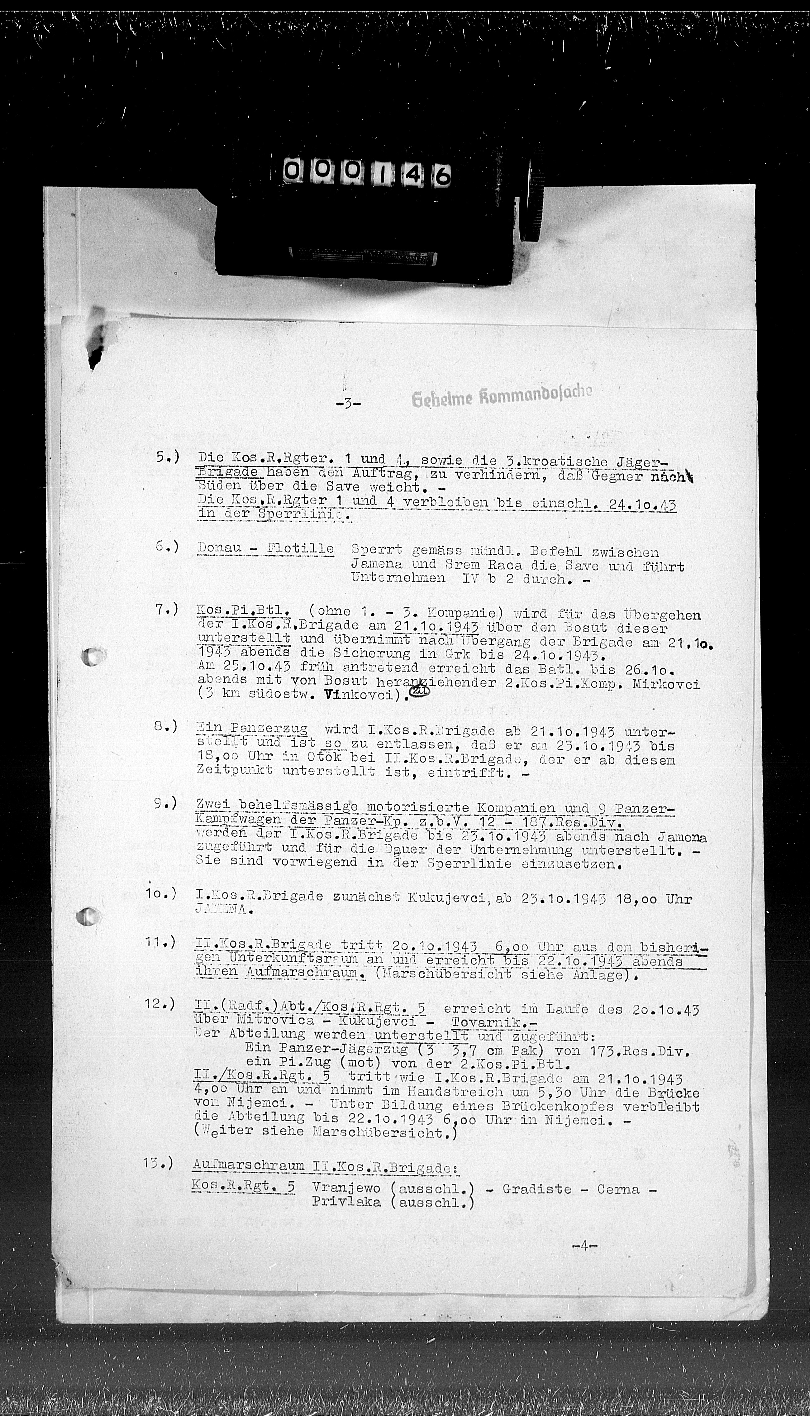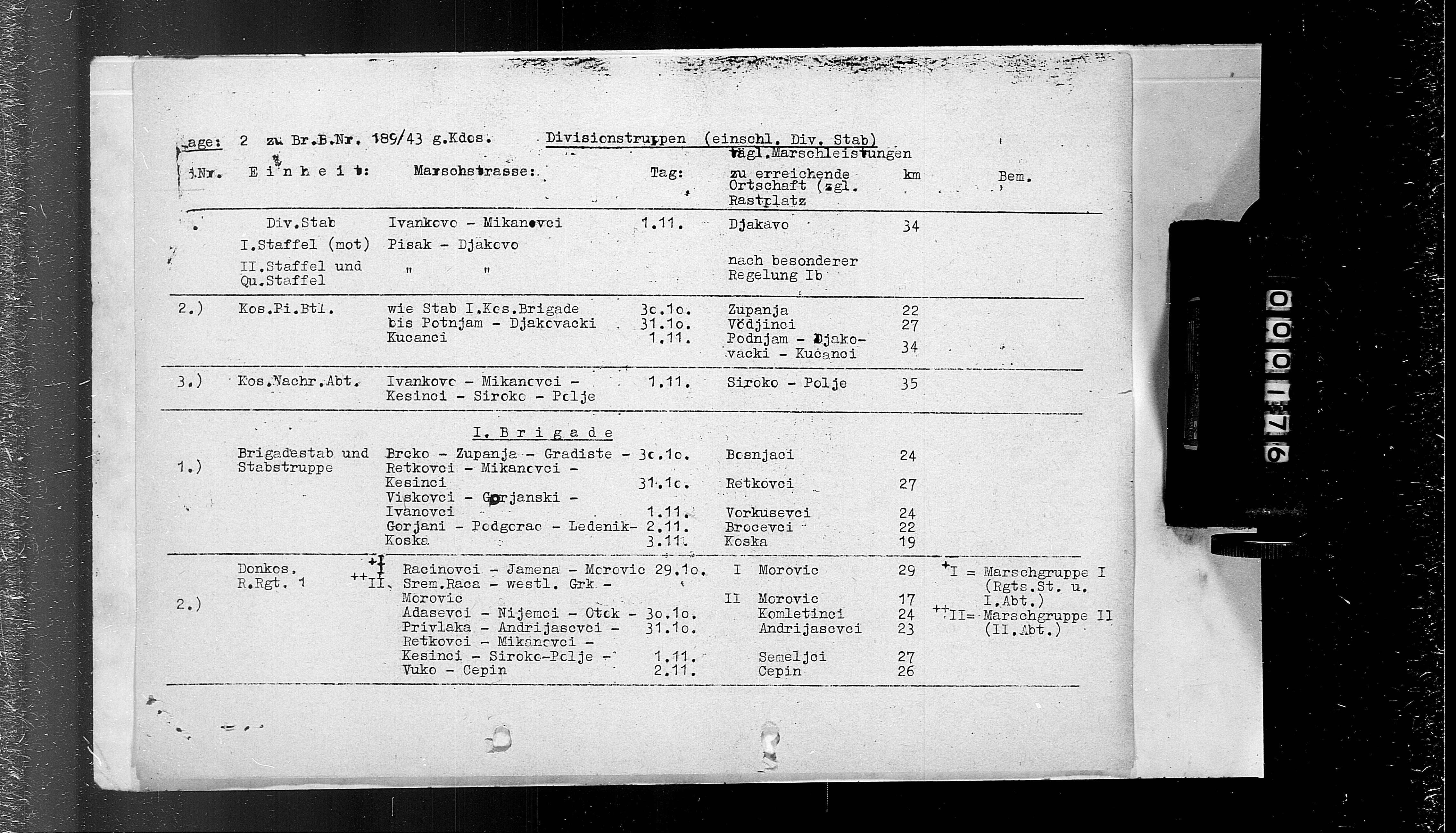 la, KTB 1. 1943-12-31 - War journal concerning preparations for and -I.KosD transfer from Truppen uebungsplatz Mielau (Mlawa) , Wehrkreis I, Poland, to Mitrovica, Yugoslavia, 17 Sep-15 Oct 1941; movement s, guarteringr reconnaissance and assault operations, securing roads, railroads, and airfields, training , and operations against partisans in the Mitrovica, Ruroa, Sid, Tovarnik, Ilok, Irig, Novi Sad, Indija, Krasedolr Vrdnik, Karlovci, and Vinkovci areas and the Fruska Gora Mountains, 6-31 Oct; in the Vinkovci, Djakovo, Osijek, Cepin, Nasice, Brod, Doboj, Valpovo, Podgorac, and Potnjani areas, 1-21 Nov; and in the Sisak, Petrinja, Glina, Gora, Sunja, Kostalnica, Bosanski Novi, Dubica, and Zagreb (Agram) areas, 29 Nov-31 Dec, with headguarters of the division at Mitrovica, 6-22 Oct, at Vinkovci, 23 Oct-2 Nov, at Djakovo, 3-21 Nov, and at Sisak, 27 Nov-31 Dec. Movement from Djakovo to Sisak and relief of the 11. SS Panzer-Gren-Div. Nordland, 21-28 Nov, and assignment of the II. Kosaken-Reiter-Brigade in detached service to secure the railroad line Brod-Derventa-Doboj-Bosansko Petrovo Selo-Tuzla, 29 Nov-31 Dec., September 17, 1943 - December 31, 1943 izdvojeno: | 1 |  |