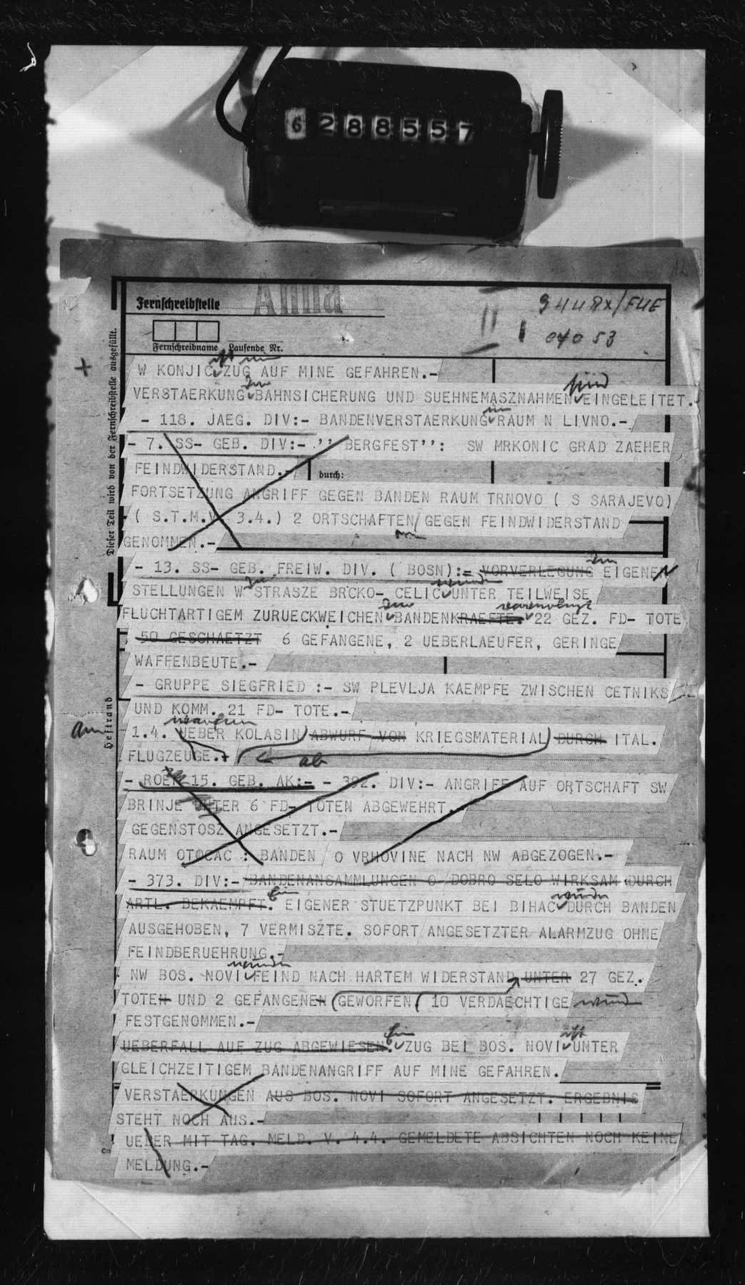 - Broj i vrsta vozila zaplijenjenih od Italijana i njihova raspodjela (uglavnom 7.SS divizija); ukupno zarobljeno 37 ispravnih i 13 neispravnih *manjih tenkova*, i 8 velikih i 3 malih borbenih vozila (*neka su već izgubljena u borbama*) ; 300 kamiona i automobila, od čega samo 70 ispravnih. (frame no. 679)