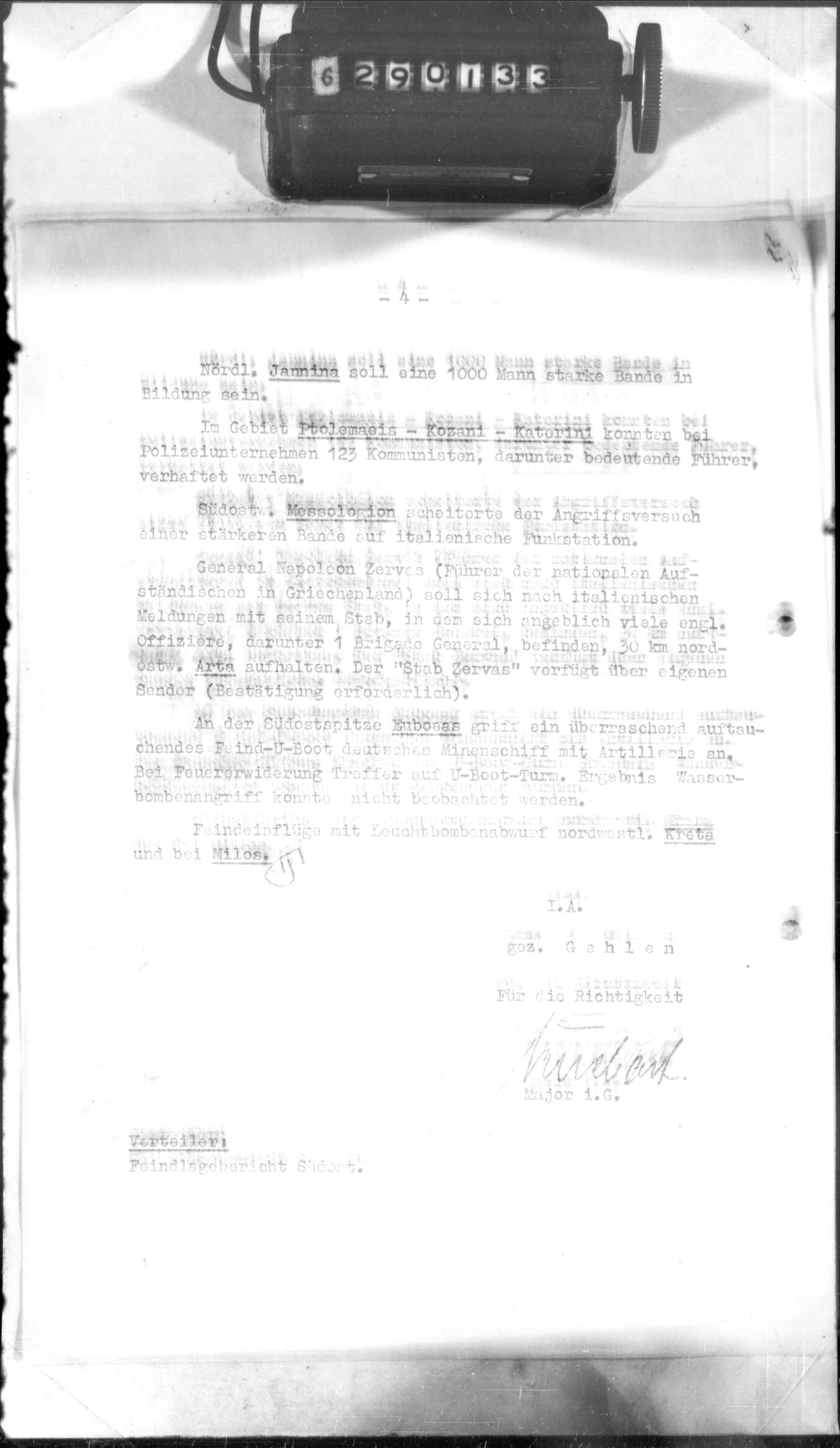 34404/5 - Ic, TB mit Anlagen. - Activity report concerning partisan attacks, raids, acts of sabotage, strength, movements, location, unit identification, and losses; counterintelligence; military intelligence; and troop indoctrination and entertainment. German and enemy propaganda leaflets; reports regarding the mission and commitment of the Geheime Feldpolizei (secret field police) and Croatian police, and a meeting with Chetnik leaders Kovacevic, Cvijetan Todic, Djukanovic Mirko, Milic Milan, and Vladimir Petrovic; translations of partisan service regulation and combat methods; instructions for treatment of captured partisans; notes on Tito-s life; interrogation summaries; and periodic intelligence reports and bulletins. Jan 01 - Mar 31, 1943., July 01, 1943 - November 30, -0001 izdvojeno: | 1223 |