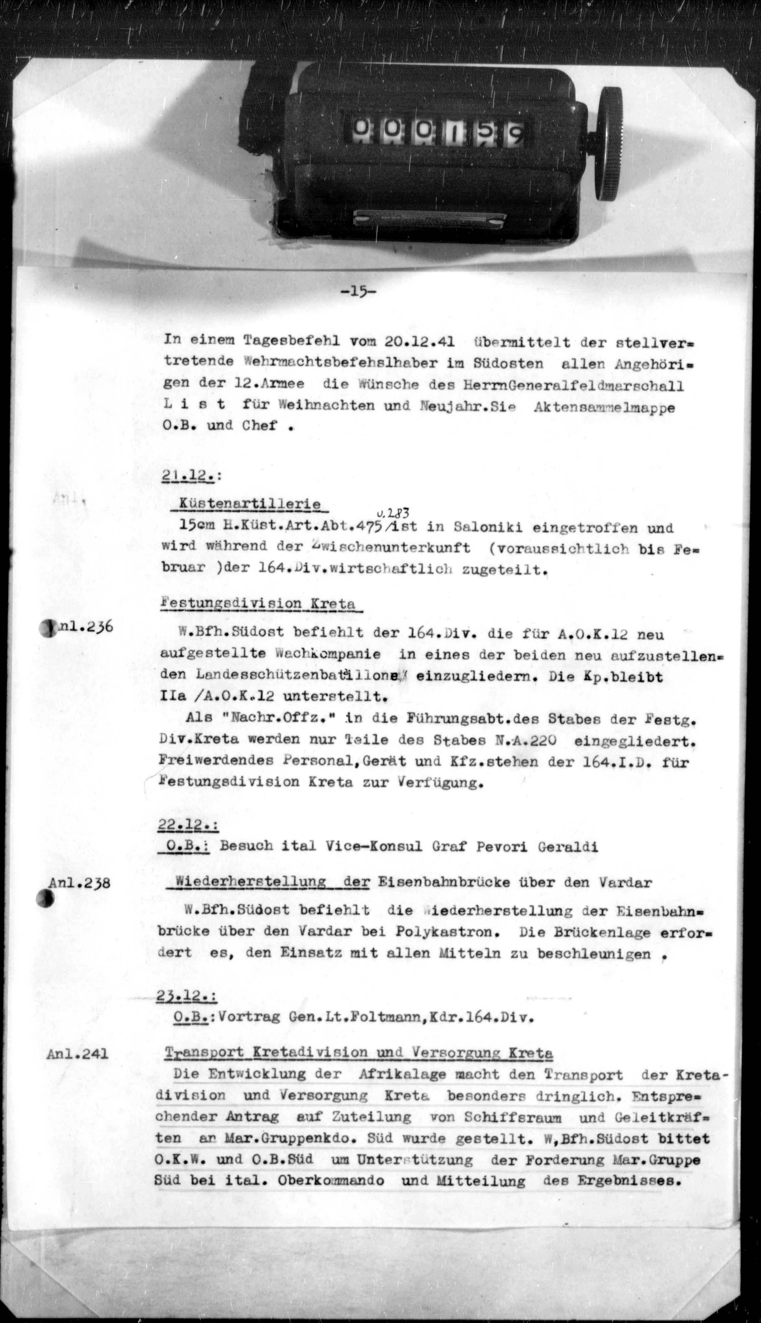 - 1.2.42: /Načelnik štaba Vrhovne komande oružanih snaga smatra da se na osnovu izvještaja Vojnog komandanta jugoistoka i rezultata dosadašnjih operacija još ne može nadati u smirivanje situacije u Srbiji, odn. da je razbuktavanje ustanka na proljeće vjerovatno. Dosada se nije uspjela slomiti kičma ustanicima primjenom drakonskih mjera. Najdjelotvornije sredstvo protiv ustanika je razgranat obavještajni sistem, koji bi, uz primjenu brutalnih policijskih i sigurnosnih mjera, morao ugušiti svaku ustaničku aktivnost u samom početku./ (frame no. 195)