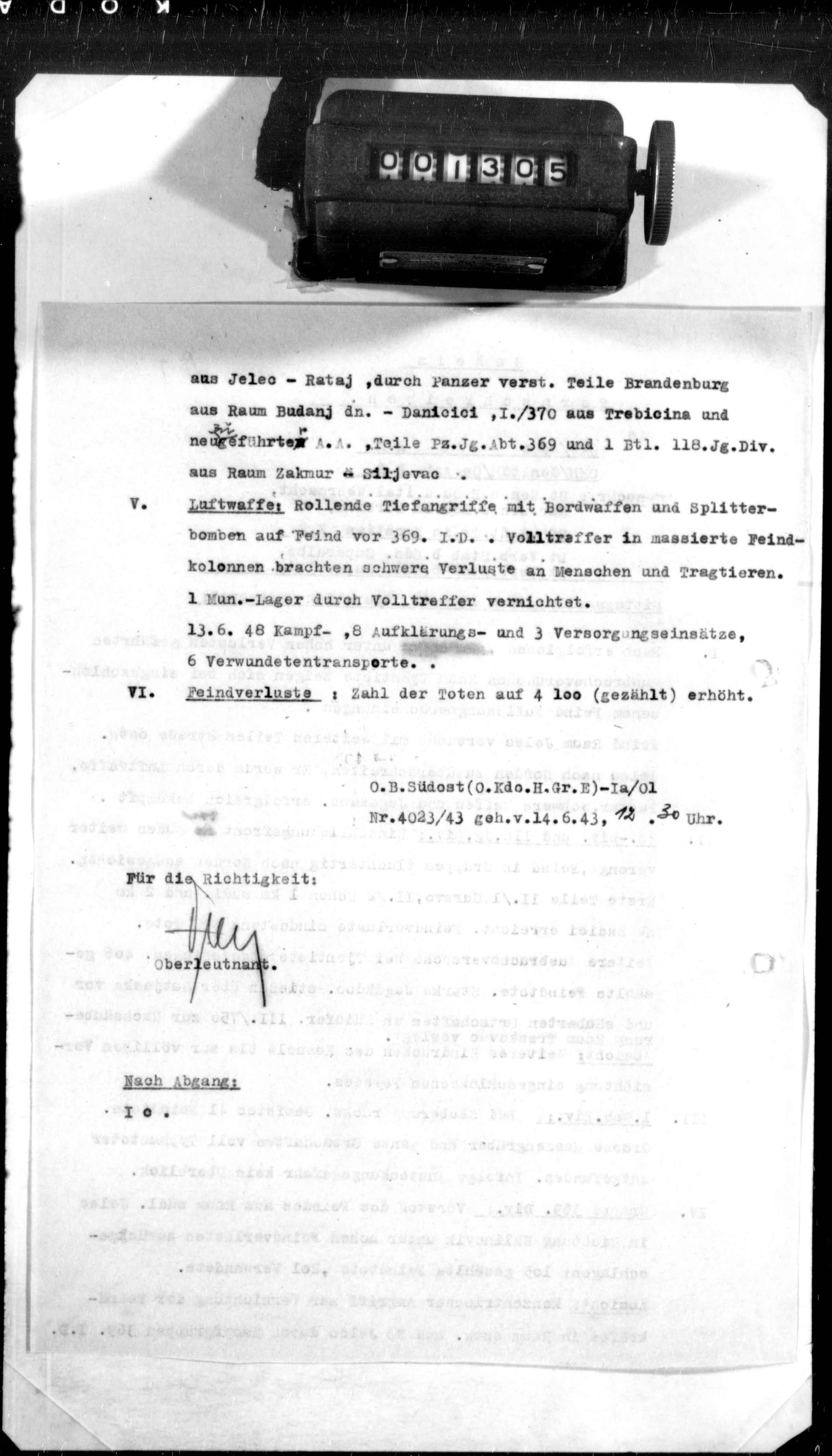 - (001450, 9. maj 1943.): /369. divizija: Vraćanje oružja od strane četnika završeno. Ukupno isporučeno 10 mitraljeza i 500 pušaka[...]./ (frame no. 1450)