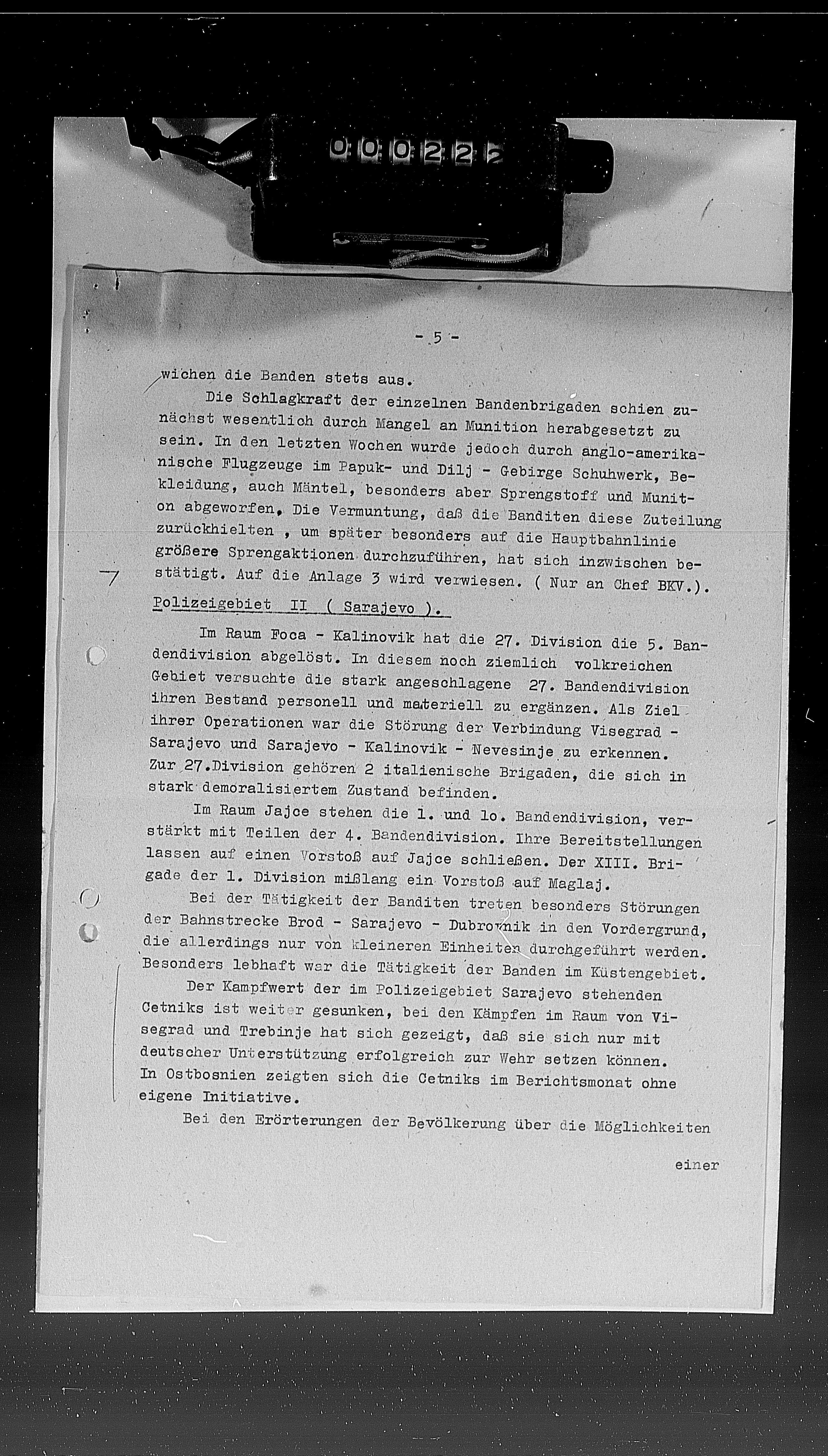 u NDH krugovima se sve veće oslanjanje Nijemaca na četnike smatra više političkim nego vojnim pitanjem; u nekoliko navrata, četnici i musl. milicije se udružile radi odbrane sela protiv partizana (npr. kod Trnova), a sve to na njemački nagovor; -u zoni 5. SS GebKor. došlo do povećanog korištenja četnika u borbi protiv partizana, gdje su se ovi, u okvirima svojih mogućnosti, dobro pokazali.- (frame no. 173)