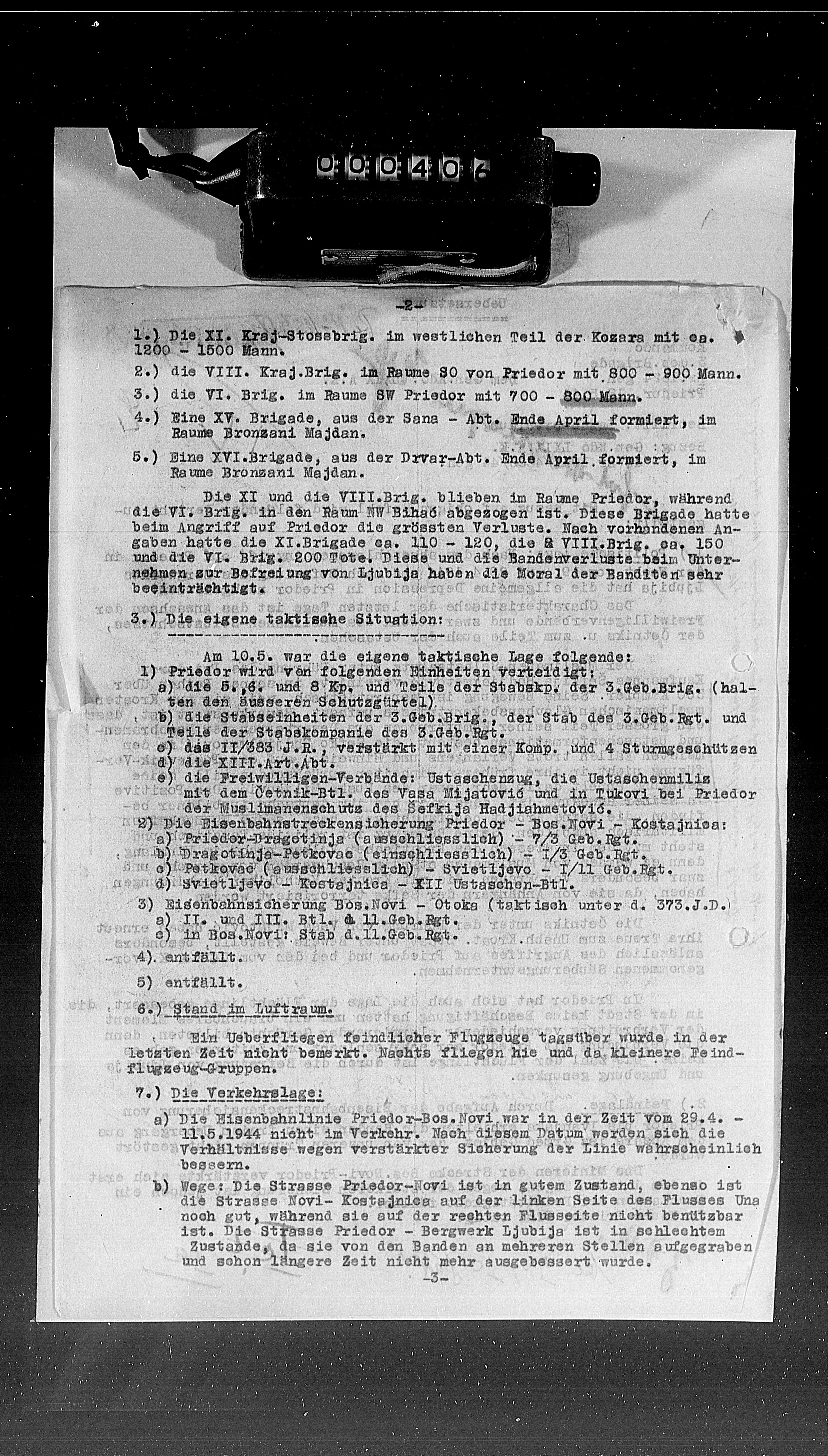- 2000 prebjega iz zone 6. korpusa NOVJ; registrovano 34 diverzije na pruzi i 27 na kompozicijama; na jednoj dionici povađeno 54 mine; zločini ustaša 8.5.44 u selima Građani i Čovac - pobijeno (i masakrirano) ukupno 12 osoba, uklj. žene i djecu. (frame no. 420)