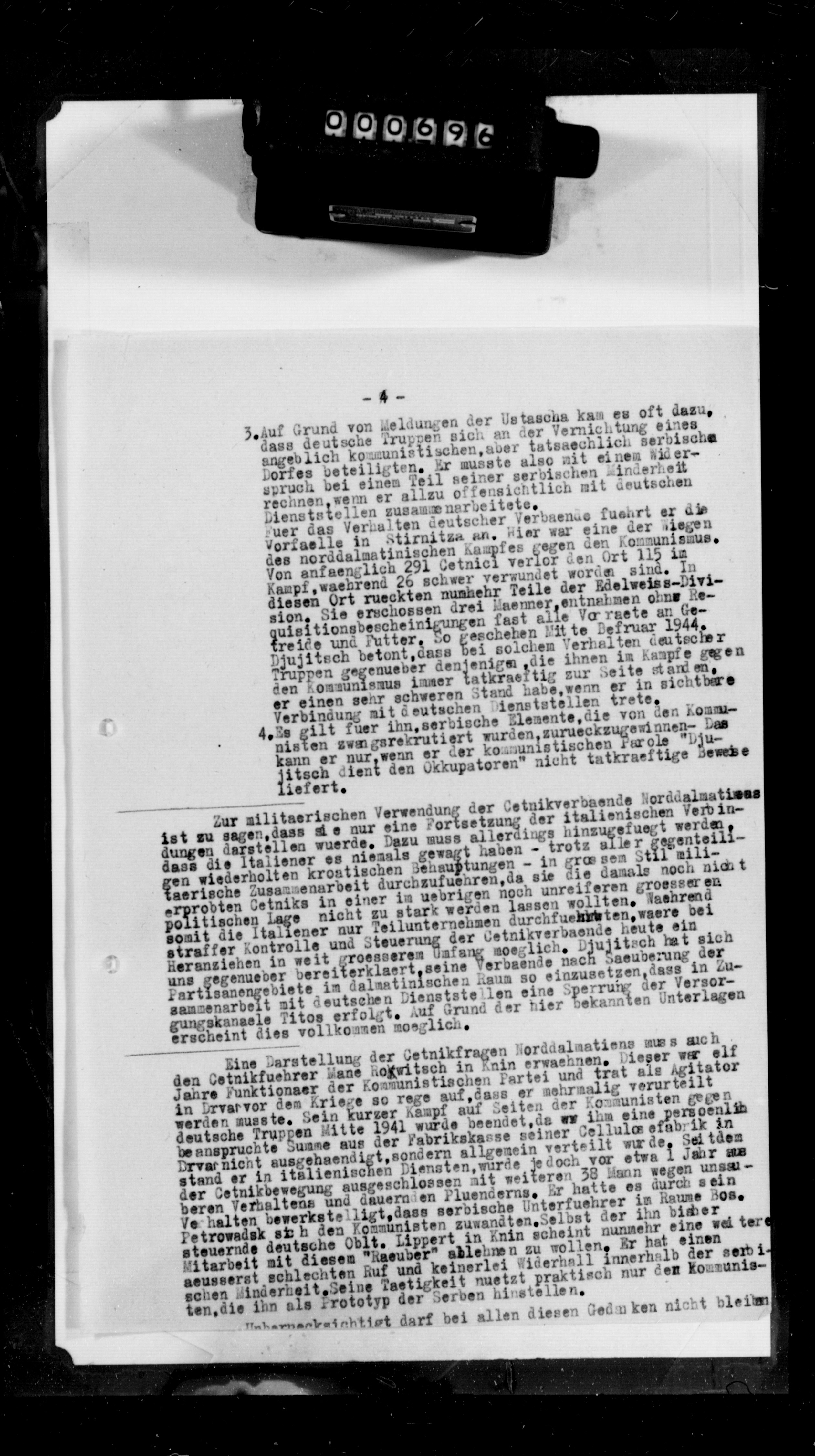 - (snimak 000692) /Vojne operacije Dinarske četničke divizije sprovođene u saradnji sa njemačkim divizijama, koje su također obavještavane o rezultatima operacija. Pored toga, značajn dijelovi četničkih jedinica su upotrebljeni za osiguranje njemačkih linija snabdijevanja. S vojne tačke gledišta je trenutna saradnja sa četnicima zadovoljavajuća./