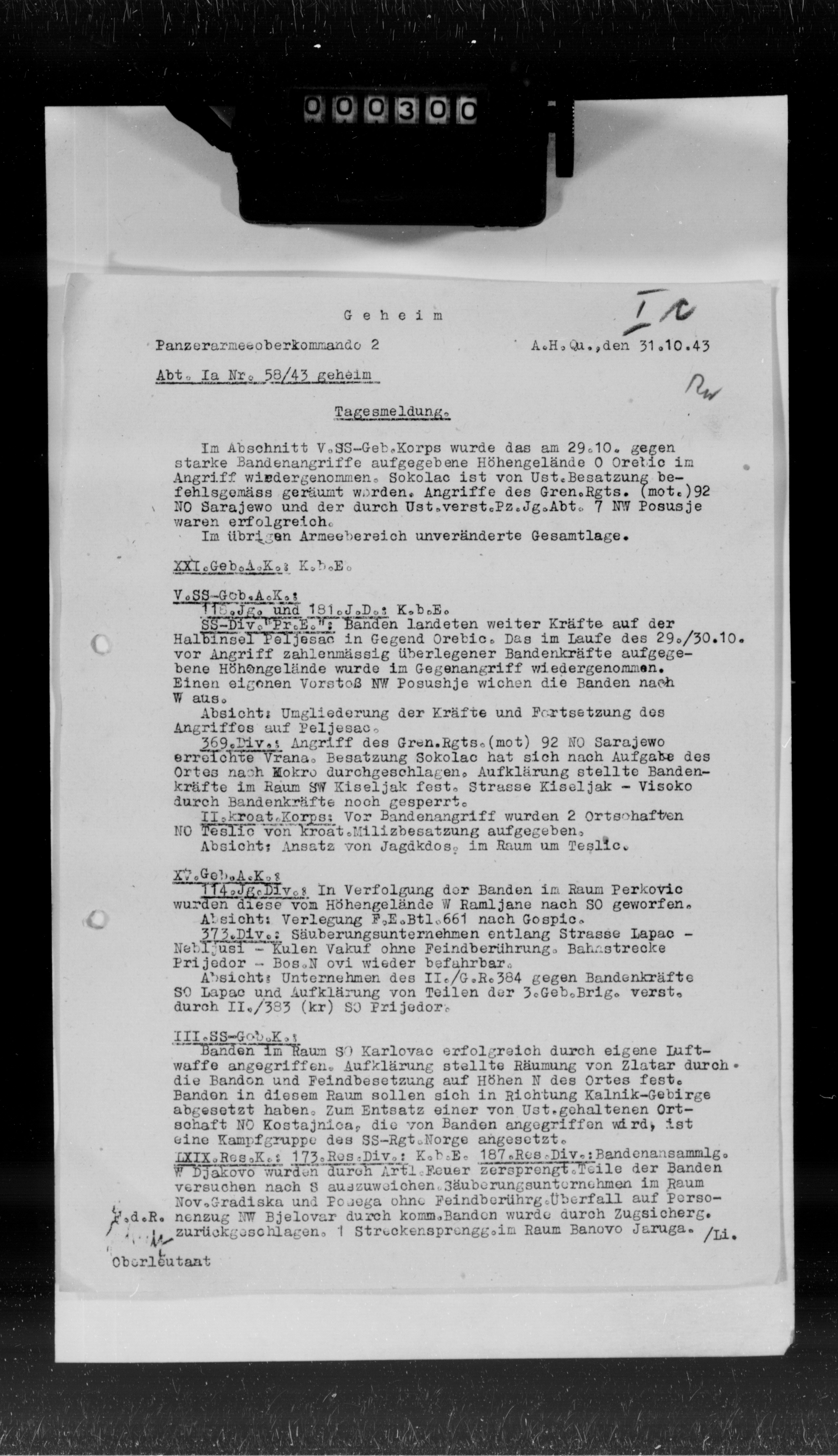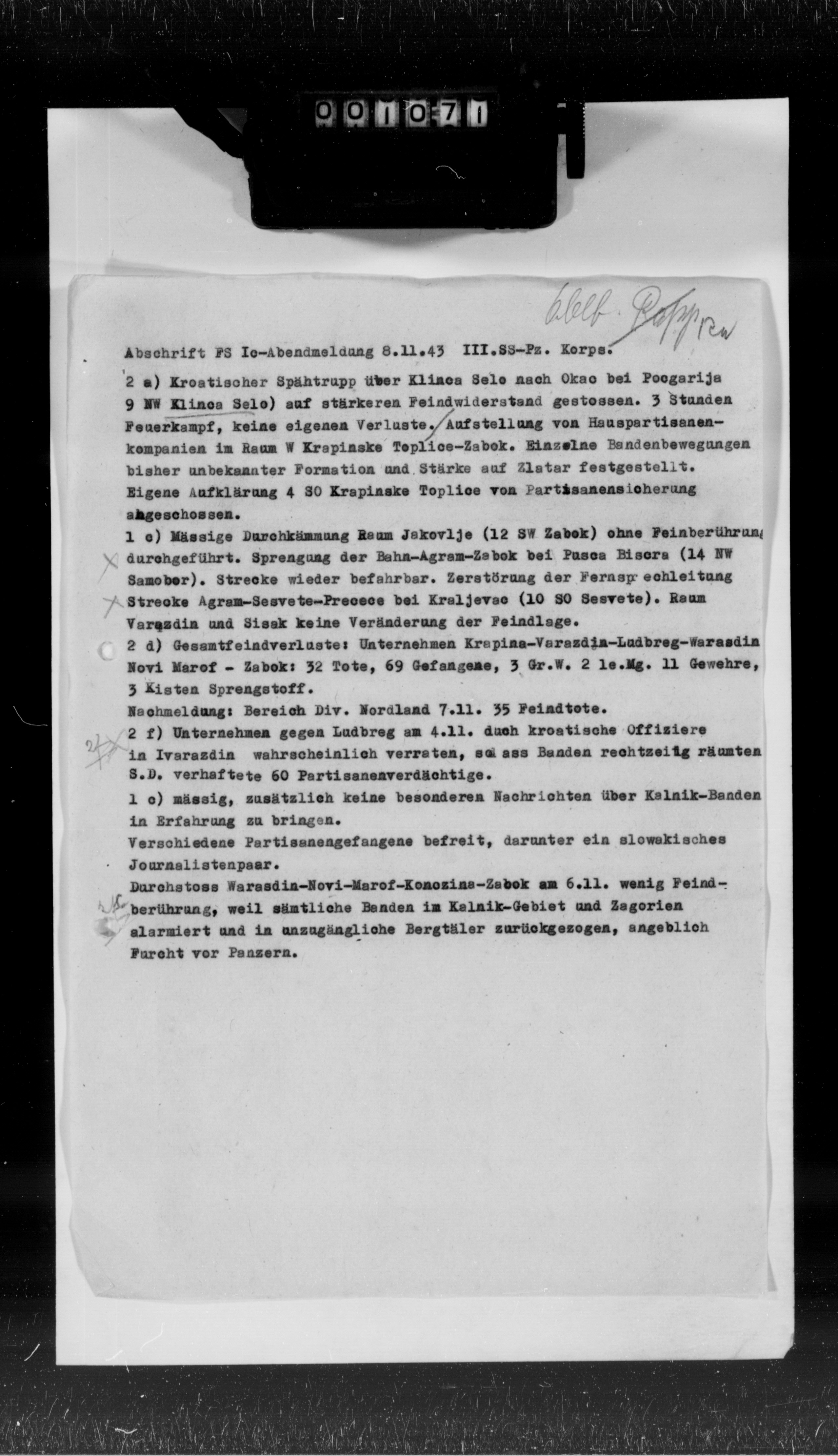 - Ic Abendmeldung, 10.11.43 - Večernji izveštaj obaveštajnog odeljenja komande, 10.11.43: Potvrđeni sukobi između srpskih i hrvatskih komunista kod Zvečeva (23 i-j-i. od Daruvara)... Hrvatske trupe koje su nastupale iz Varaždina u cilju rasterećenja Koprivnice zaustavljene z. od Ludbrega, izgleda zbog jakog otpora komunista... U Bosni snažan otpor komunista našem poduhvatu j. od Brčkog... Prema sigurnom izvoru, četnička srebrenička brigada razbijena od komunista kod Žlijeba (10 s. od Višegrada). Visoki gubici 6. bosanske brigade (17. divizija) u borbi sa našim snagama s. od Mokrog... Na Pelješcu nastavljene teške borbe... (frame no. 657)