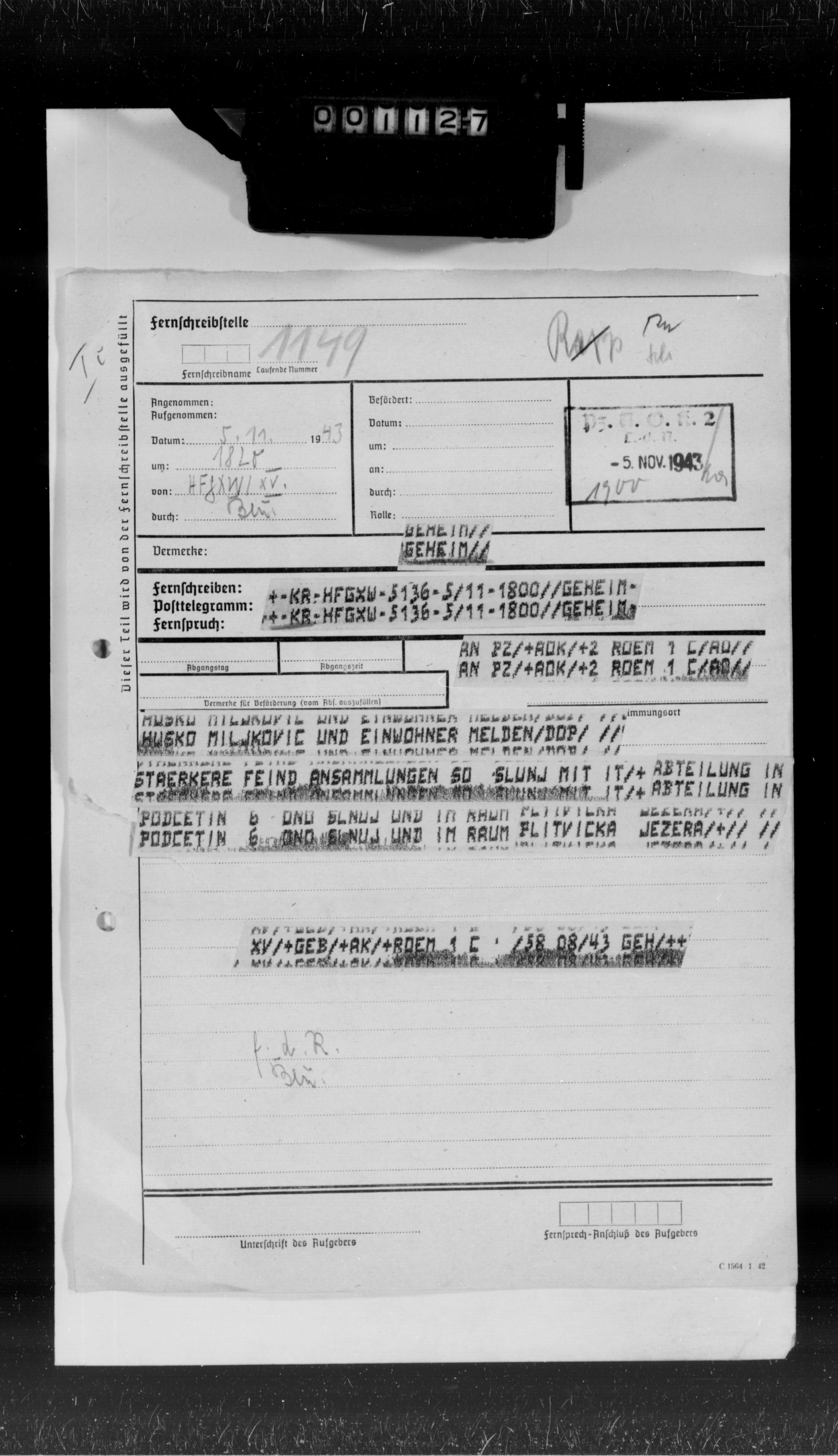 - Ic Abendmeldung, 9.11.43 - Večernji izveštaj obaveštajnog odeljenja komande, 9.11.43: U Bosni komunisti našim napadom izbačeni iz mesta 10 j. od Brčkog. Napad komunističke bande (11. divizija) na železnicu kod Dervente. Goražde zauzeto od komunista... Nastavljene teške borbe na Pelješcu... Četnička jedinica Dinara izbačena iz Vrlike od jake komunističke bande (8. dalmat. brigada 20. divizije)... Prema sigurnom izvoru jaka komunistička jedinica (6. divizija, 3 brigade, 3.500 ljudi) 8.11. krenula na marš u istočnu Bosnu (frame no. 663)