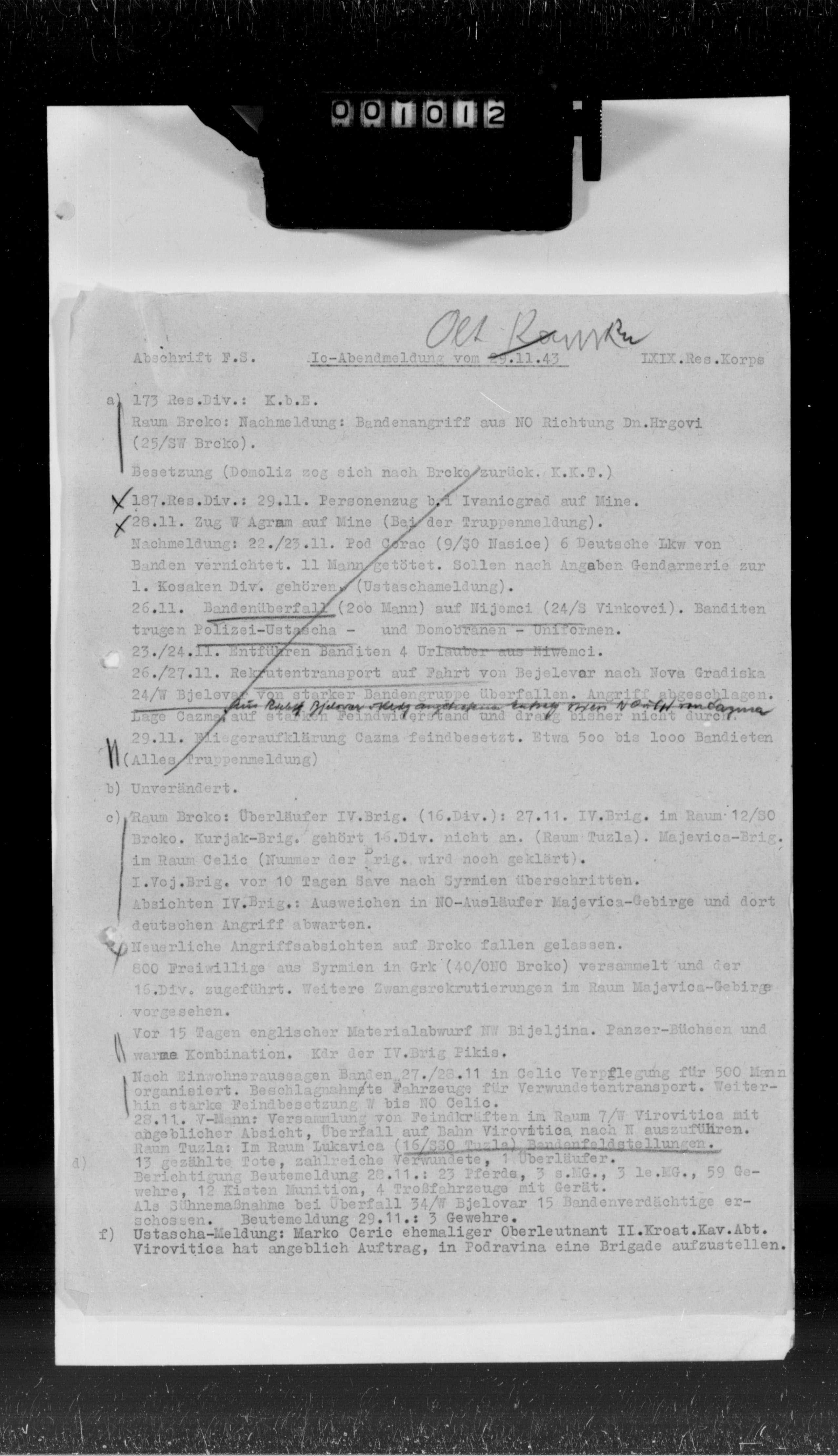 - Dnevni izveštaj 69. rezervnog korpusa od 17.11.43. 187. rezervna divizija: Sopstveni gubici u Virovitici: Nemci: 13 KIA, 9 WIA, 20 MIA. Hrvati: 3 KIA, 12 WIA, 39 MIA. 3 mrtva Folksdojčera... Borba hrvatskog 8. brdskog puka kod Grubišnog polja, Mrsovića, Orahovice, Drenjskog Slatinika... 6 j-z. od Broda napadnuta i delom zarobljena žandarmerijska patrola... Kdt 2. diviziona kozačkog artiljerijskog puka teško ranjen (frame no. 317)