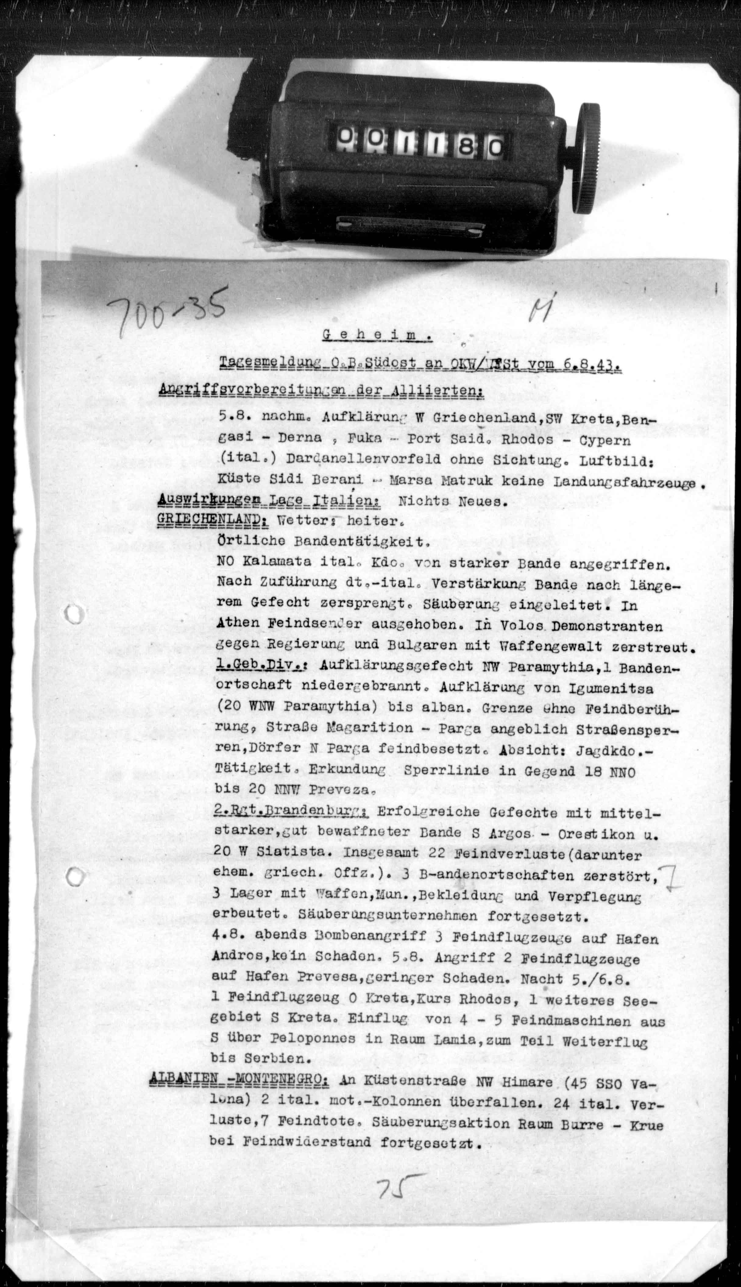 H.Gr. E 65025 - Tagesmeldungen H. Gr. E - Ia/01 - Daily Report of Army Group E. - Operations Officer. Daily reports of Commander in Chief of South-East -operation officer to High Command of the Armed Forces/ Armed Forces Operations Staff concerning daily military activities in the Croatian, Serbian and Greek areas., May 01, 1943 - December 31, 1943