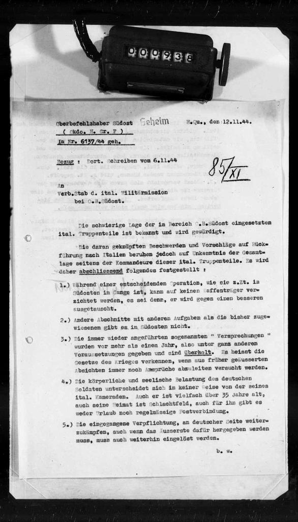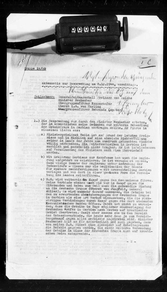 - 7: Zabilješka sa razgovora glavnkomandujućeg Jugoistoka i izaslanika Neubachera od 26. novembra 1944 (27. novembar 1944.).