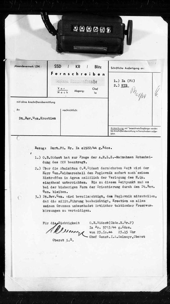 - 40: Zabilješka o putovanju šefa obavještajnog odjeljenja u Zagreb 13. oktobra 1944 i razgovorima sa ambasadorom Kascheom i predstavnicima ureda njemačkog opunomoćenog generala (14. oktobar 1944.).