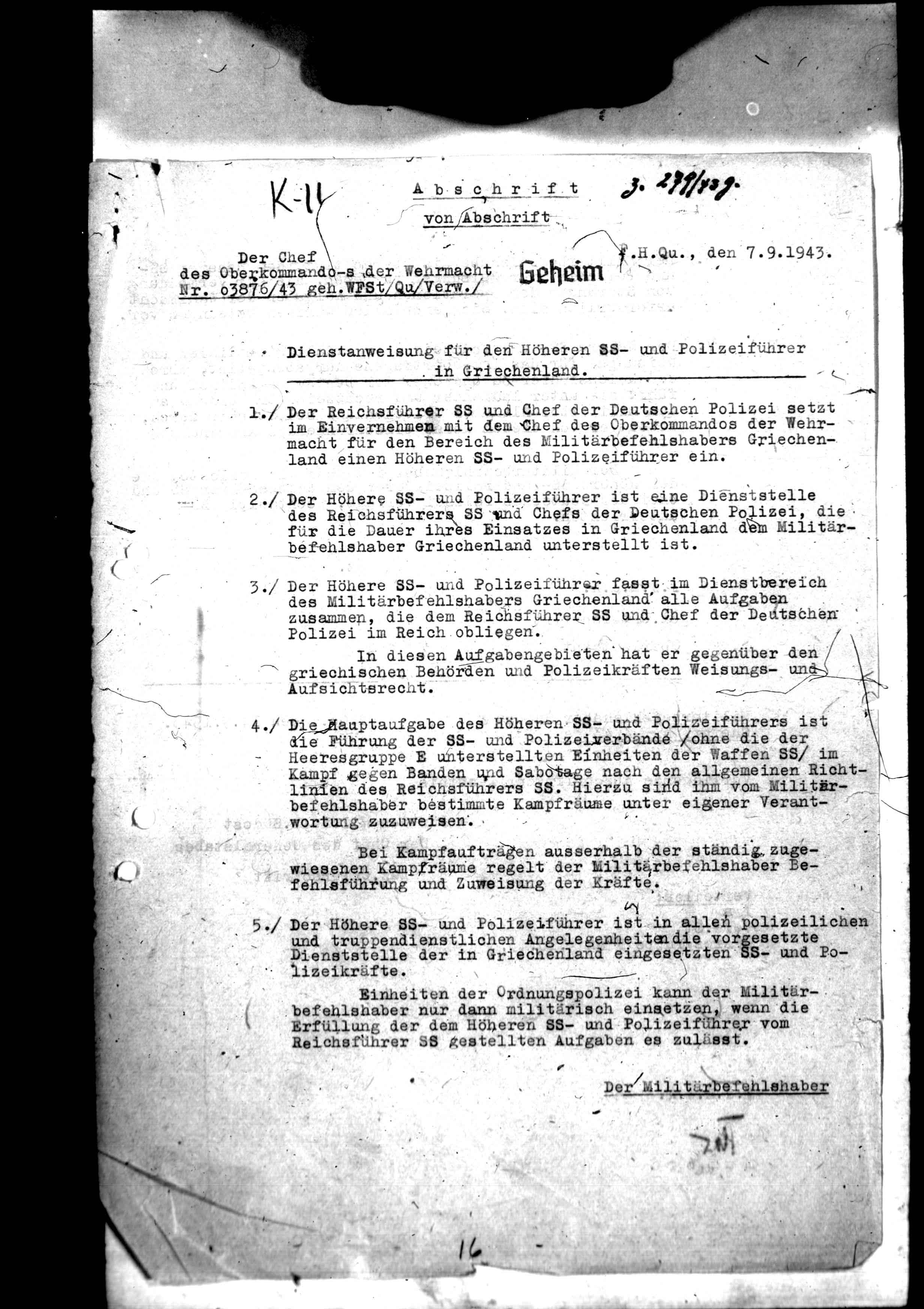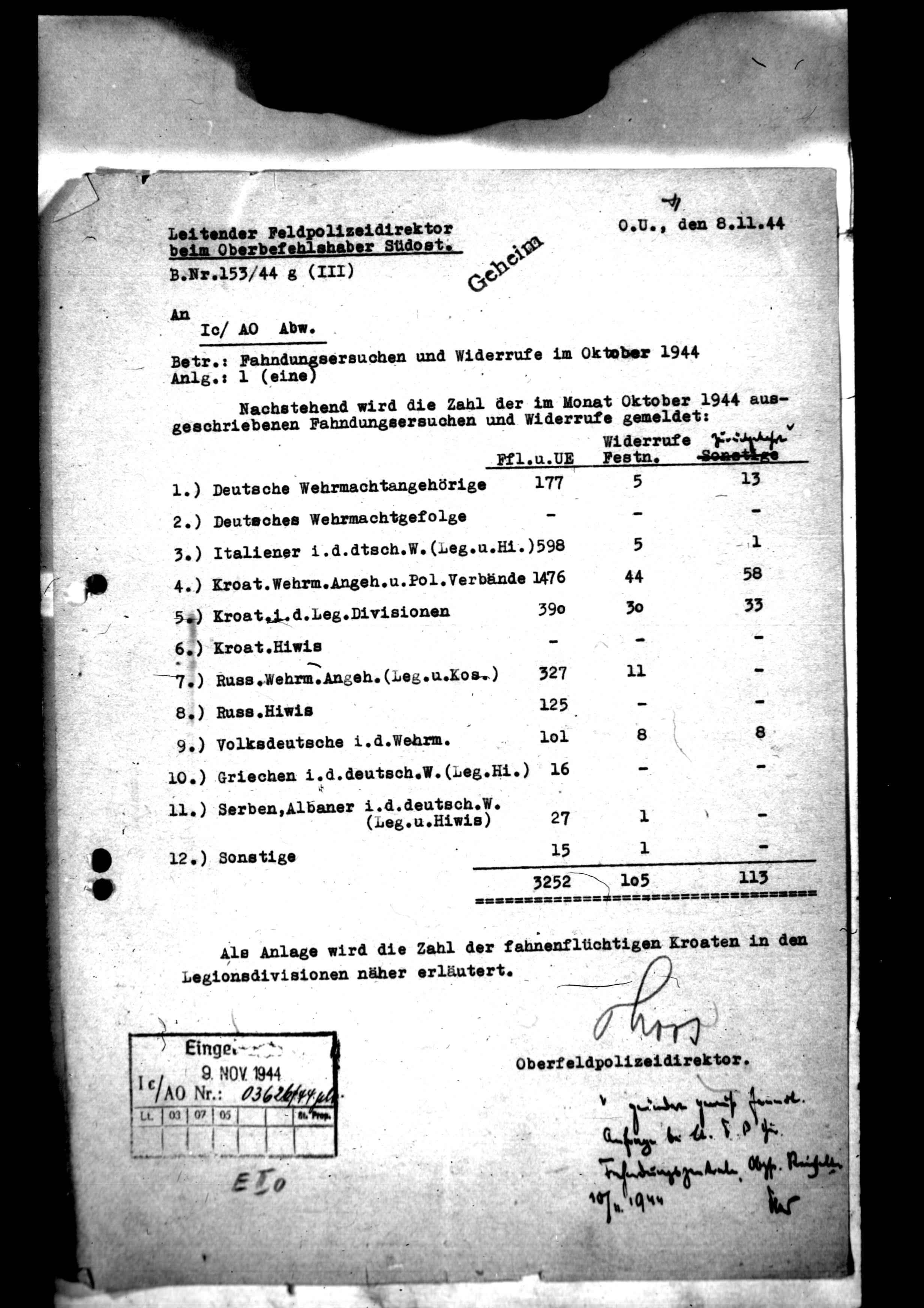 65569 Ic/A.O., Anlagenband z. KTB des OB Südost. - Ic/A.O., Anlagenband z. KTB des OB Südost. Reports and correspondence concerning courtmartial proceedings against a Croatian Army captain for giving defense plans for the city of Agram to partisans; reports on Croatians and others serving in the German Army who have deserted; reports of attempts by the Greek partisans to lure German personnel to desert; reports on the political situation in Salonika; and charts showing the utilization of carrier pigeons in Crete and other areas in southeast Europe., April 14, 1944 - December 31, 1944