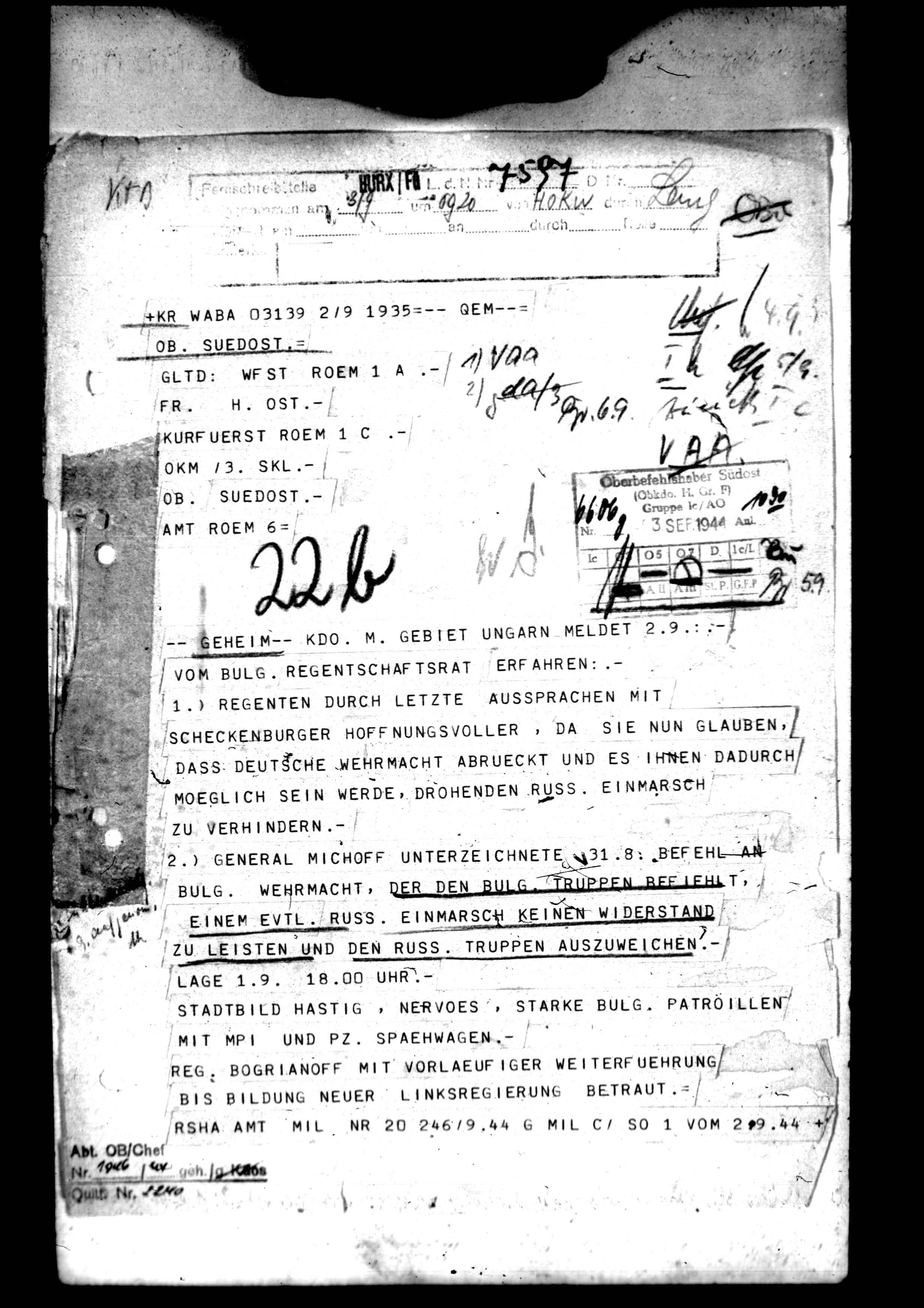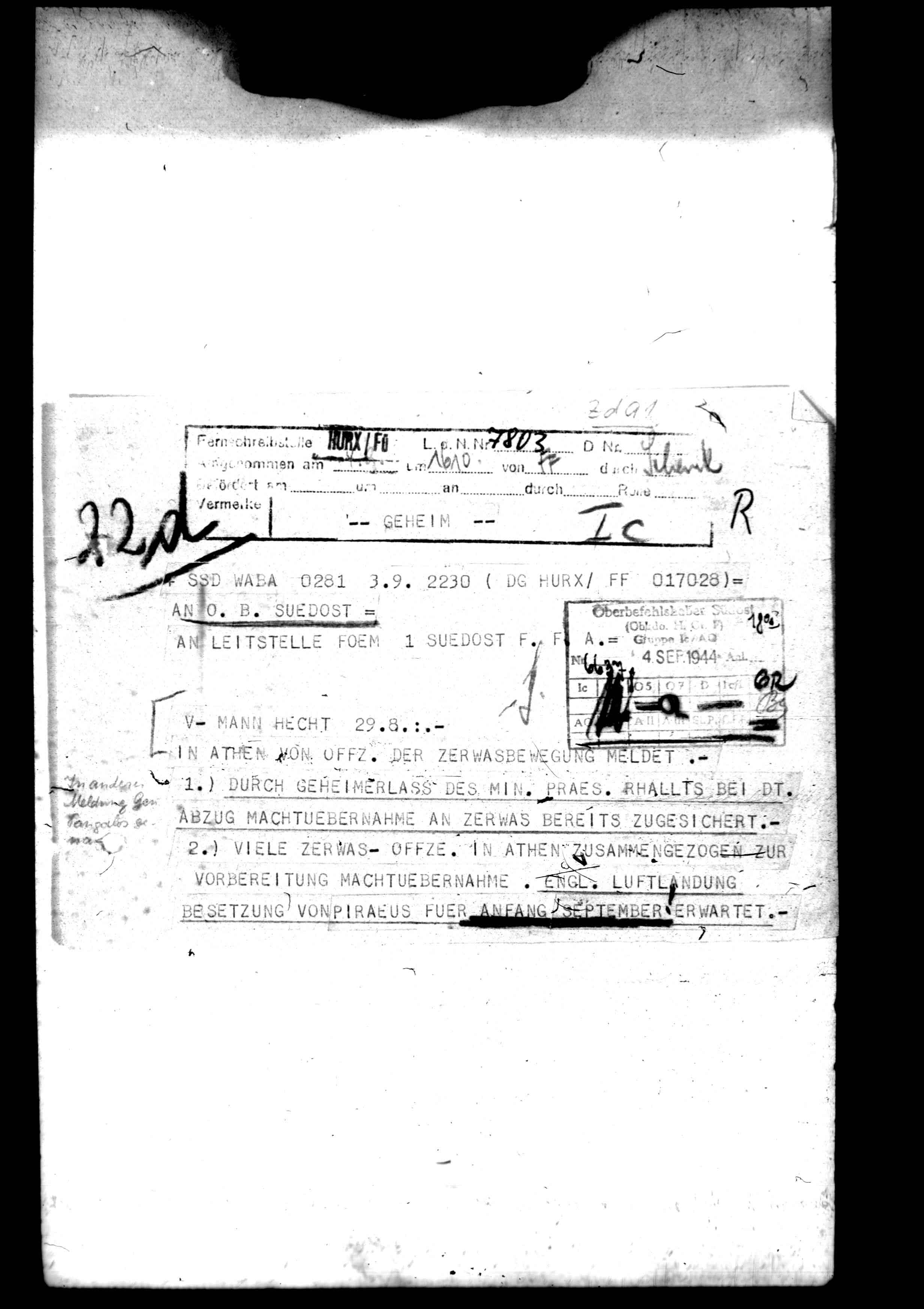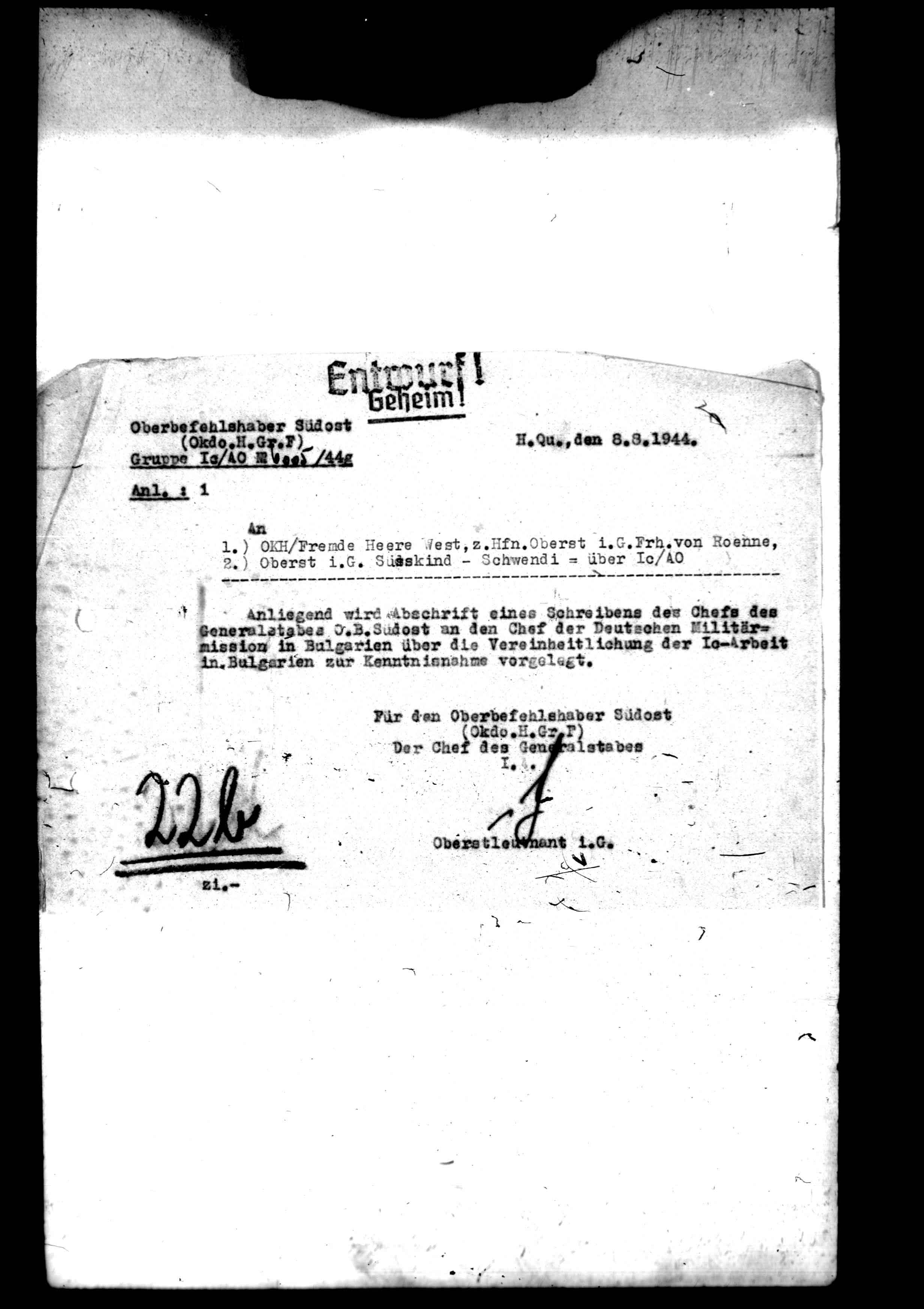 66142 Ic/A.O., Anlagenband - Chefsachen. - Reports on negotiation offer of the English Mission with Zervas concerning the capitulation of German troops in Greece. Directives to the Croatian Minister of Foreign Affairs regarding organization of anti-Communist organizations. Notes on the inspection trip of Lt. Gen. Foertsch in Hofia. Reports on Communist led guerrilla forces in Greece; activities of Zervas; Turkey*s possible participation in the war on the side of the Allies; possibility of Bulgaria going over to the Allied side; and Russian movements toward Hungary., February 10, 1944 - November 04, 1944