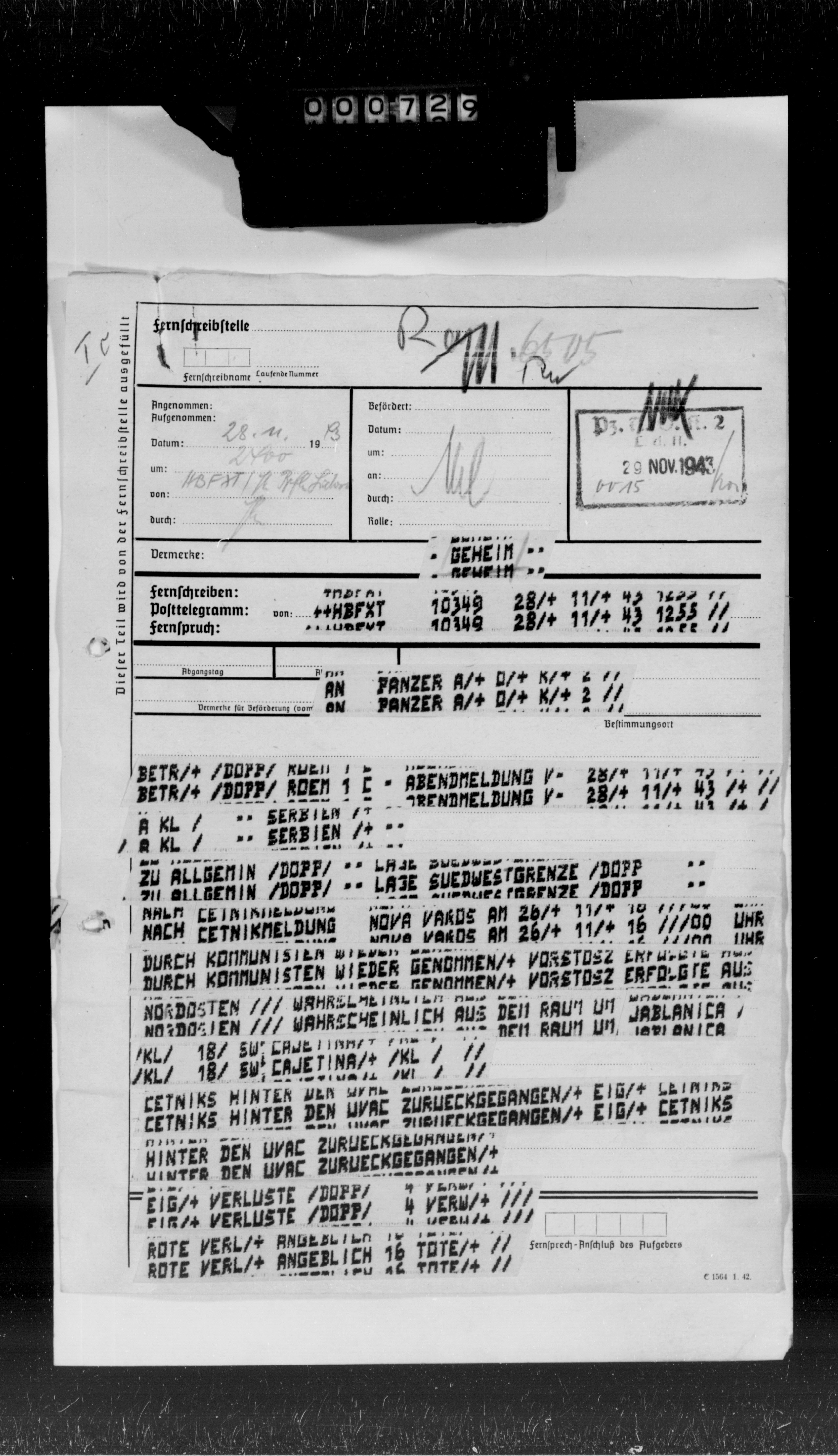- Abendmeldung vom 14.11.1943: 13.11. Sondernbeauftragter des D.M. ? Gebietskommandanten major Lukacevic an Wehrmacht herangetreten mit dem Vorschlag, Waffenruhe in dem Raum Bajina Basta, die Drina Entlang bis Foca nach S bis Niksic, in gerade Linie bis Boka Kotorska, alte Alban. Grenze nach Skutari, in gerader Linie nach Pec, Kos. Mitrovica, Ibar-Tal bis Kraljevo, Westl. Morava Entlang über Cacak ? Pozega ? Uzice nach Bajina Basta eintreten zu lassen. Als Zeitpunkt wird 16.11. ab 0800 Uhr vorgeschlagen. Begründung: gemeinsam zu führender Kampf gegen Kommunisten