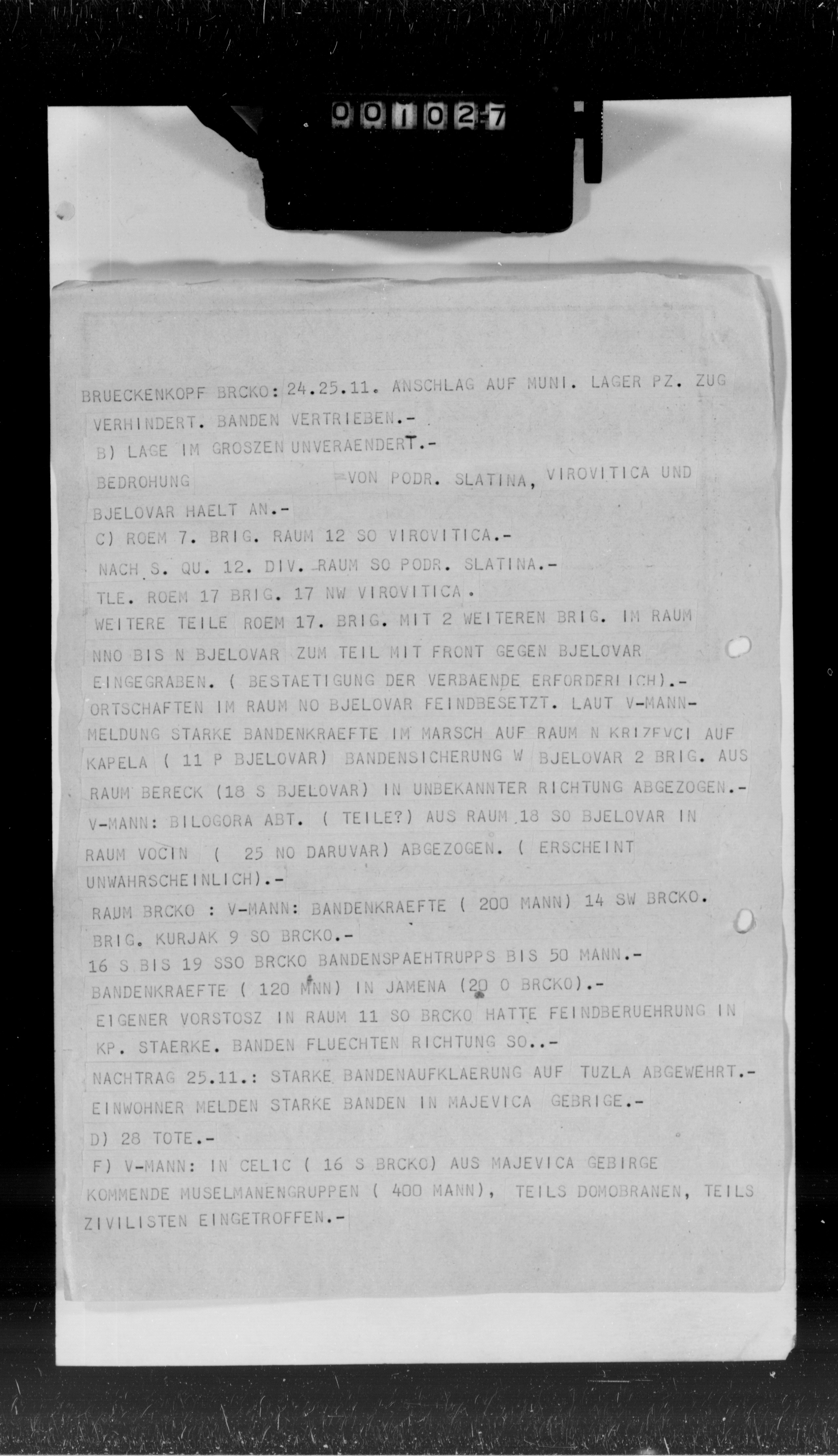 - Dnevni izveštaj 69. rezervnog korpusa od 17.11.43. 187. rezervna divizija: Sopstveni gubici u Virovitici: Nemci: 13 KIA, 9 WIA, 20 MIA. Hrvati: 3 KIA, 12 WIA, 39 MIA. 3 mrtva Folksdojčera... Borba hrvatskog 8. brdskog puka kod Grubišnog polja, Mrsovića, Orahovice, Drenjskog Slatinika... 6 j-z. od Broda napadnuta i delom zarobljena žandarmerijska patrola... Kdt 2. diviziona kozačkog artiljerijskog puka teško ranjen (frame no. 317)