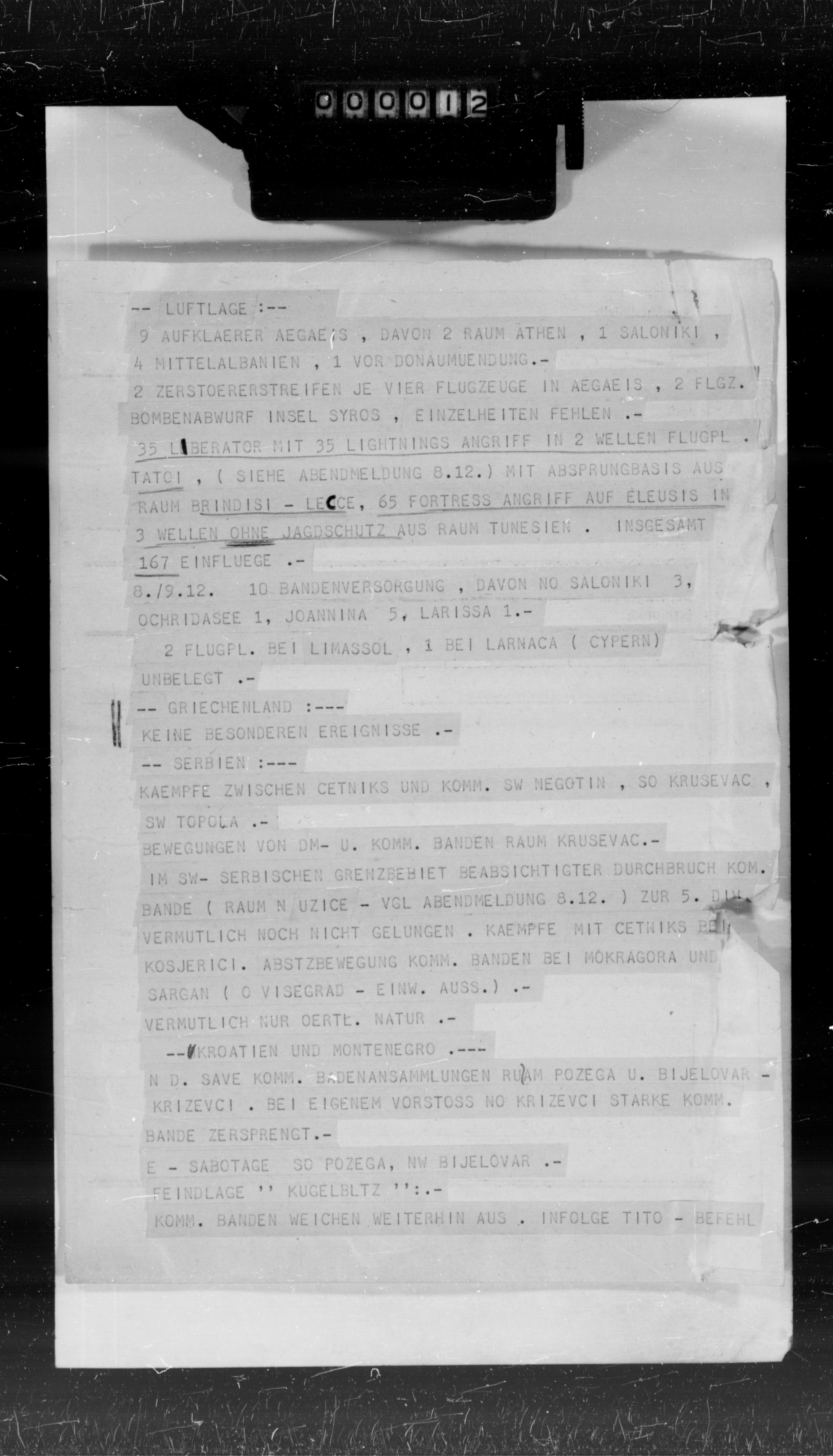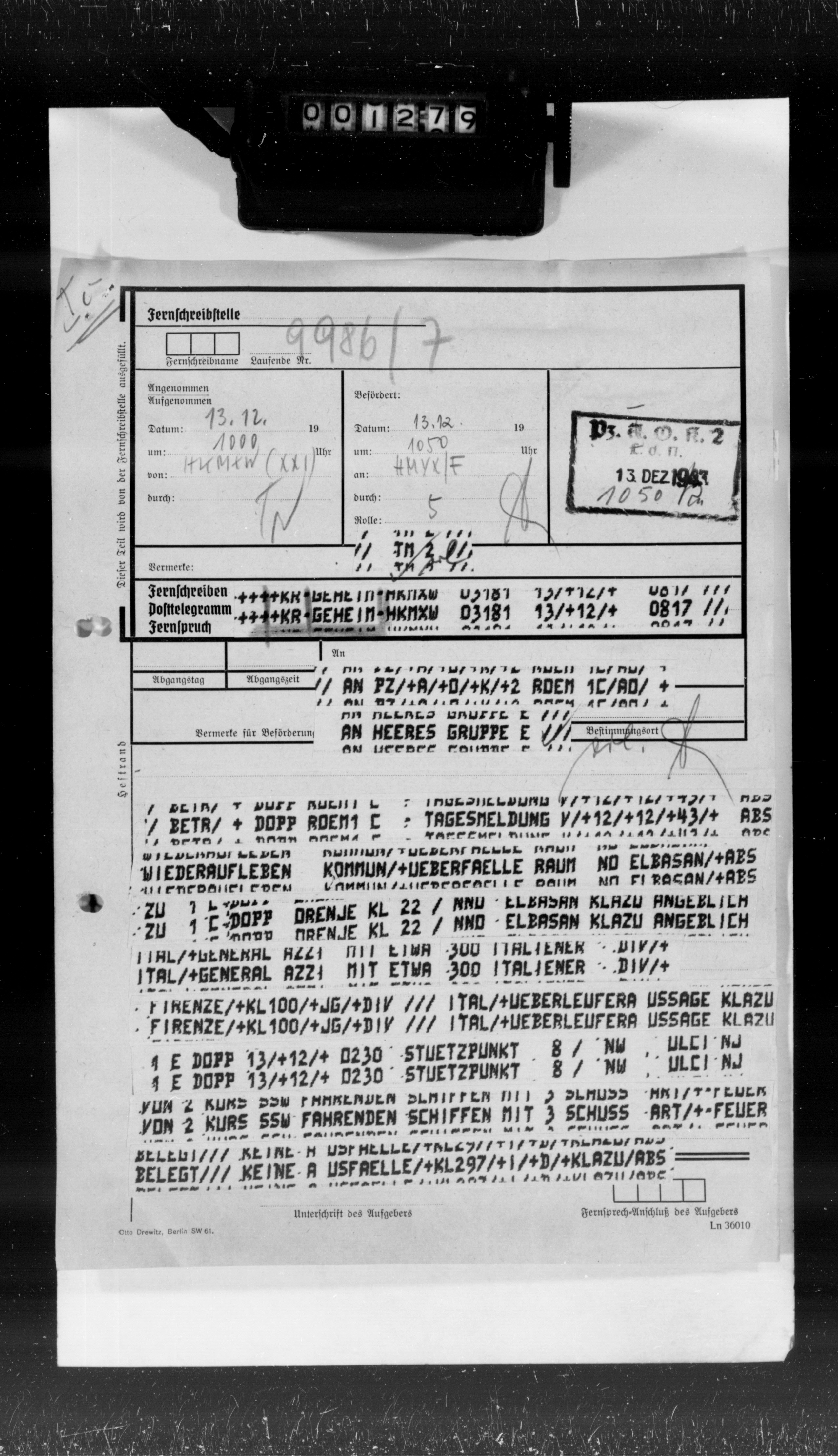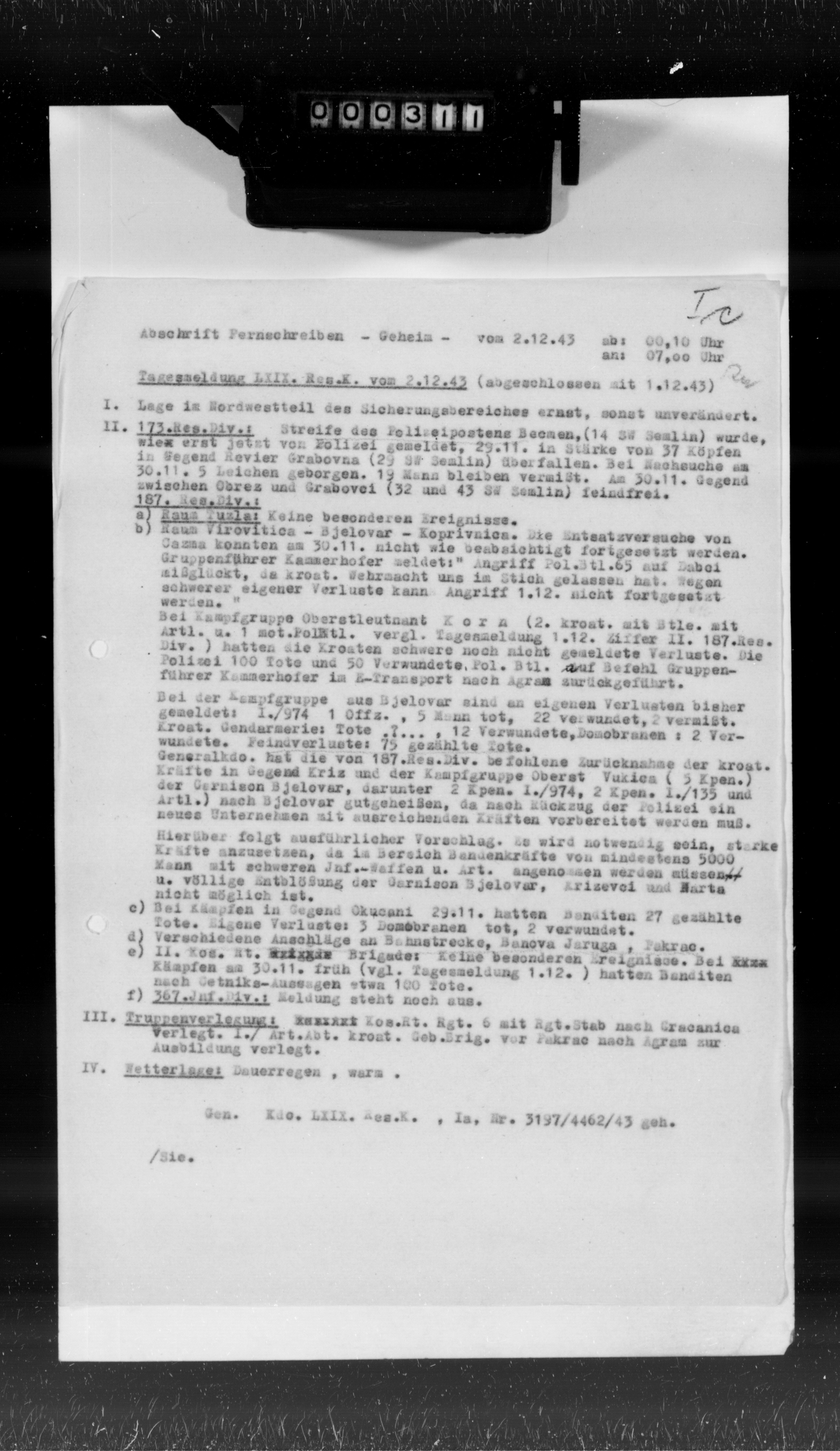 Pz AOK 2 43407/53, Ic, Anlagenband 11 zum Tätigkeitsbericht - Radio messages and daily reports relating to combat situation, enemy activities and partisan warfare, December 11, 1943 - December 20, 1943