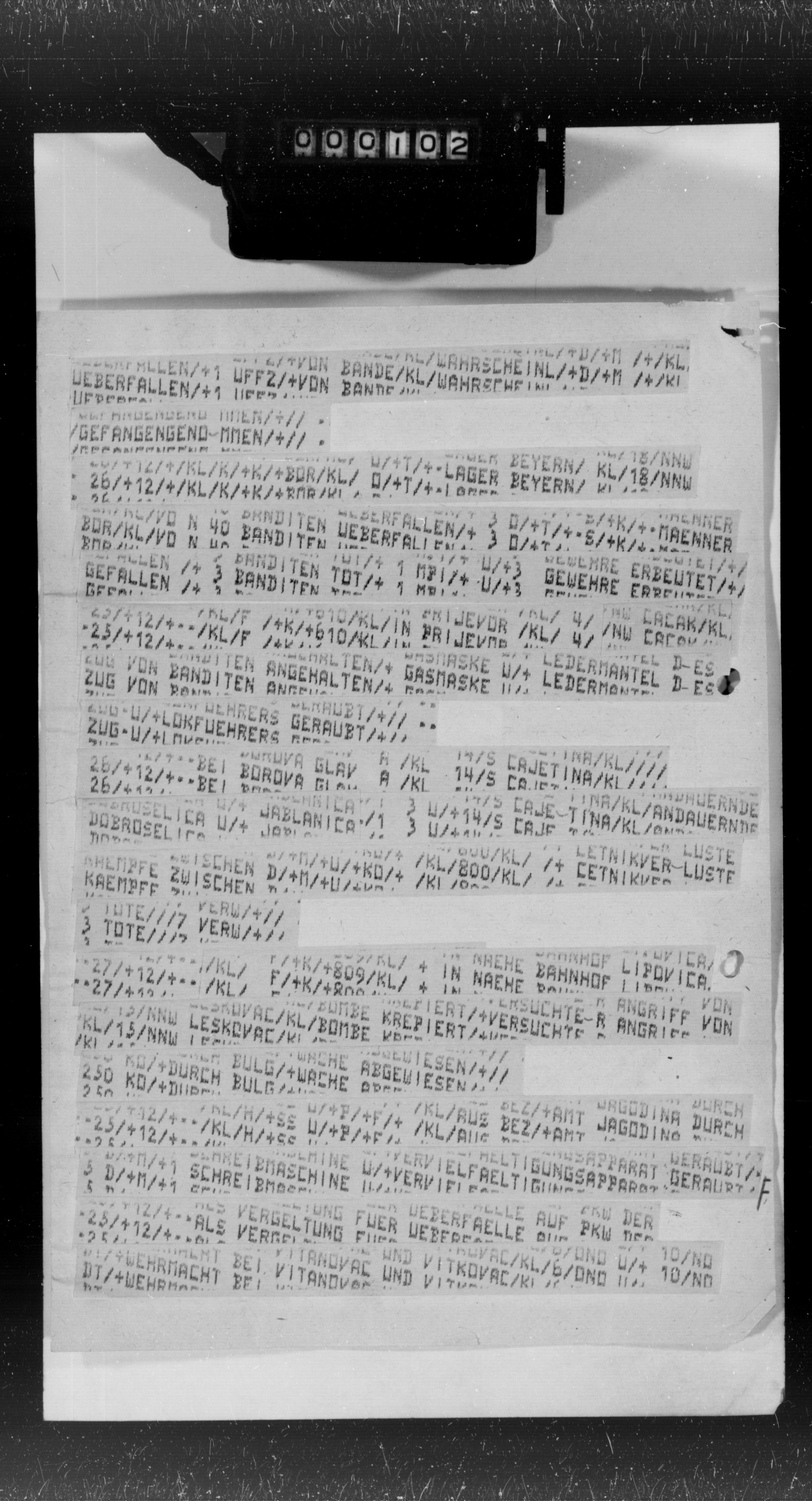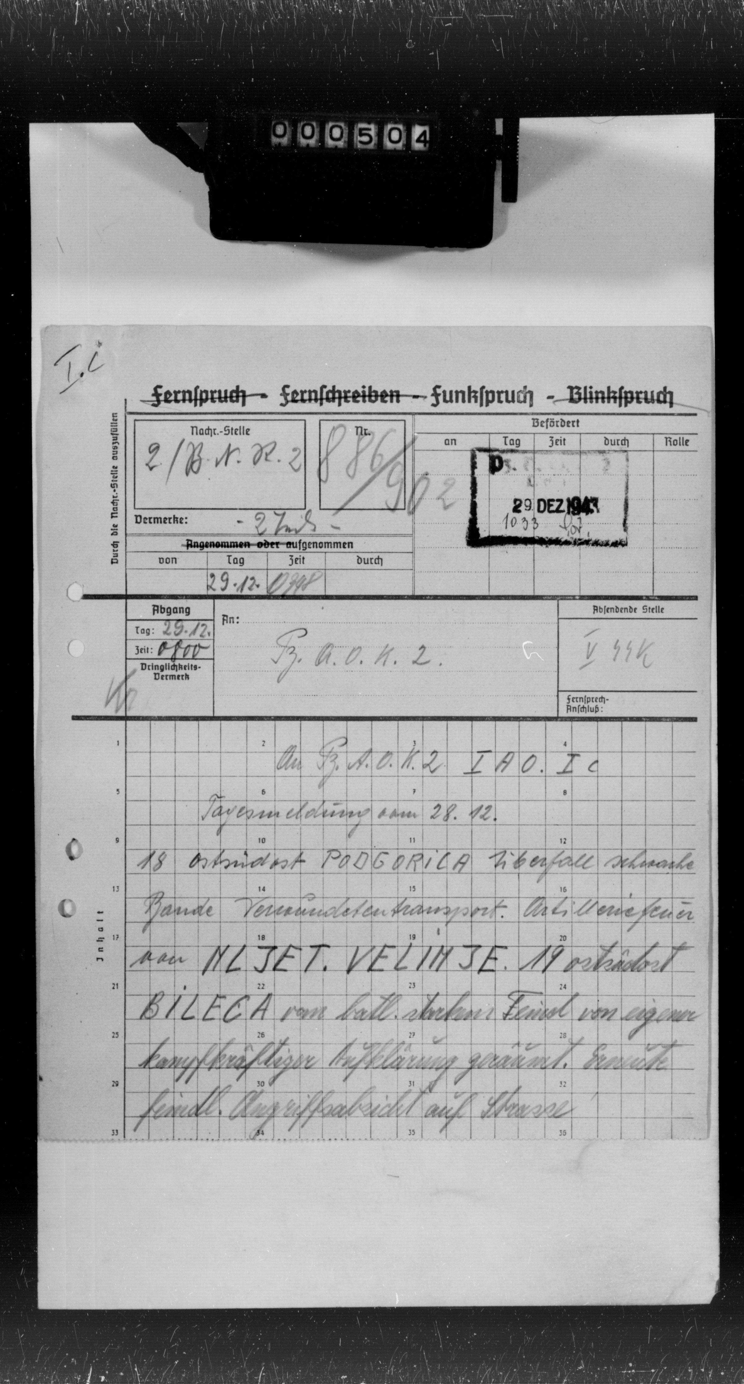 Pz AOK 2 43407/56, Ic, Anlagenband 14 zum Tätigkeitsbericht - Radio messages relating to activities of Tito's and other enemy units, disarming of Italian units, and correspondence on the persecution of Moslems by Chetniks, October 15, 1943 - November 30, 1943