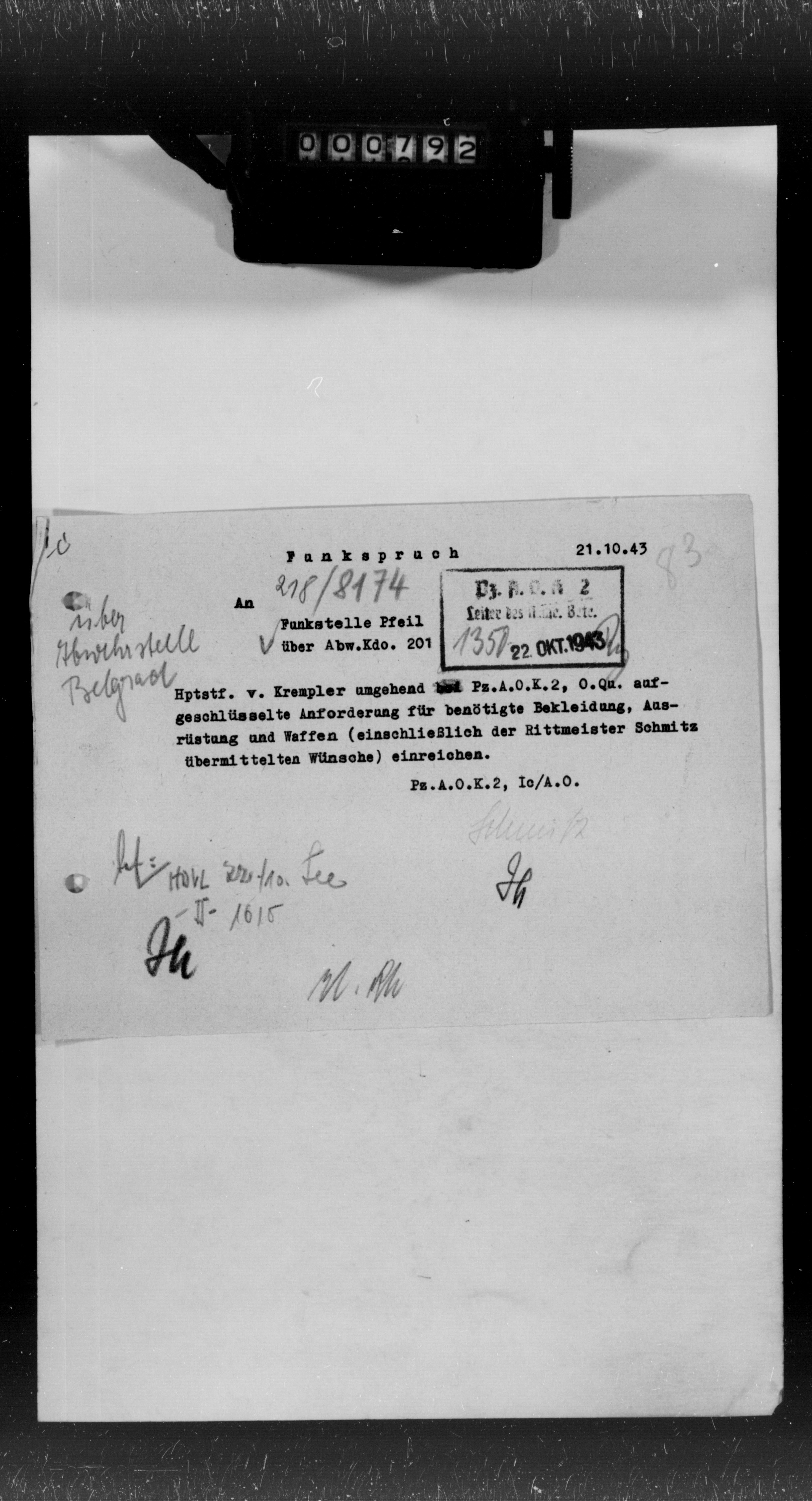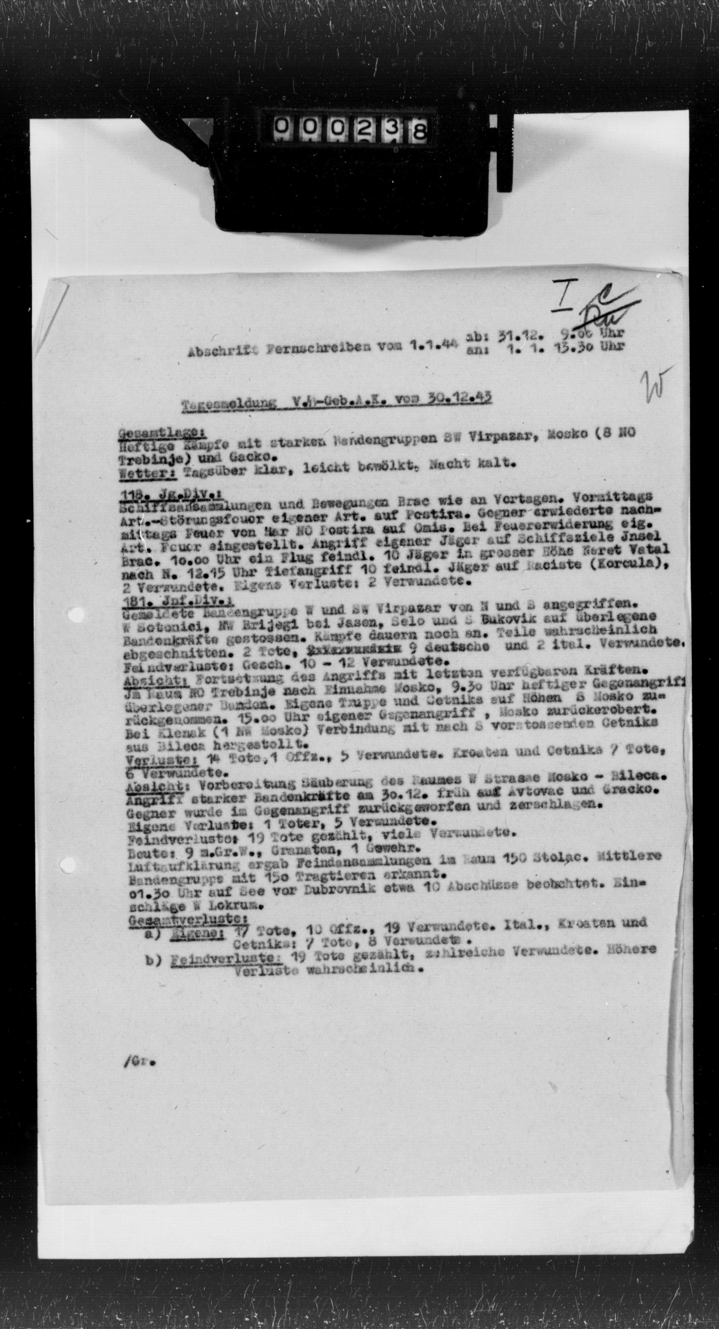 Pz AOK 2 43407/54, Ic, Anlagenband 12 zum Tätigkeitsbericht - Radio messages and daily reports relating to combat situation, enemy activities and partisan warfare, December 21, 1943 - December 31, 1943