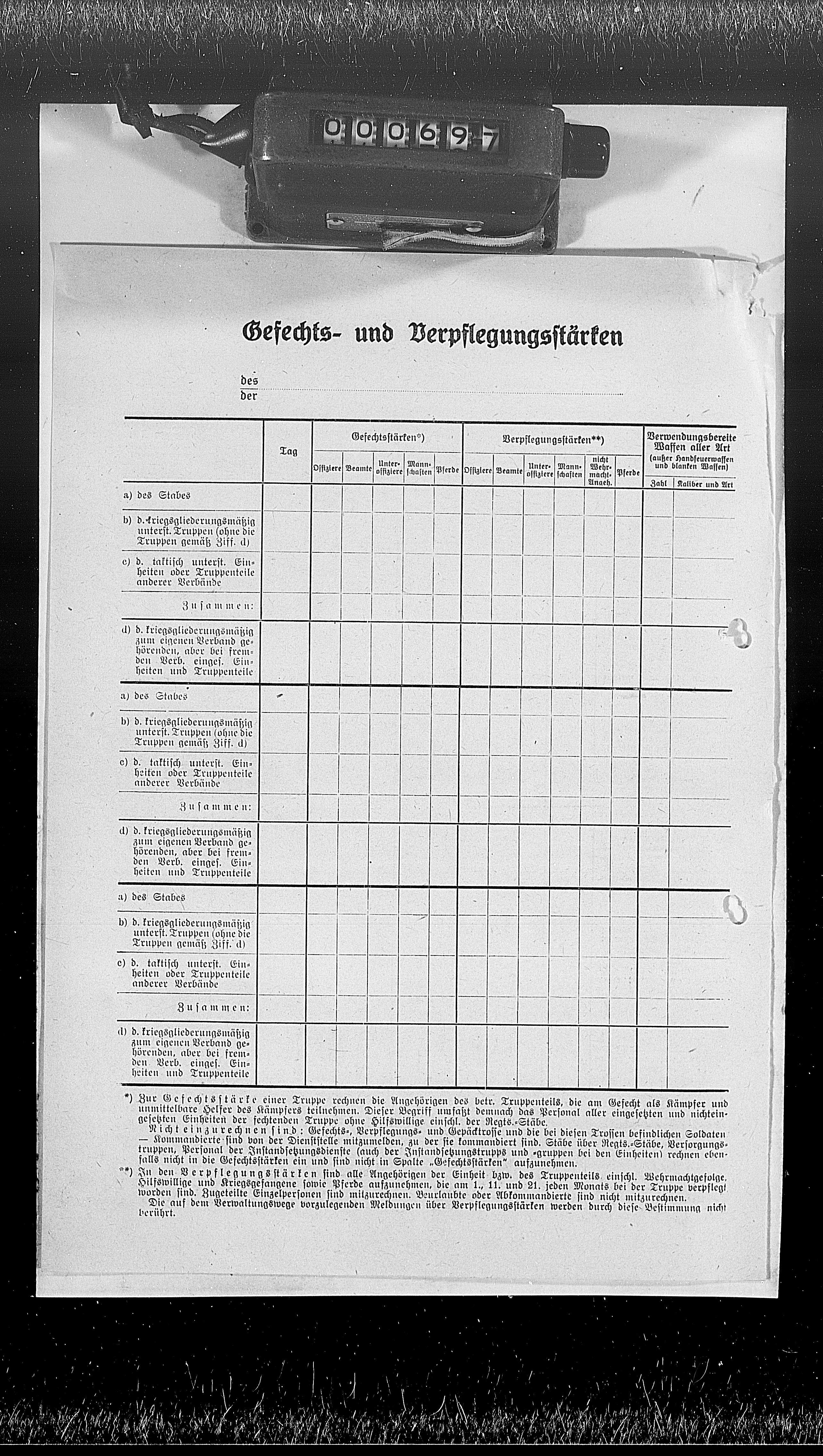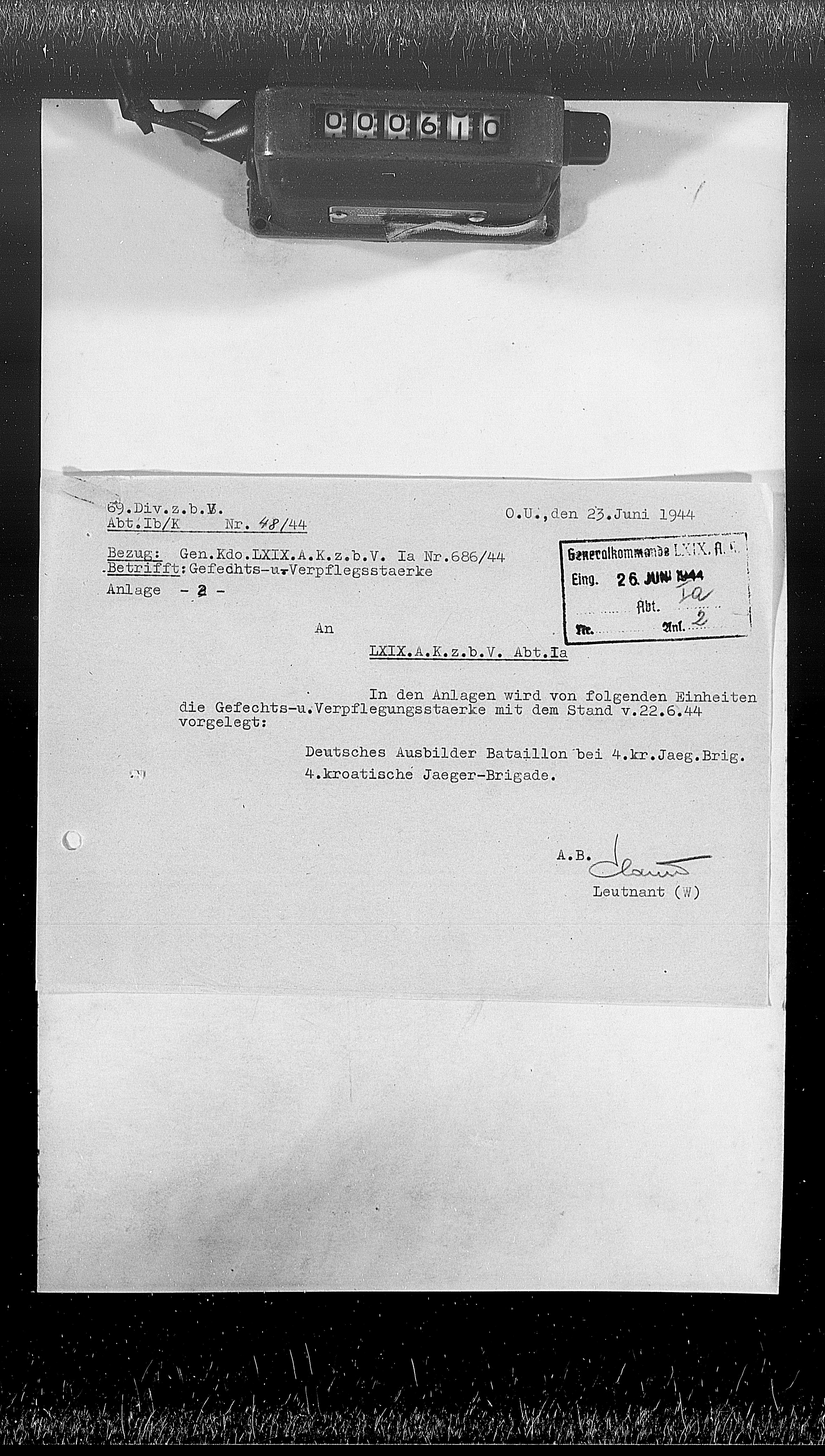 la, Anlagenband z. KTB 2, Gefechts- u. Verpflegungsstarken. 1944-06-30 - Daily tables showing the combat and ration strength and arms of the Corps* units., January 01, 1944 - June 30, 1944