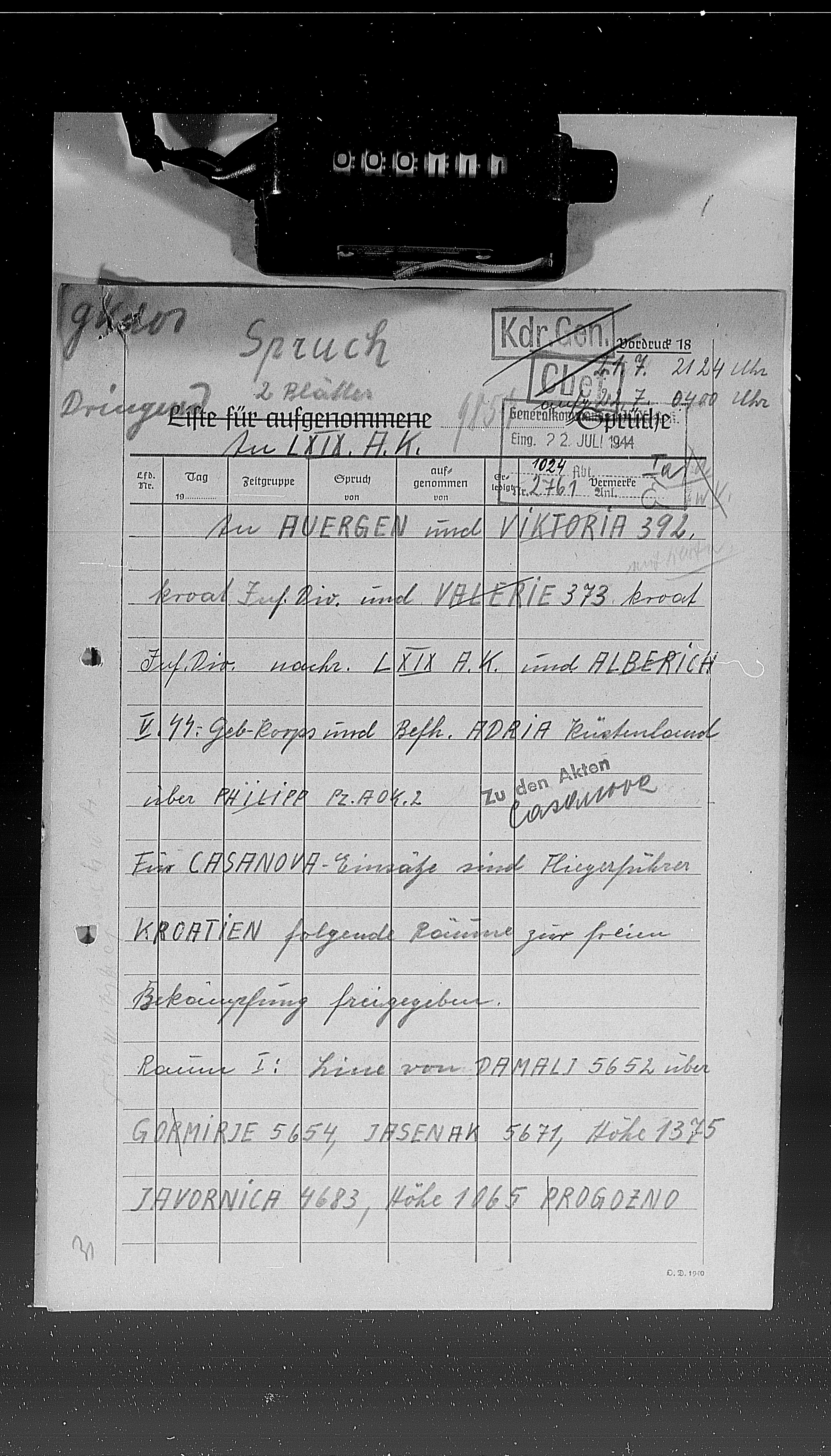 - -Casanova- - operacija za skretanje savez. snabdijevanja na osovinsku teritoriju putem lažnih svjetlosnih signala; izvođenje na cjelokupnoj teritoriji pod kontrolom PzAOK 2 (frame no. 134)
